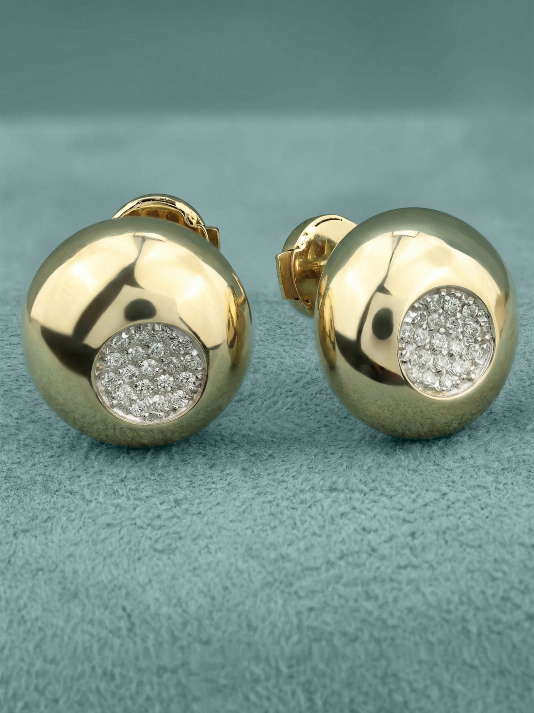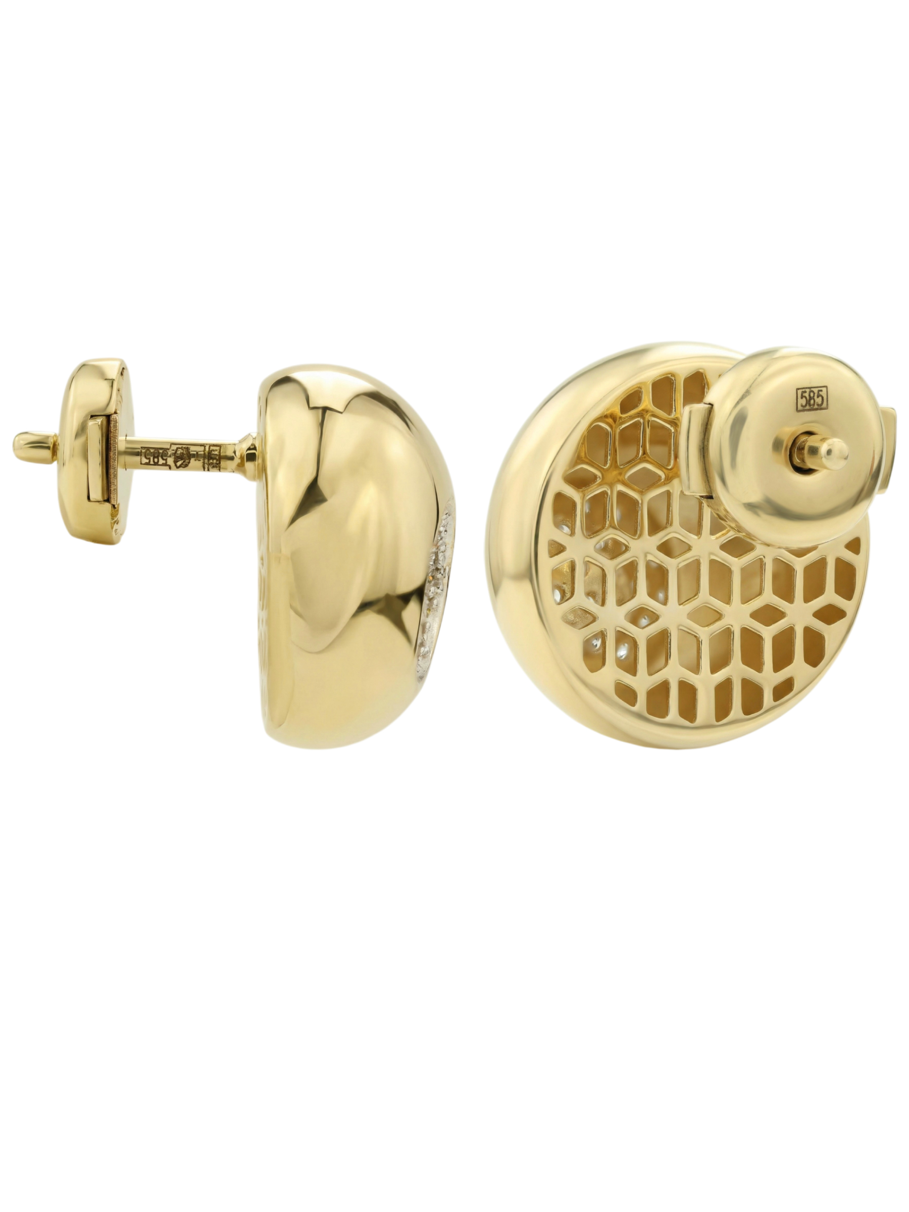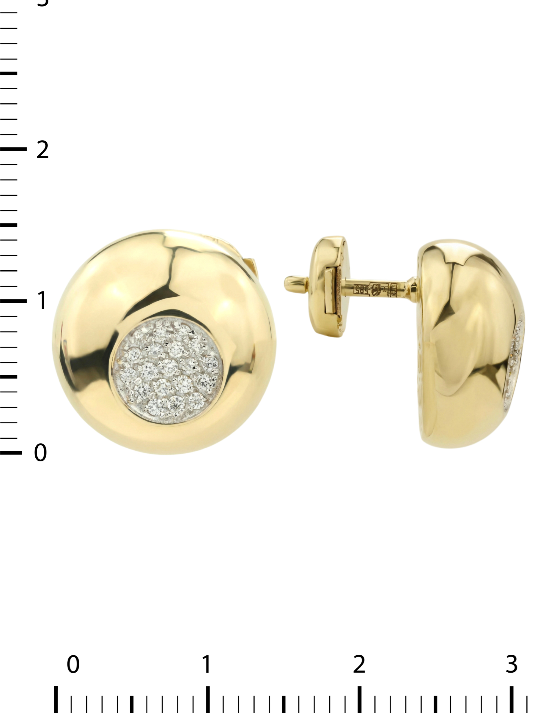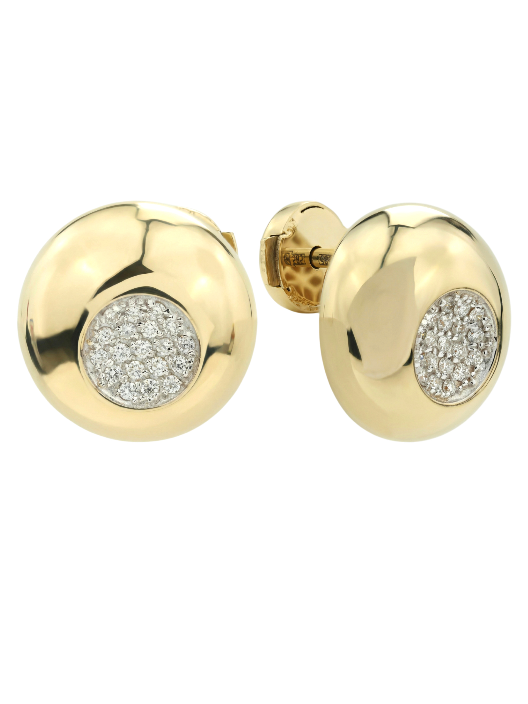 Главным акцентом украшения стала инкрустация белыми бриллиантами круглой формы. Всего в изделии использовано 38 камней, которые плотно расположены в центре каждой серьги, создавая эффект яркого, искрящегося сияния. Контраст теплого золотого оттенка и холодного блеска драгоценных камней придает украшению завершенный и статусный вид.