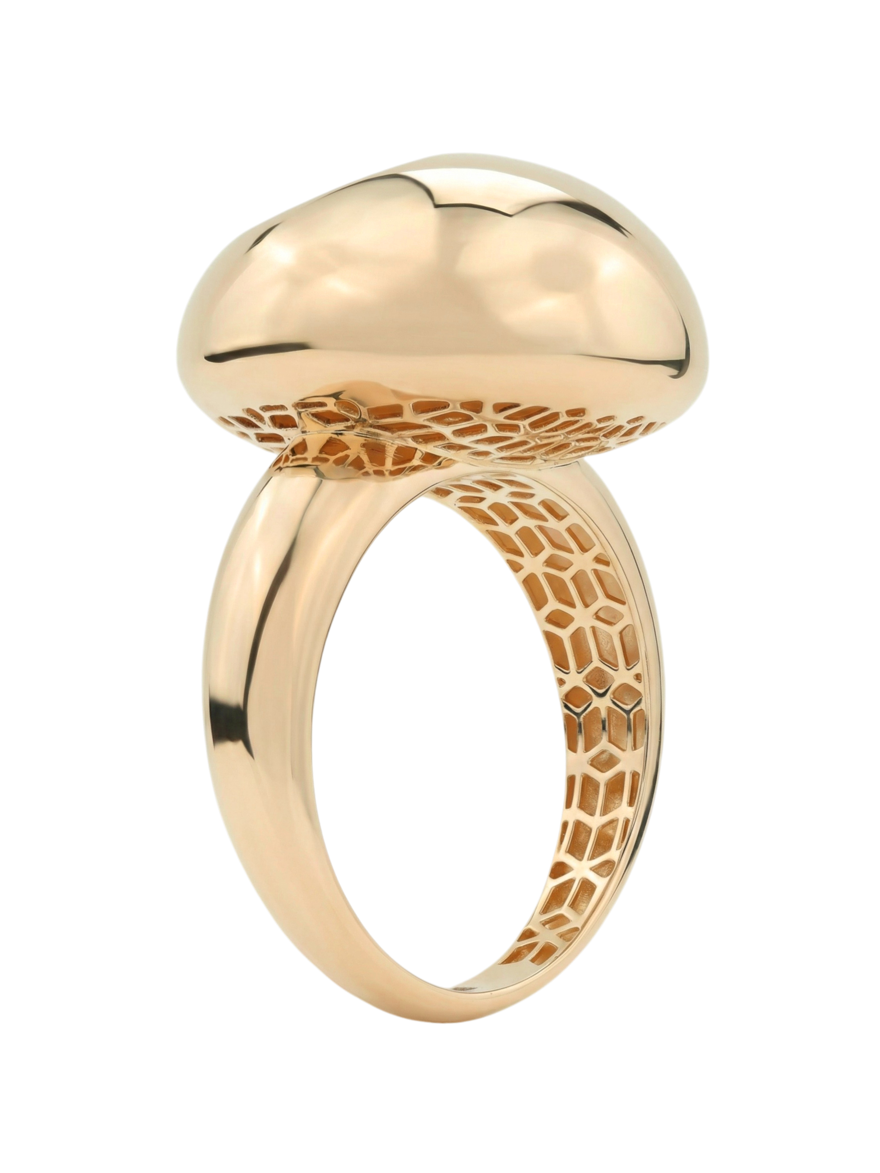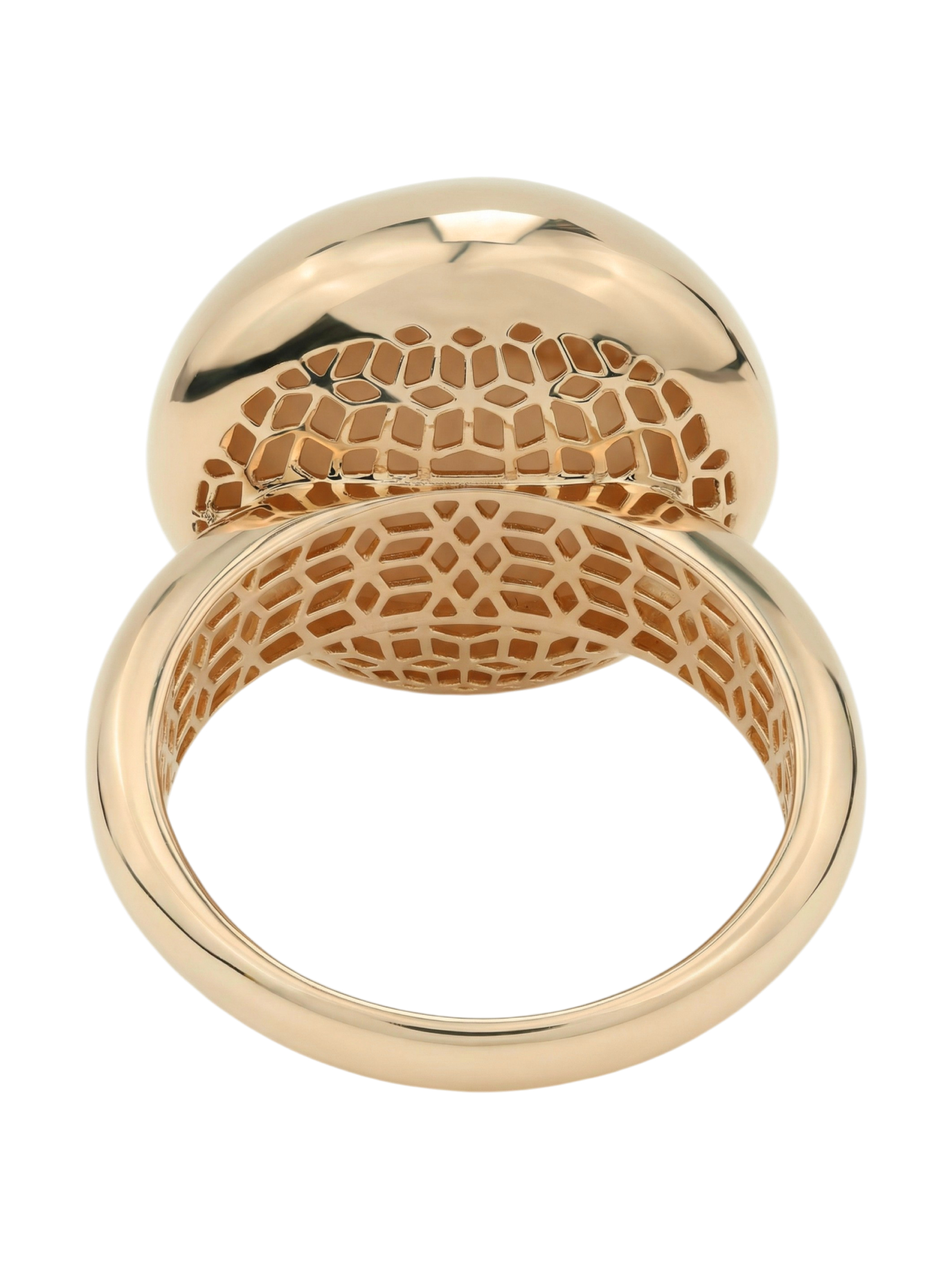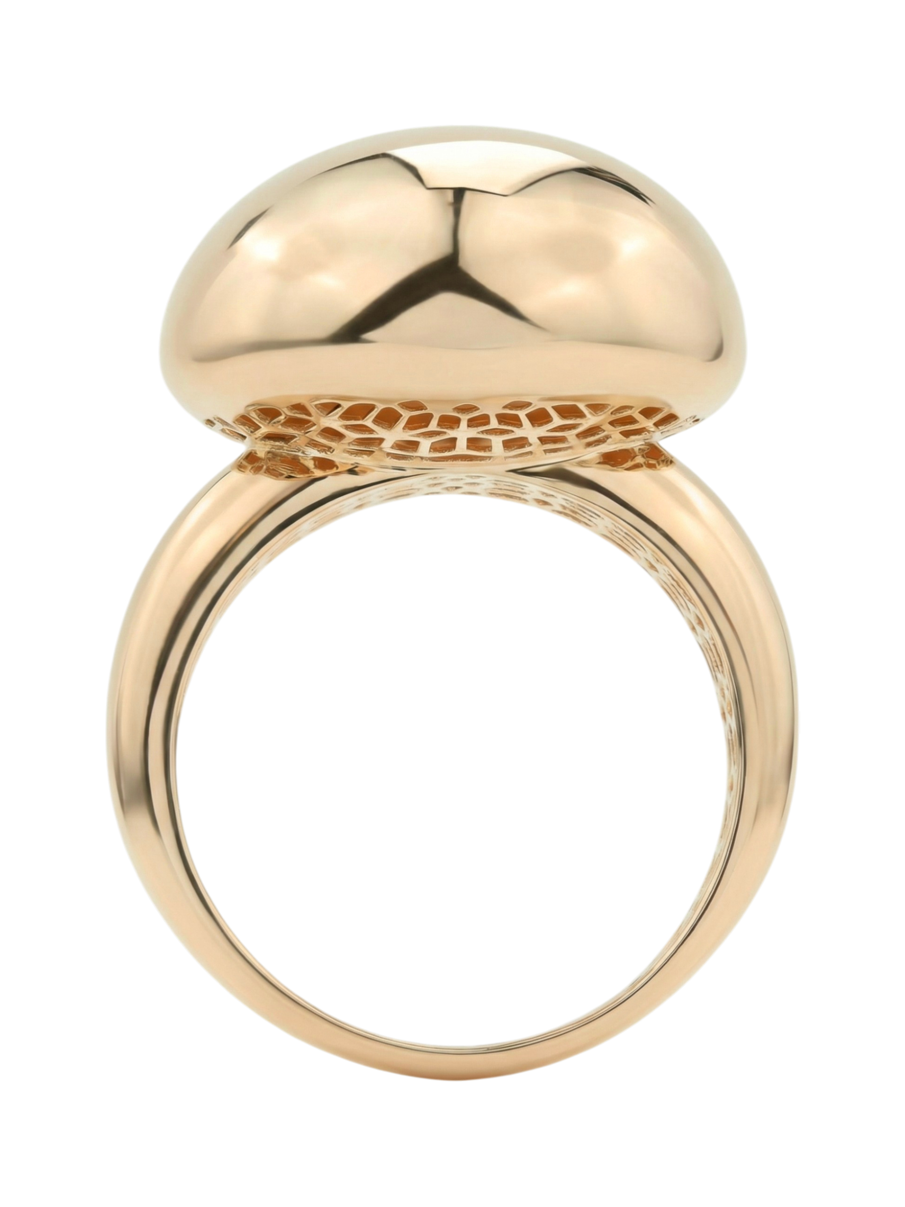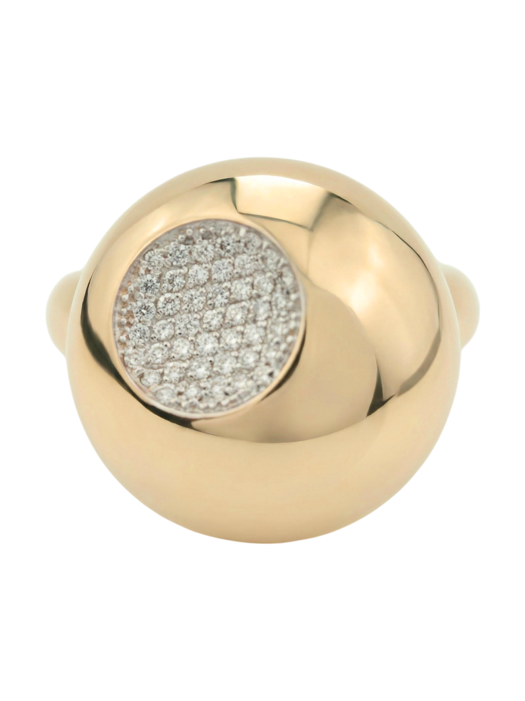 Верхняя часть кольца украшена россыпью из 43 бриллиантов круглой огранки с белым сиянием. Контраст между теплым оттенком красного золота и холодным блеском драгоценных камней создает завораживающий визуальный эффект, подчеркивая премиальный характер украшения. Тщательная полировка поверхности золота придает кольцу зеркальный блеск, который подчеркивает его архитектурную форму.