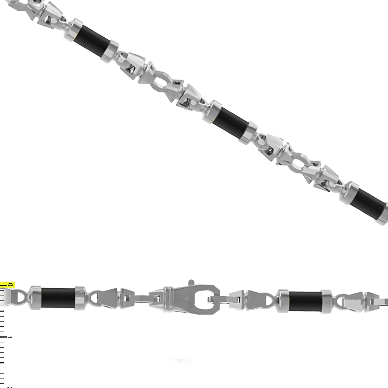 Главная особенность модели — контрастное исполнение: холодный блеск металла гармонично дополнен вставками из черного оникса. 68 вставок, выполненных в форме цилиндра, равномерно распределены по всей длине цепи, создавая ритмичный и выверенный узор. Мастерство исполнения подчеркивает статус владельца, а качественные материалы гарантируют долговечность изделия.