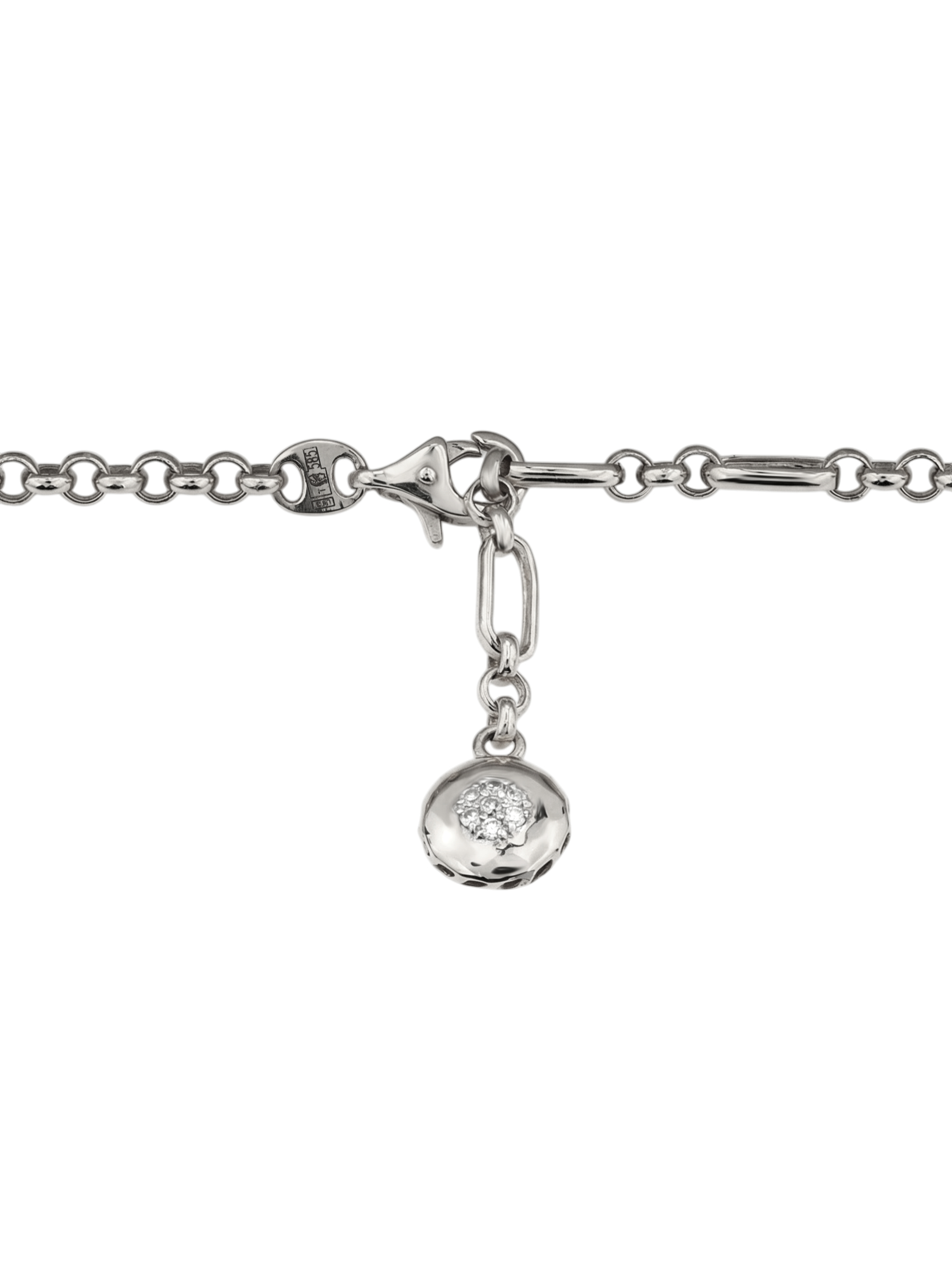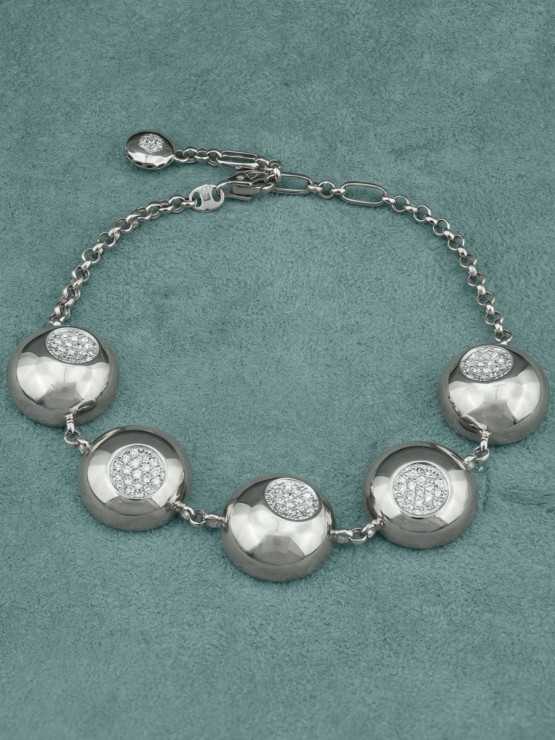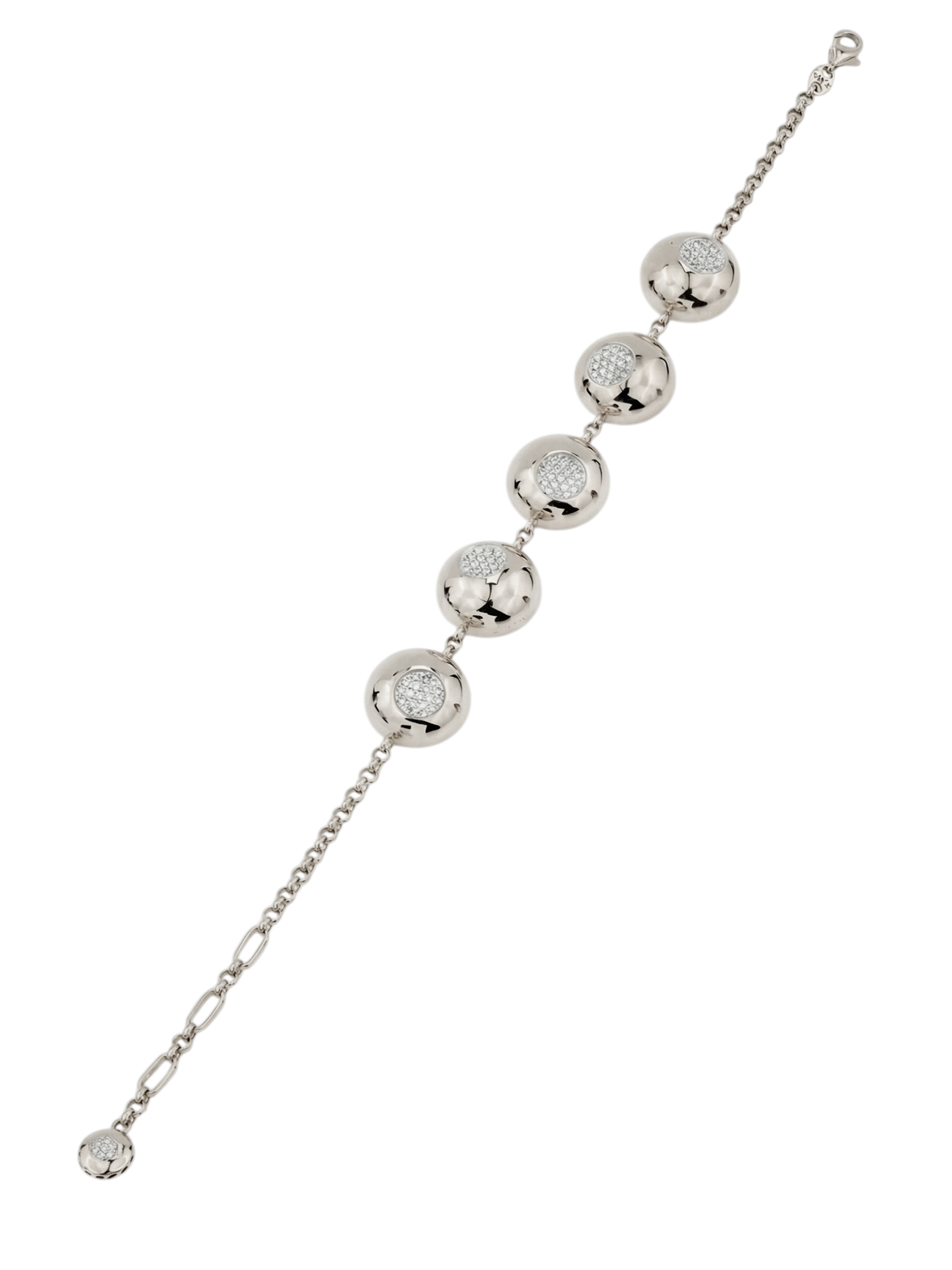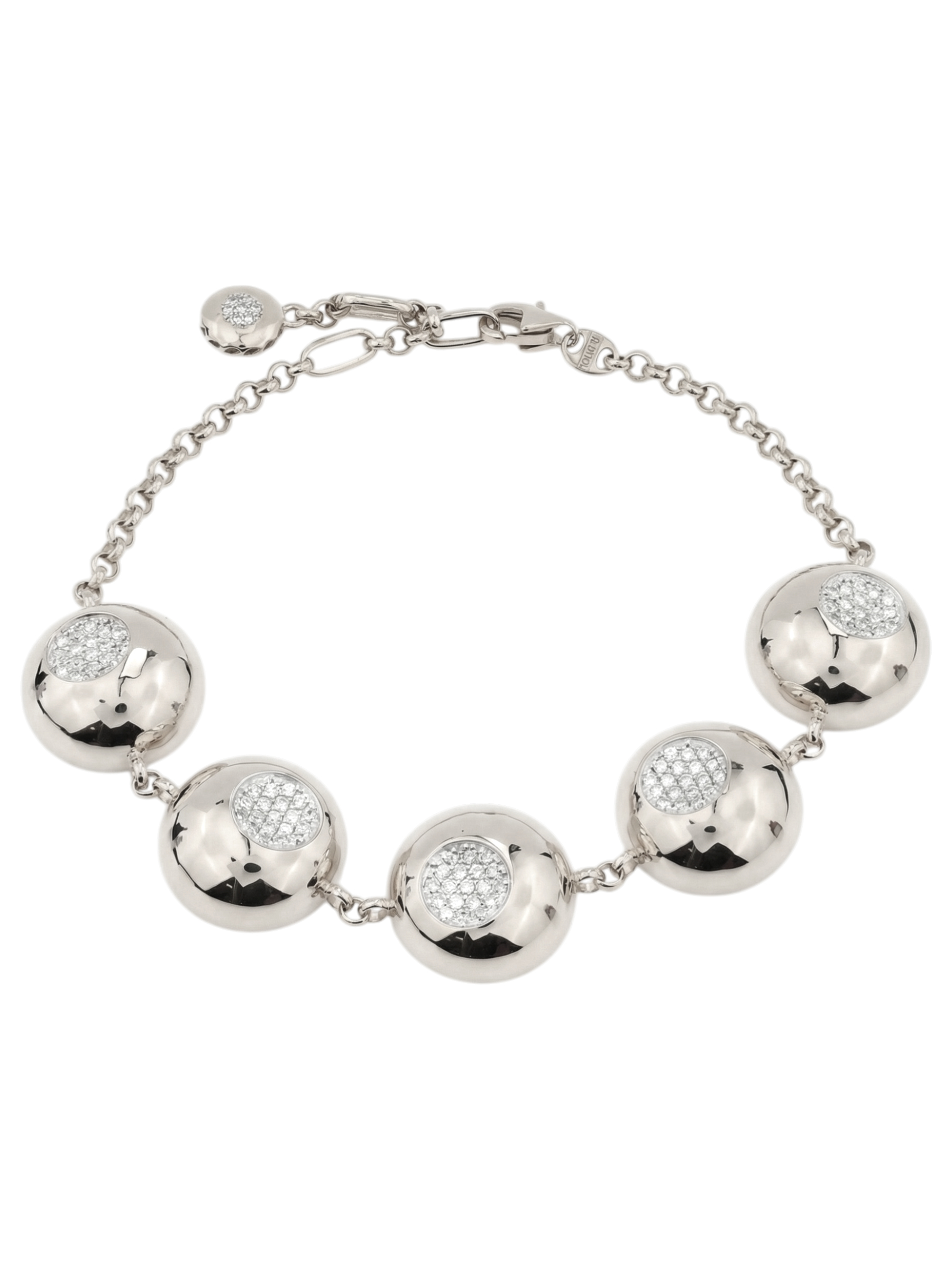 Центральным элементом композиции выступают крупные сферические звенья, поверхность которых безупречно отполирована до зеркального блеска. В каждом из них предусмотрена вставка из белых бриллиантов круглой огранки. Всего в изделии использовано 109 бриллиантов, создающих завораживающую игру света при каждом движении руки. Продуманная конструкция браслета обеспечивает комфортную посадку и надежность, позволяя носить его как самостоятельный аксессуар, так и в составе гармоничного комплекта украшений.