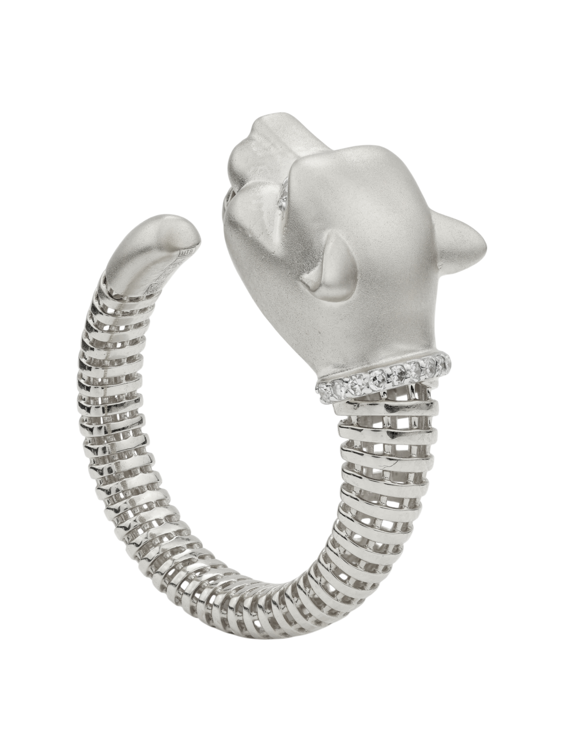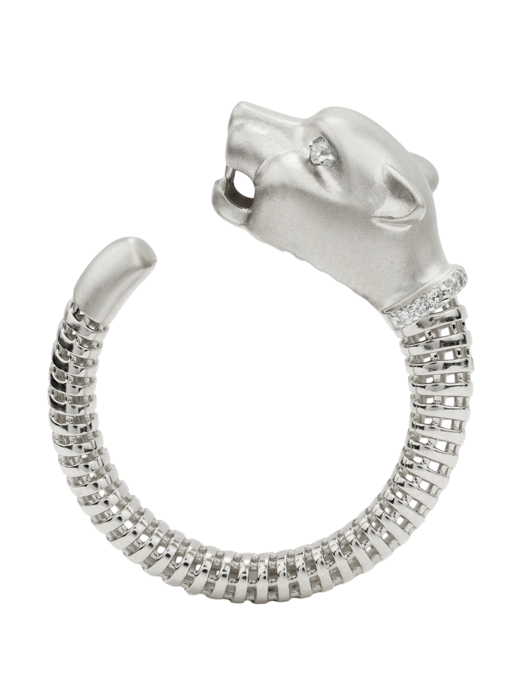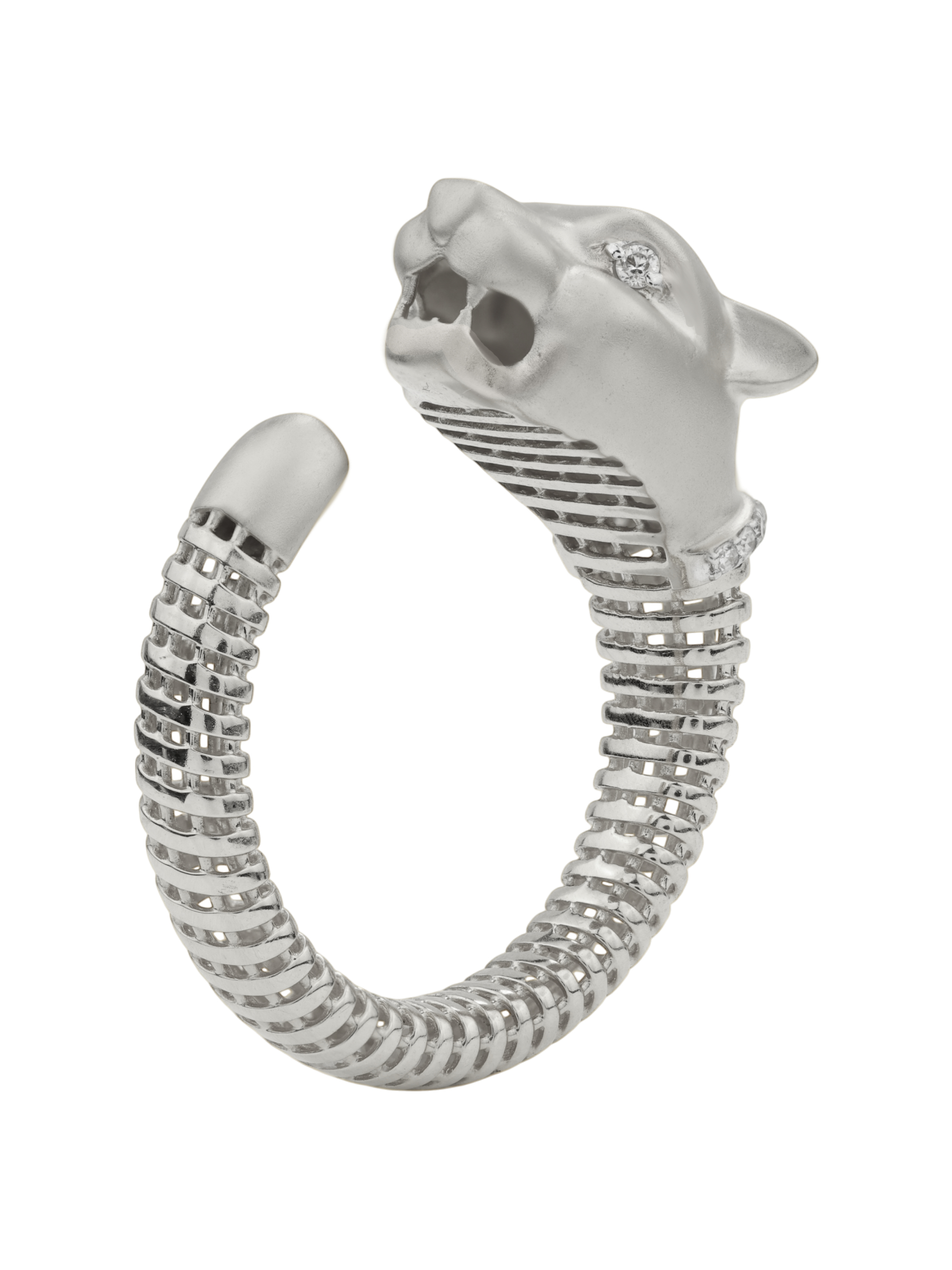 Украшение выполнено из белого золота 585 пробы, что обеспечивает долговечность и благородный блеск. Особую роскошь кольцу придают 14 вставок из бриллиантов круглой формы. Белый цвет камней гармонично сочетается с холодным оттенком металла, создавая цельную и завершенную композицию. Детализация в дизайне в виде леопарда делает изделие по-настоящему узнаваемым.