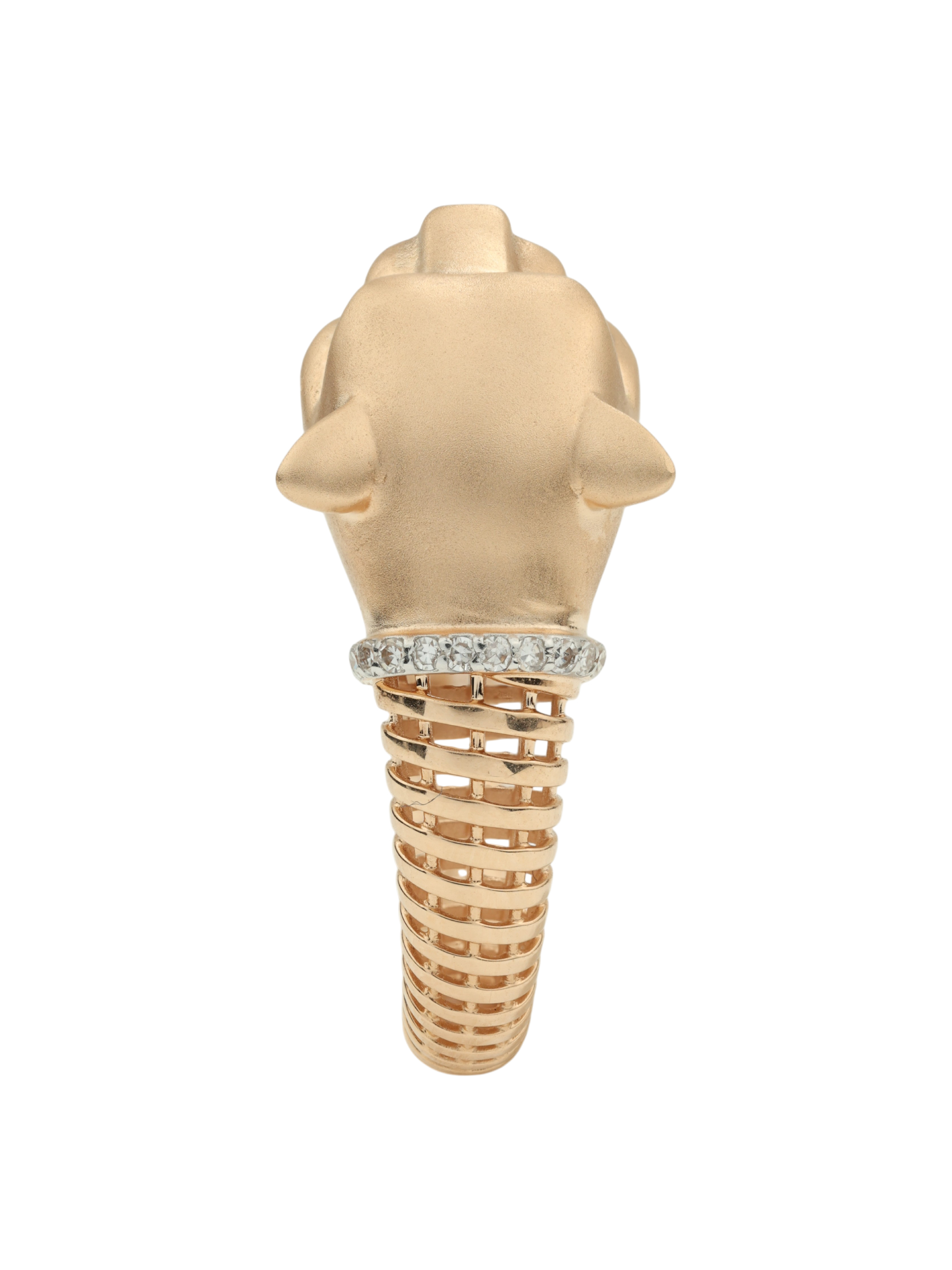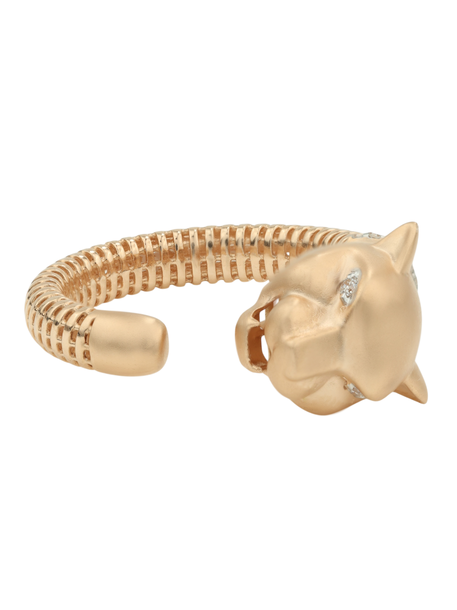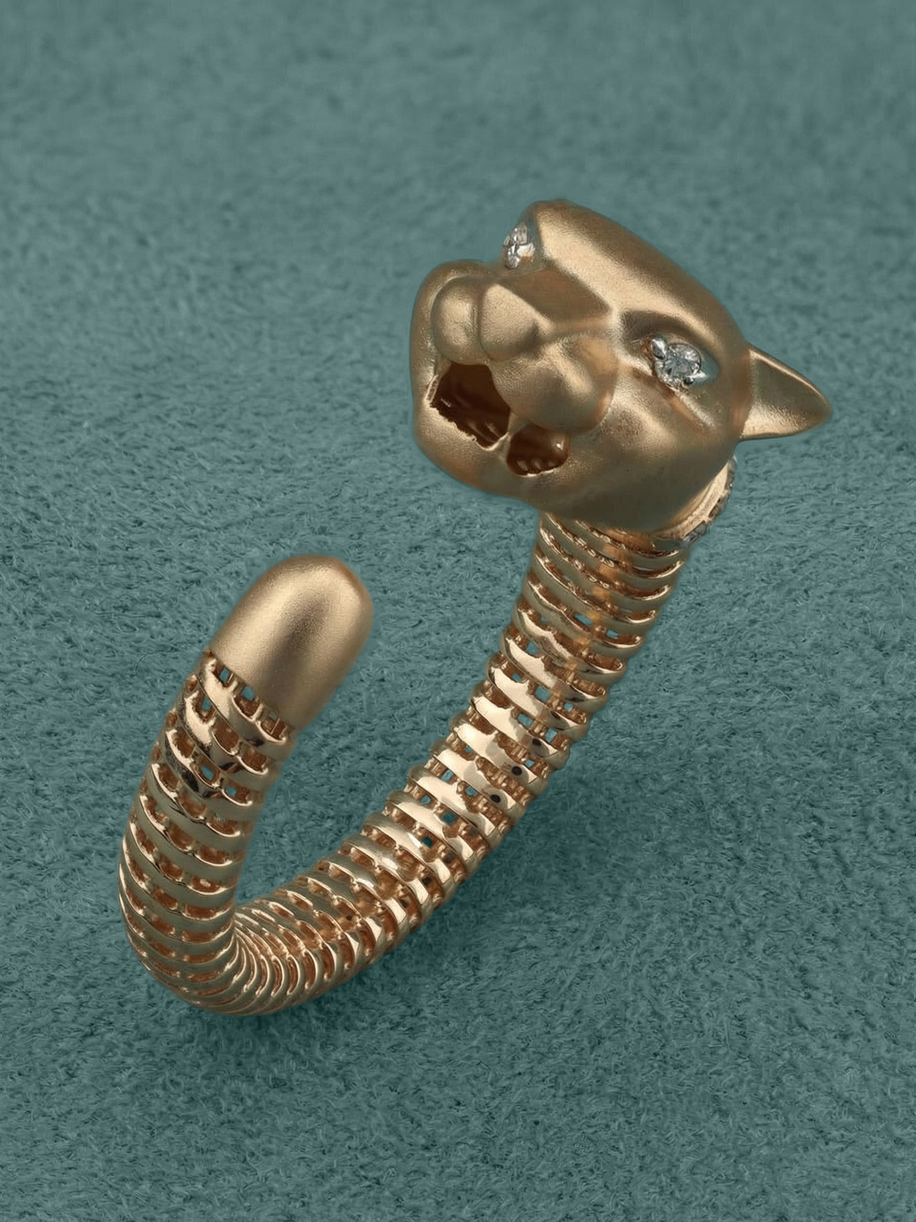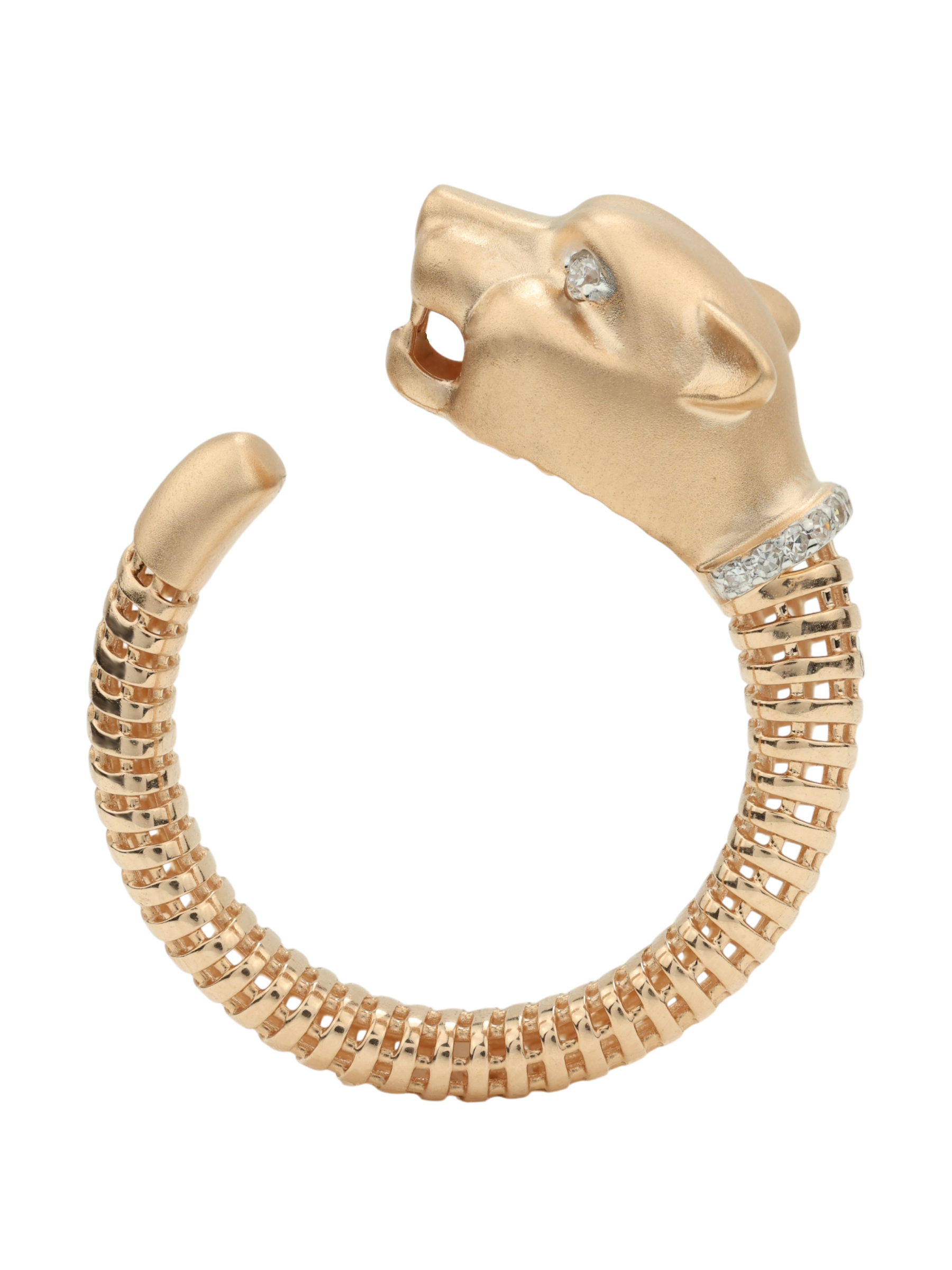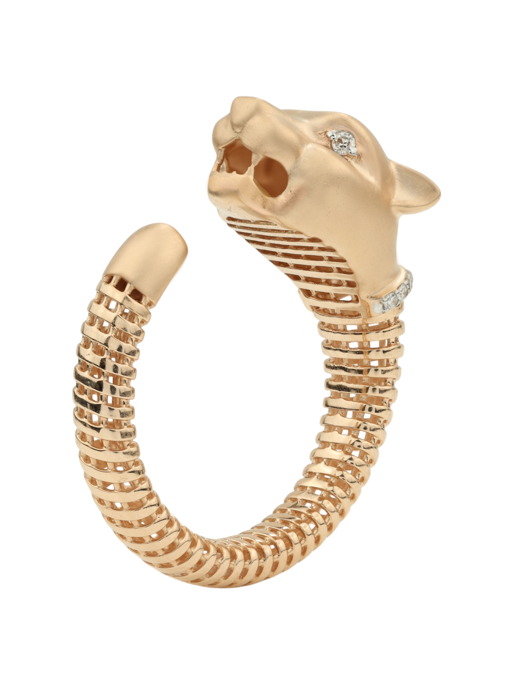 Роскошное кольцо из красного золота 585 пробы из коллекции Vioretty — Leopard станет акцентным украшением вашего образа. Дизайн изделия выполнен в виде грациозного леопарда, чей образ воплощает силу и изысканность. Мастера ювелирного дела уделили внимание каждой детали, создавая гибкую и фактурную основу, которая комфортно облегает палец. Взгляд хищника притягивает сияние 14 вставок из белых бриллиантов круглой формы, которые эффектно подчеркивают выразительность ювелирного изделия.