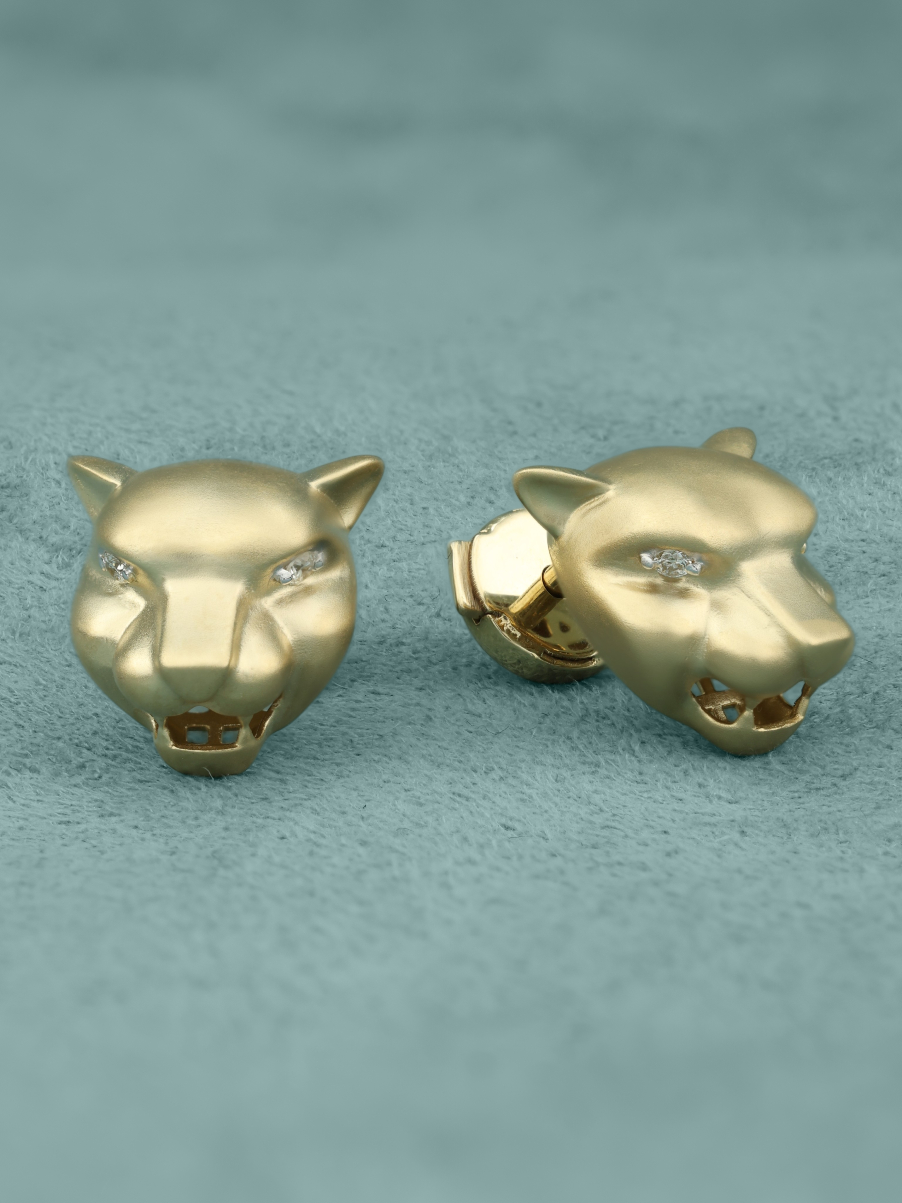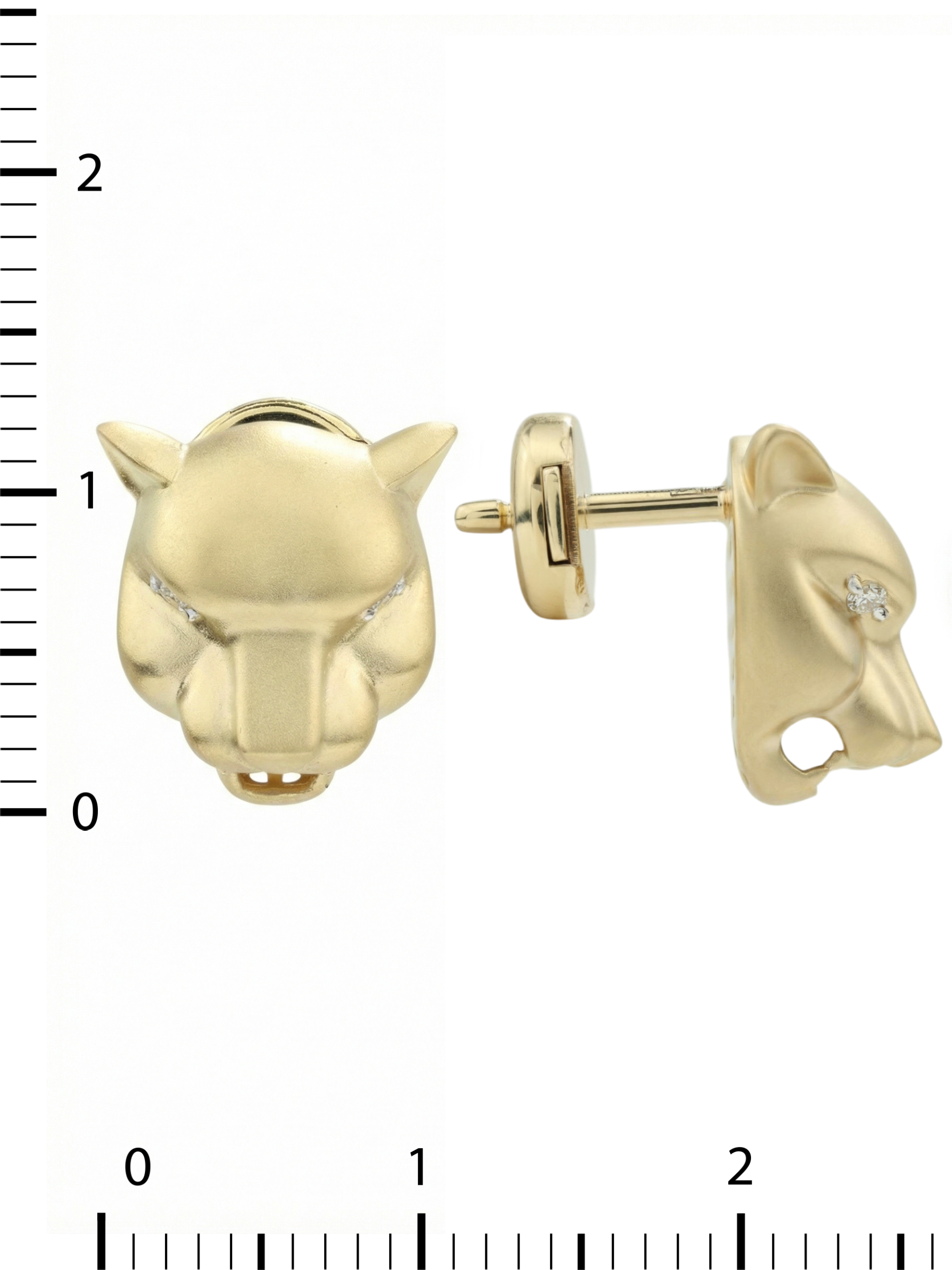 Центральным элементом композиции выступают четыре сверкающих бриллианта. Камни круглой формы и белого цвета искусно инкрустированы в изделия, создавая акцент на глазах леопардов и добавляя серьгам выразительности. Лимонный оттенок золота придает украшению теплый, современный вид, идеально подходящий для тех, кто ценит нетривиальные решения в ювелирном искусстве.