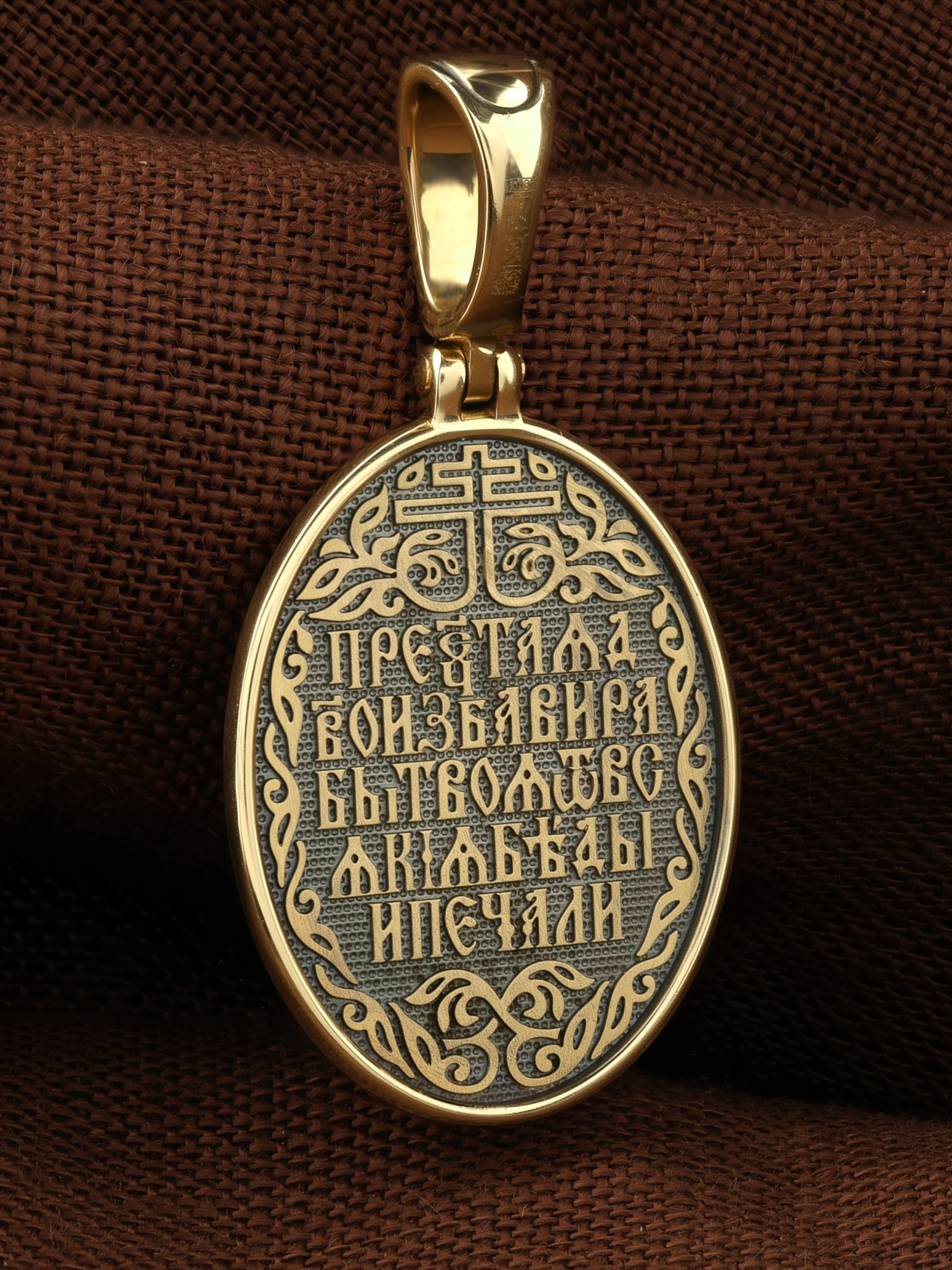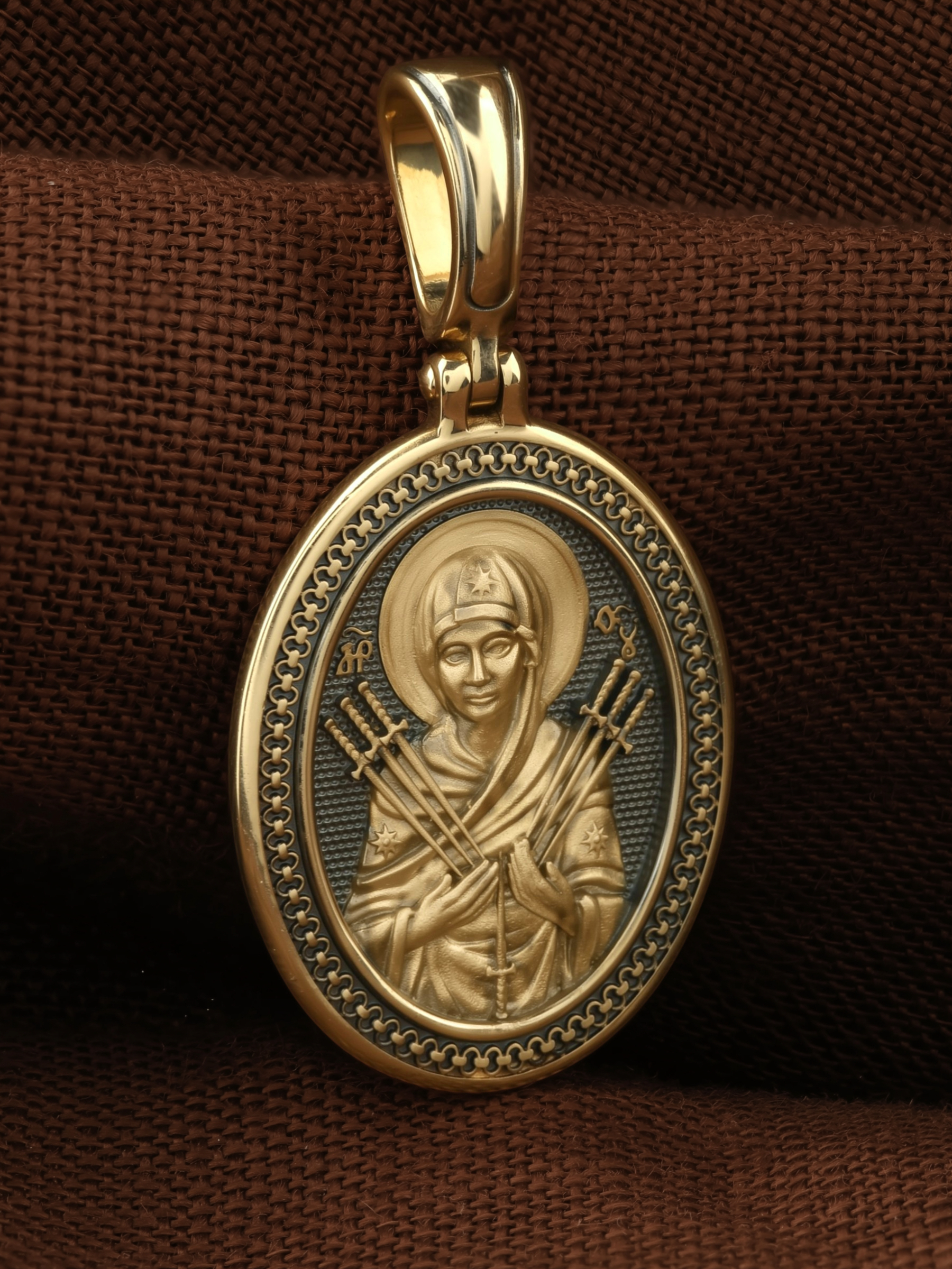 На лицевой стороне образка изображена икона Пресвятой Богородицы «Семистрельная» — одна из самых чудотворных икон на Руси. На протяжении многих веков христиане взывали к Царице Небесной через эту икону, если в стране начинались войны или мятежи.