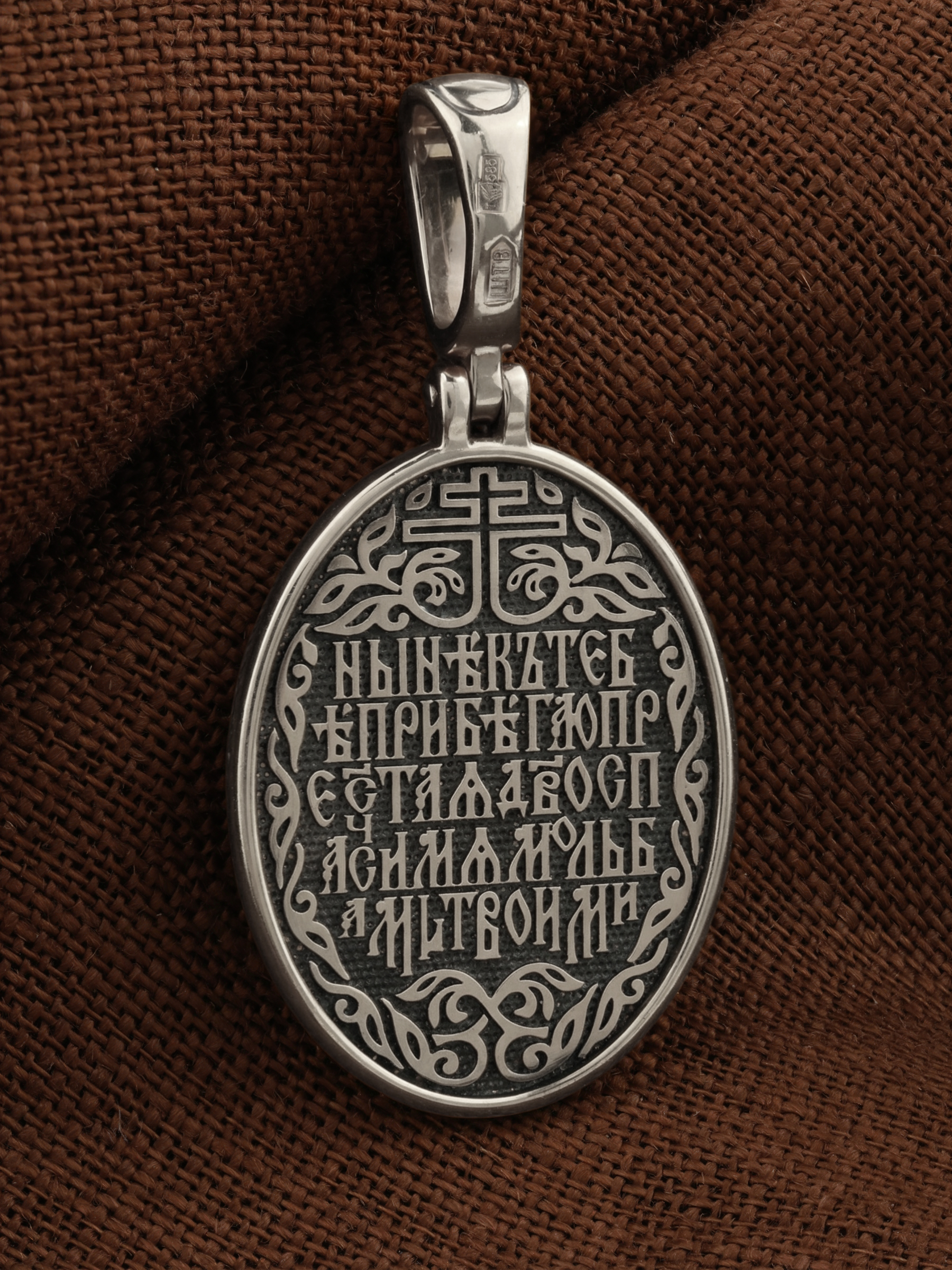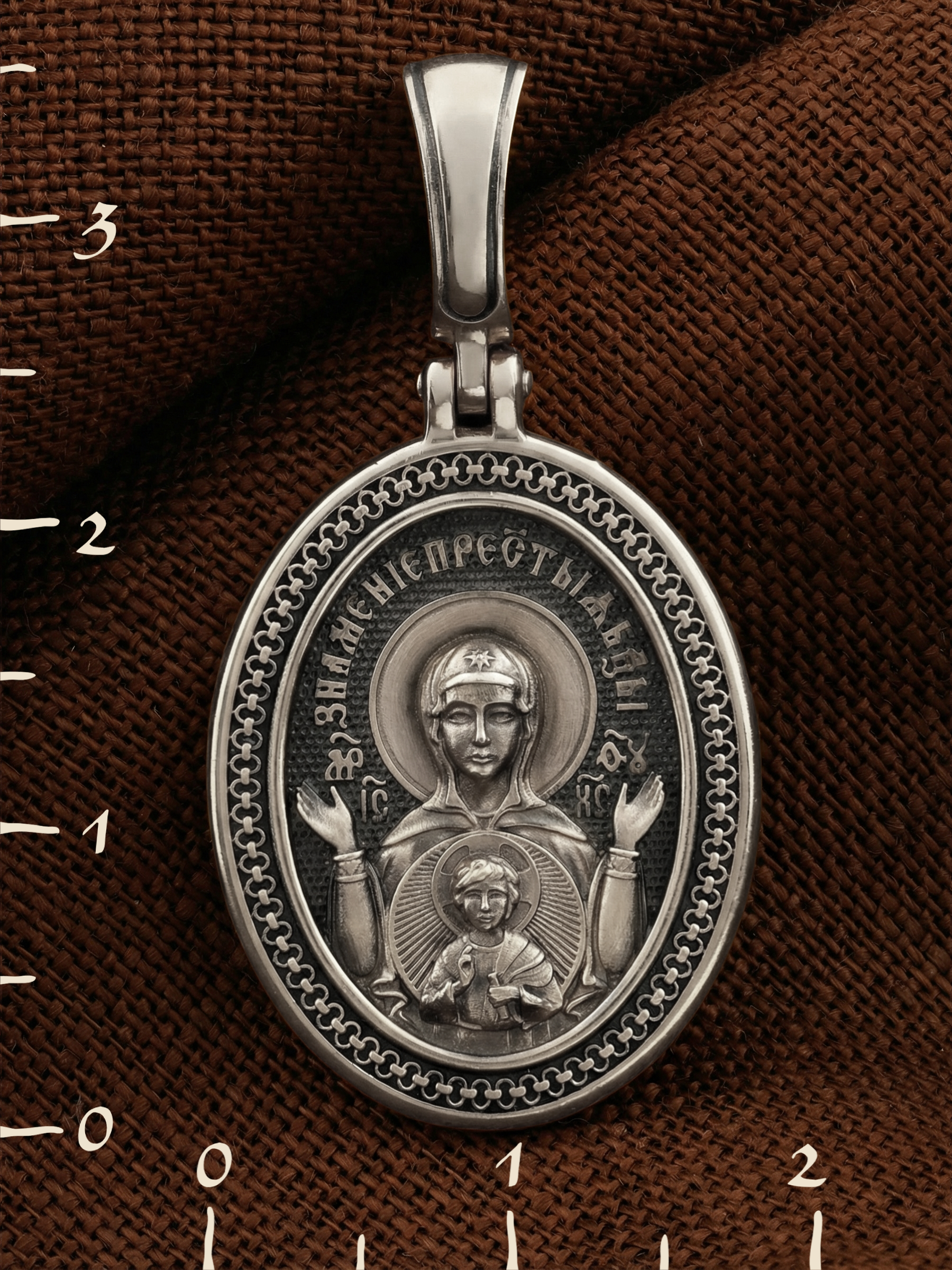 В центр образка помещен образ Божией Матери «Знамение», прославившийся многими чудесами в Новгороде в XII веке. Икона эта чтится как одна из самых великих святынь Русской земли. Молитвенно воздетые руки Богородицы означают заступничество за людей пред Богом. Рядом с Ней, на фоне круглого щита, — благословляющий Божественный Младенец — Спас-Эммануил.