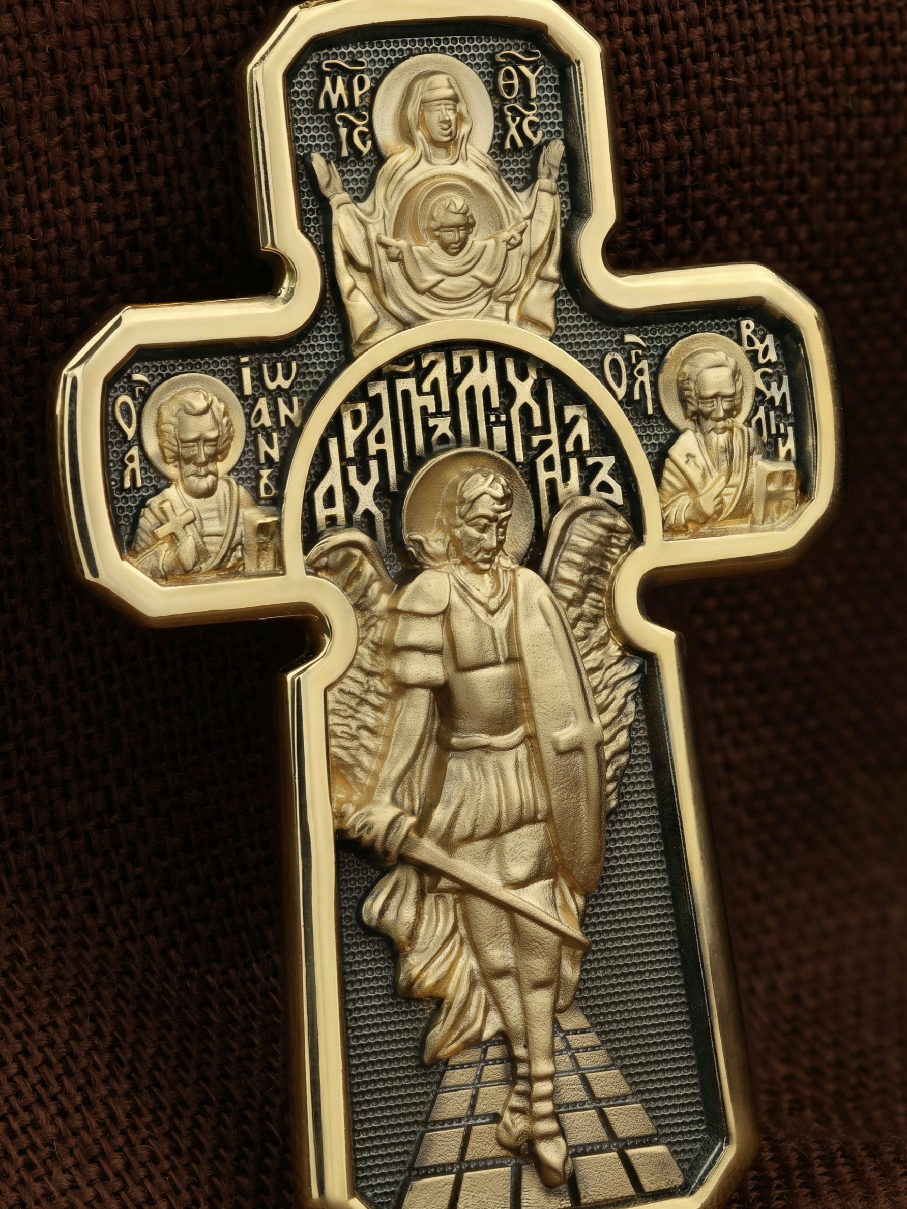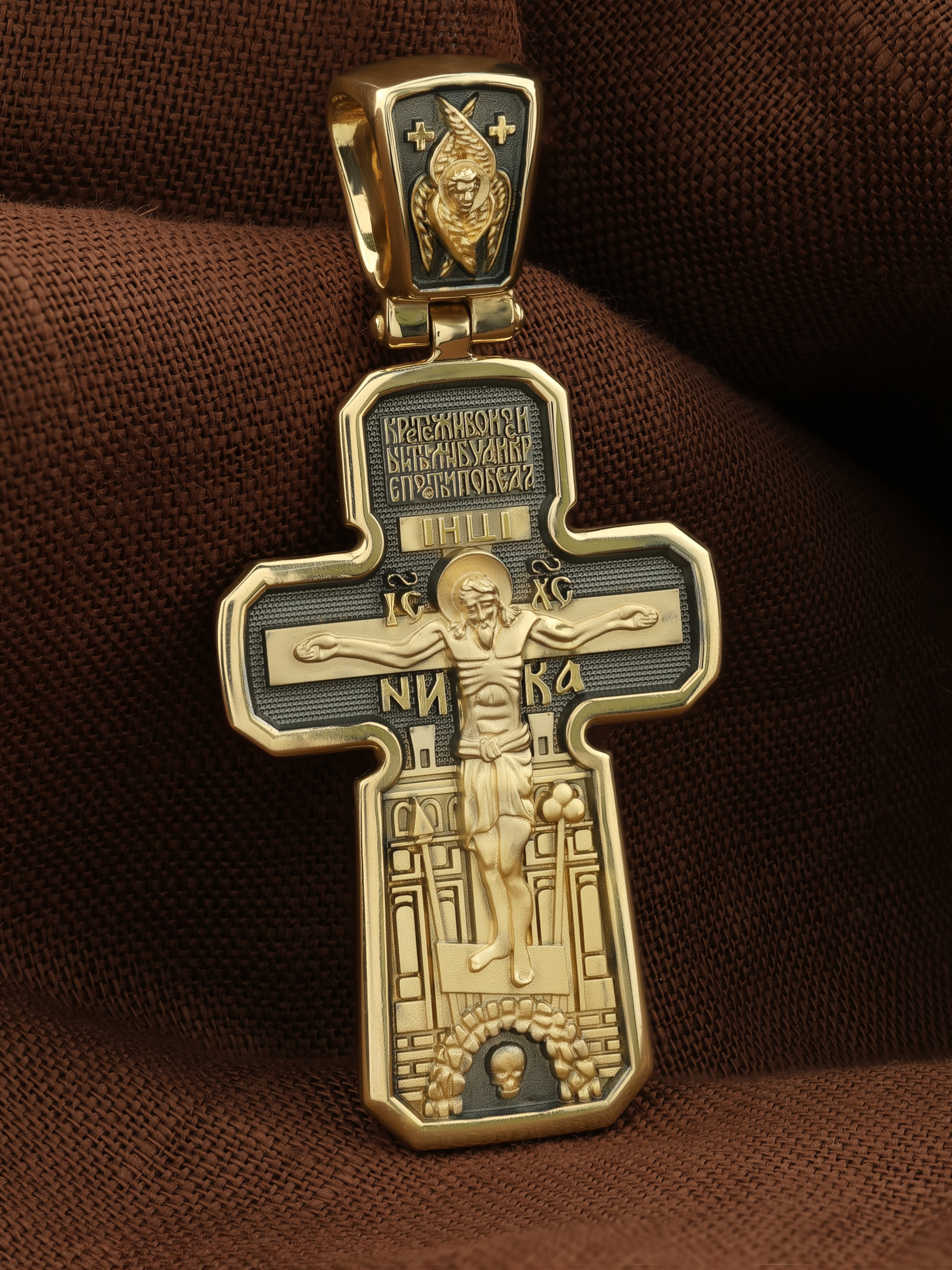 Основное поле лицевой стороны креста занято изображением рельефного Распятия на восьмиконечном Голгофском кресте с копием, тростью по сторонам и Главой Адамовой в пещере на ступенчатой Голгофе. Над крестом написаны слова Канона святому и животворящему Кресту Господню: «Кресте живоносный, ты ми буди крепость, и победа, и щит, и стена нератуема, бесов отгнание, и помыслов погашение, и ума моего сохранение».