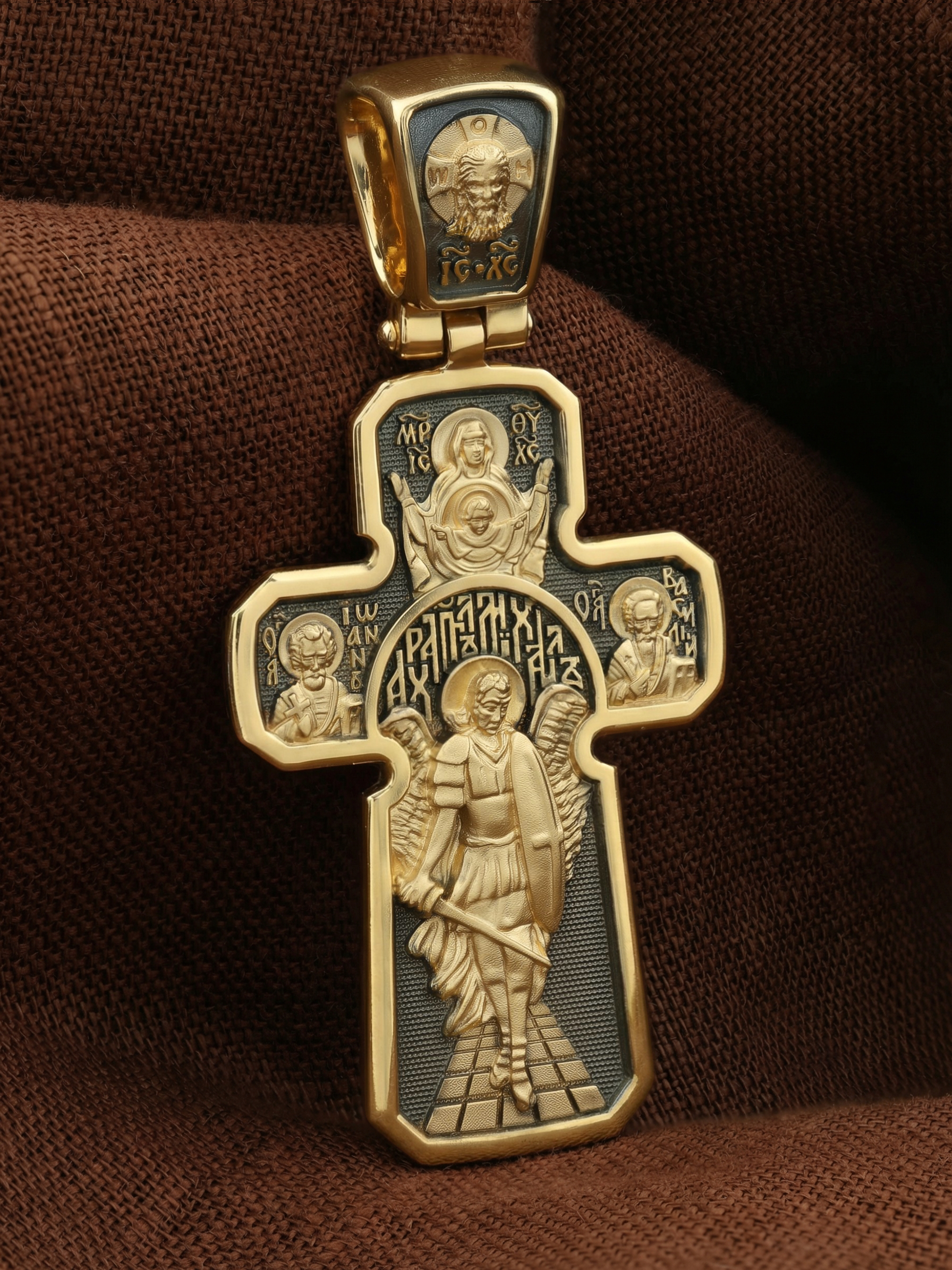 Основой композиции оборотной стороны является ростовое изображение Архангела Михаила — Архистратига всех Небесных Воинств. Он ведет непримиримую войну против сил зла, охраняет райские врата и защищает души людей. Крылатый Архангел изображен в воинском доспехе и плаще идущим по каменистой дороге. В правой руке он держит обнаженный меч, а в левой щит. С двух сторон Архангелу предстоят образы святителей Иоанна Златоуста (составитель Божественной Литургии) и Василия Великого (Вселенский учитель и один из отцов Церкви).