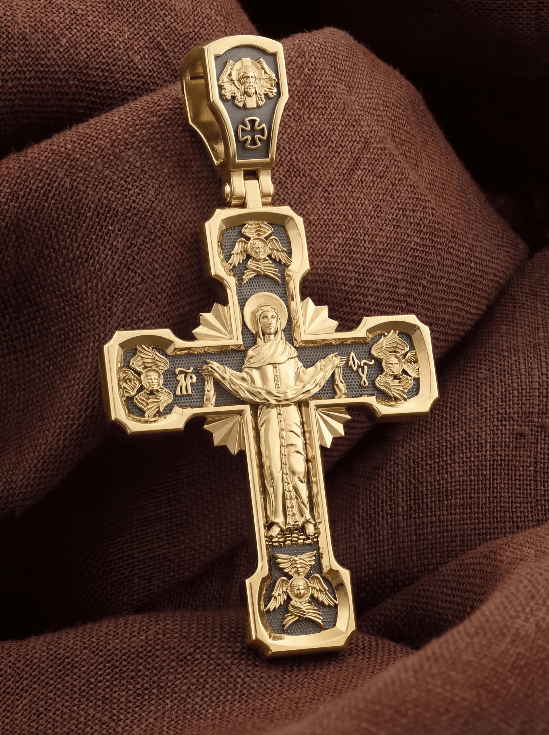 На обороте креста, в окружении крылатых Серафимов, изображена икона Покрова Пресвятой Богородицы. Праздник Покрова Божией Матери является воспоминанием чуда, которое произошло во Влахнернской церкви 1 (14) октября 910 года: Пресвятая Богородица явилась верующим над алтарем храма и распростерла над ними Свое покрывало. В этот день Божья Матерь открыла людям, что Она является Ходатаицей за них перед Богом. Богородица простирает Свой молитвенный покров над всеми православными христианами и умоляет Сына Своего о даровании вечного спасения каждому человеку.