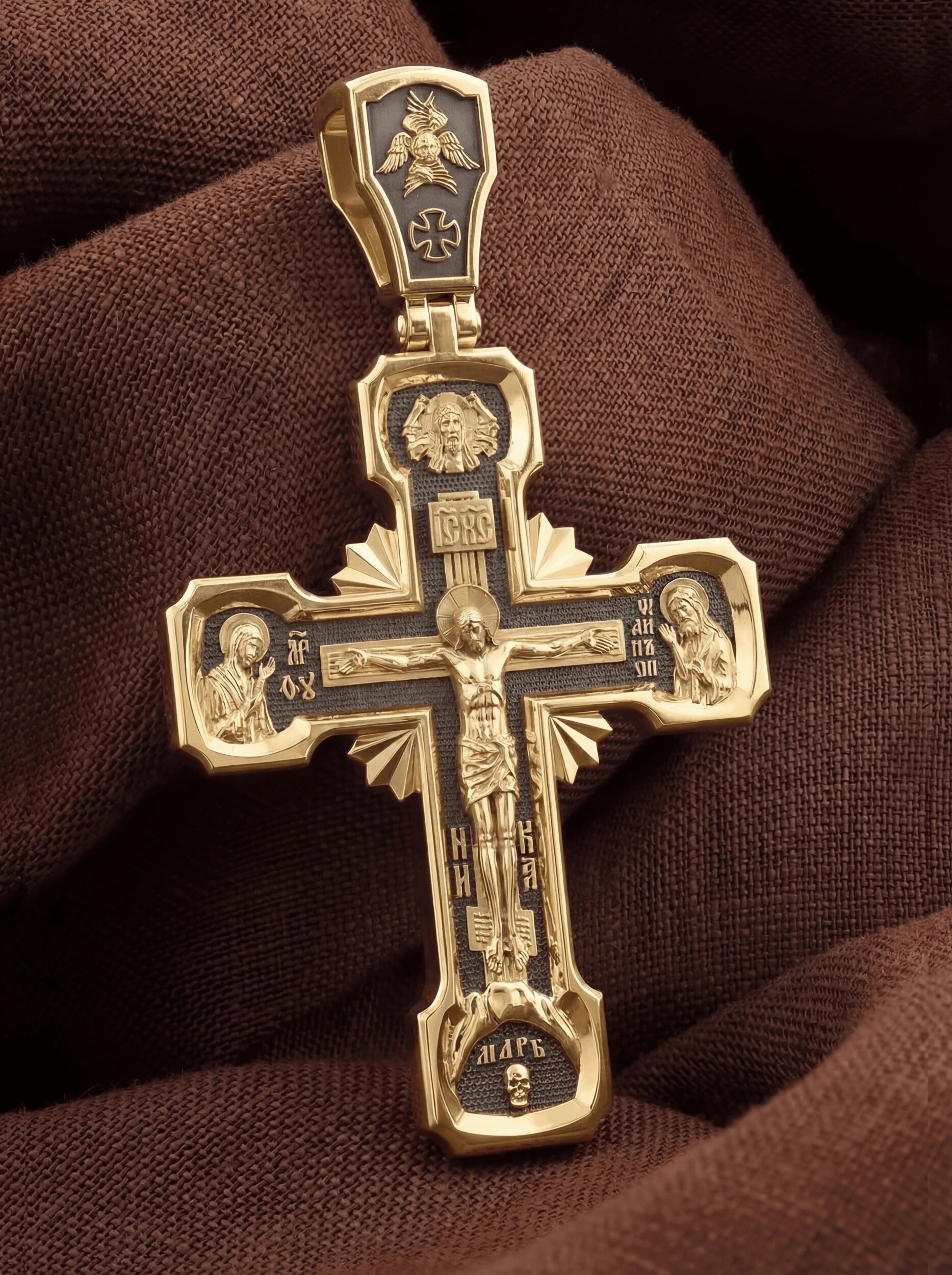 На лицевой стороне креста изображено Распятие Господа Иисуса Христа. С двух сторон Христу предстоят Пресвятая Богородица и св. пророк и Предтеча Господень Иоанн Креститель, которые имеют особое дерзновение перед Богом молиться за всех людей. Иконы, где они изображены молящимися Христу, называются Деисус, что значит «моление».