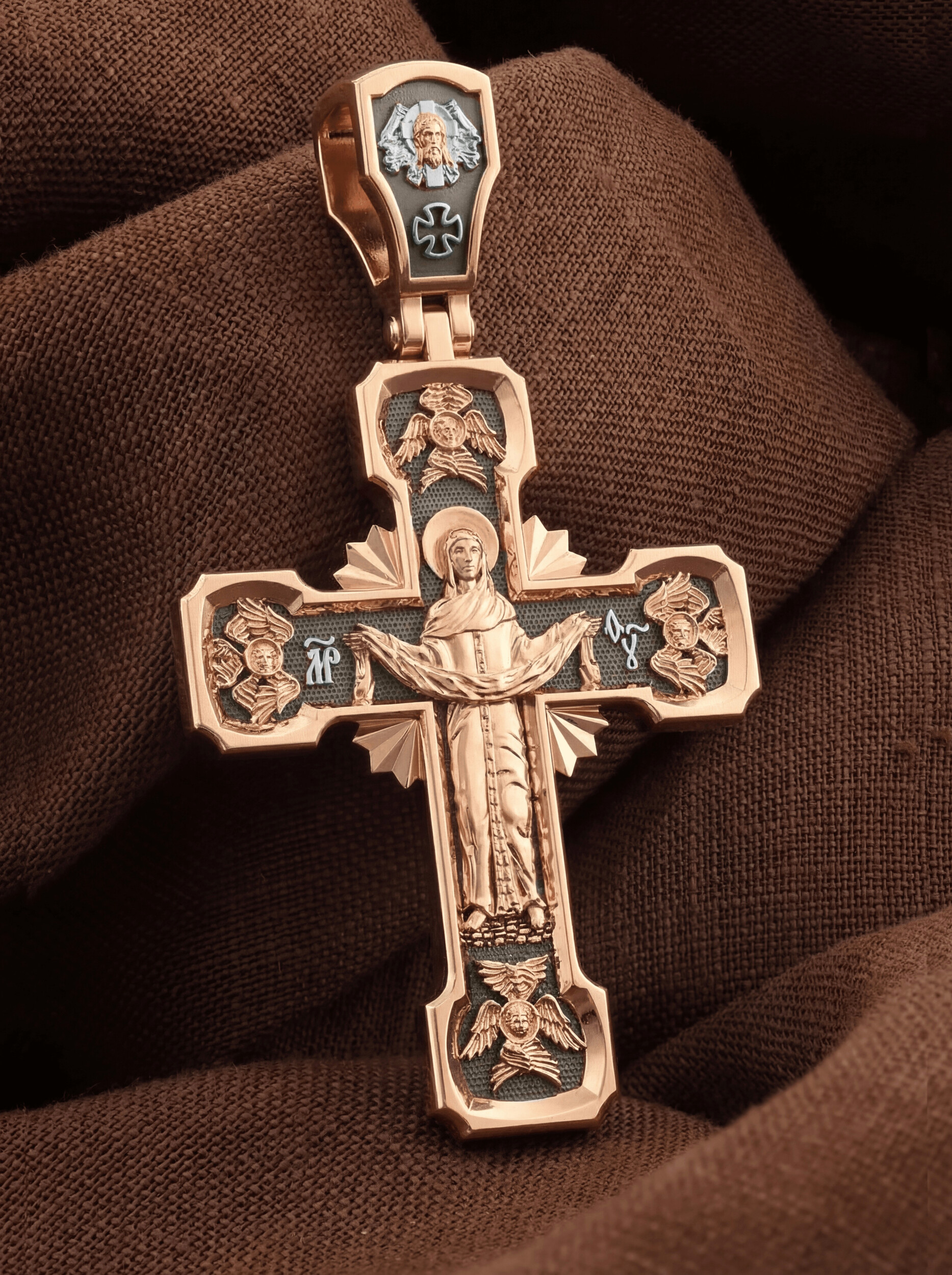 На обороте креста, в окружении крылатых Серафимов, изображена икона Покрова Пресвятой Богородицы. Праздник Покрова Божией Матери является воспоминанием чуда, которое произошло во Влахнернской церкви 1 (14) октября 910 года: Пресвятая Богородица явилась верующим над алтарем храма и распростерла над ними Свое покрывало. В этот день Божья Матерь открыла людям, что Она является Ходатаицей за них перед Богом. Богородица простирает Свой молитвенный покров над всеми православными христианами и умоляет Сына Своего о даровании вечного спасения каждому человеку.