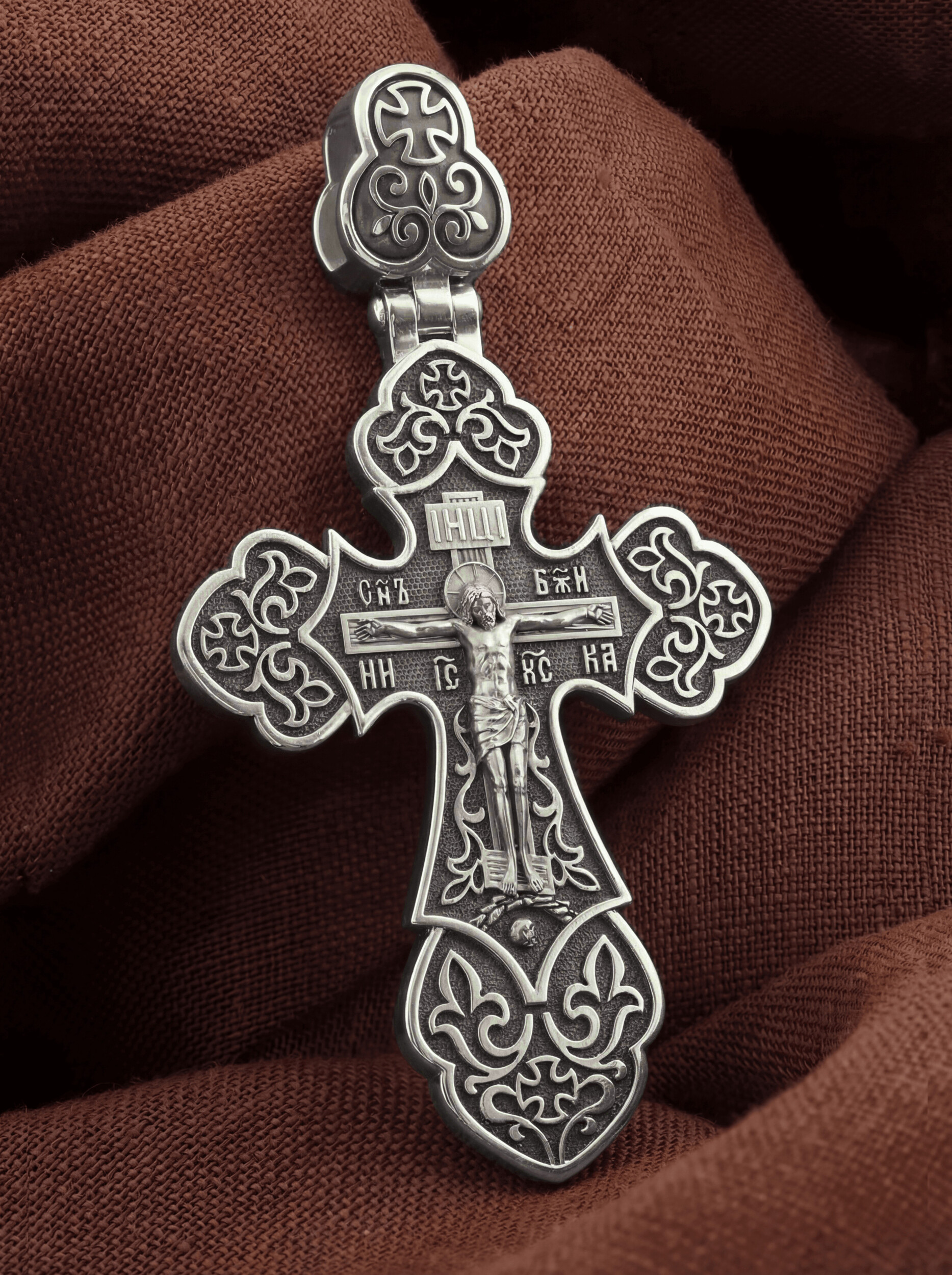 Крест с рельефным изображением Распятия в окружении пышных цветов и ажурного узора, напоминает нам о красоте Райского сада. Такой крест вводит мотив процветшего креста и ассоциируется с образом райского Древа Жизни. Как через древо познания пришла смерть, так через Крест Христа — «Древо Жизни» — даровано спасение.