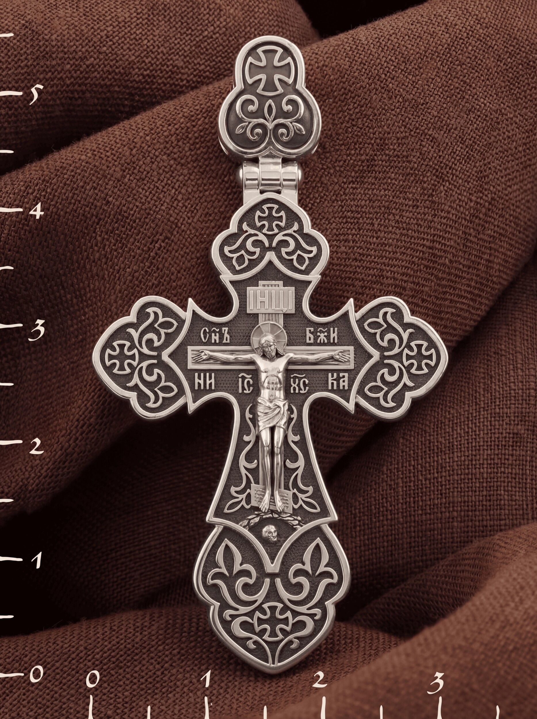 В верхней части Распятия у изголовья Иисуса Христа видна табличка с аббревиатурой «IНЦI» — «Иисус Назорей Царь Иудейский», которая, согласно Евангелию, была прибита к кресту после Его Распятия. Внизу, у подножия Господа, можно увидеть гору Голгофу с Главой Адамовой в пещере. Сам образ Распятия сопровождается каноническими надписями. Это святое имя Христа, которое принято писать на иконах сокращенно — «ИС ХС», словосочетание «СЫН БОЖИЙ», что означает божественную природу Иисуса Христа, и надпись «НИКА», обозначающая «победитель».