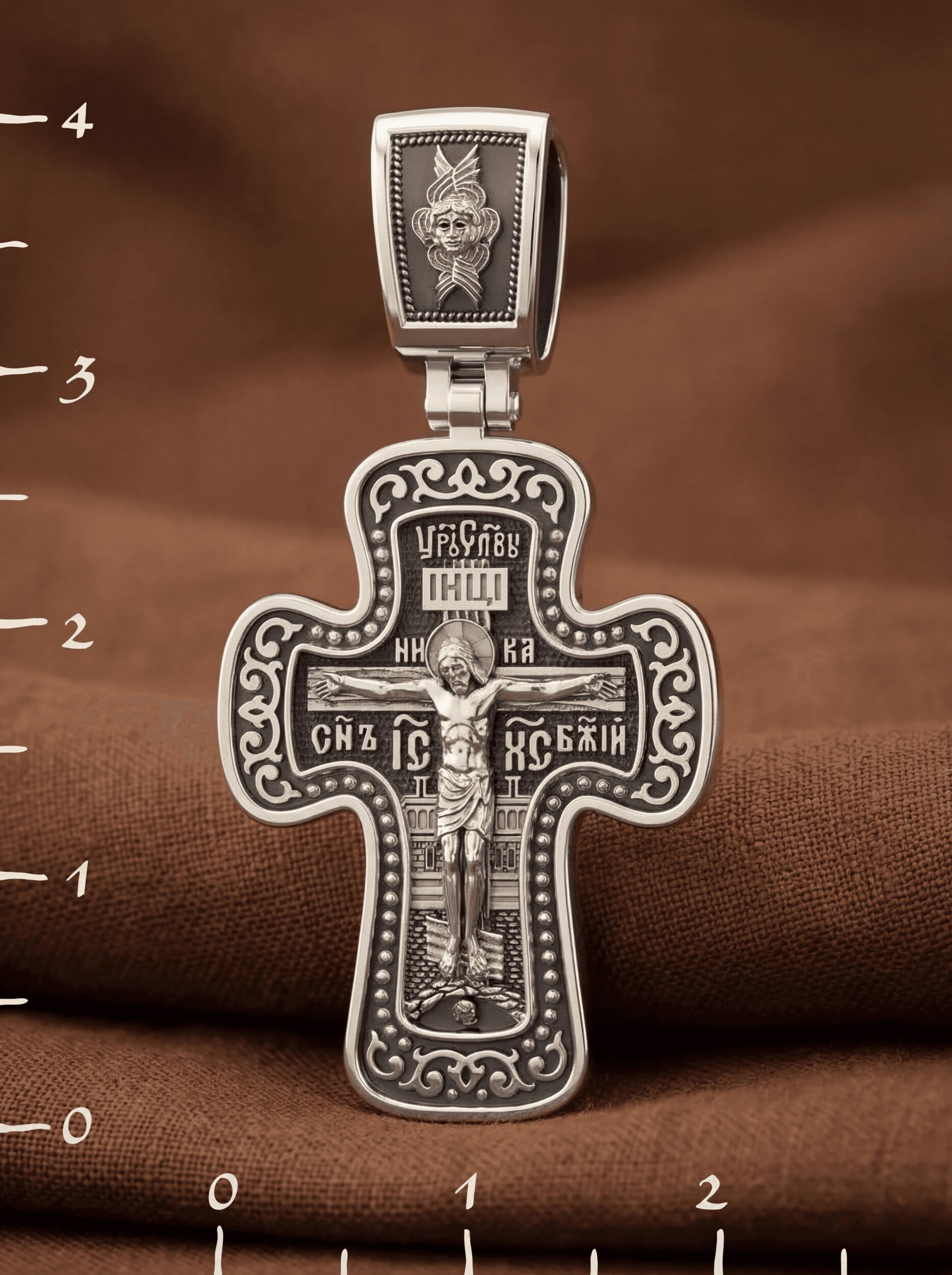 Распятие сопровождается каноническими надписями. Это святое имя Христа, которое принято писать на иконах сокращенно — «ИС ХС», словосочетание «СЫН БОЖИЙ», что означает божественную природу Иисуса Христа. Рядом с Его образом помещены слова «Царь Славы». Над головой Господа на поперечной перекладине аббревиатура «IНЦI», что символизирует табличку, которая была прибита к Кресту, с надписью «Иисус Назорей Царь Иудейский». На кулонном кольце помещено изображение серафима.