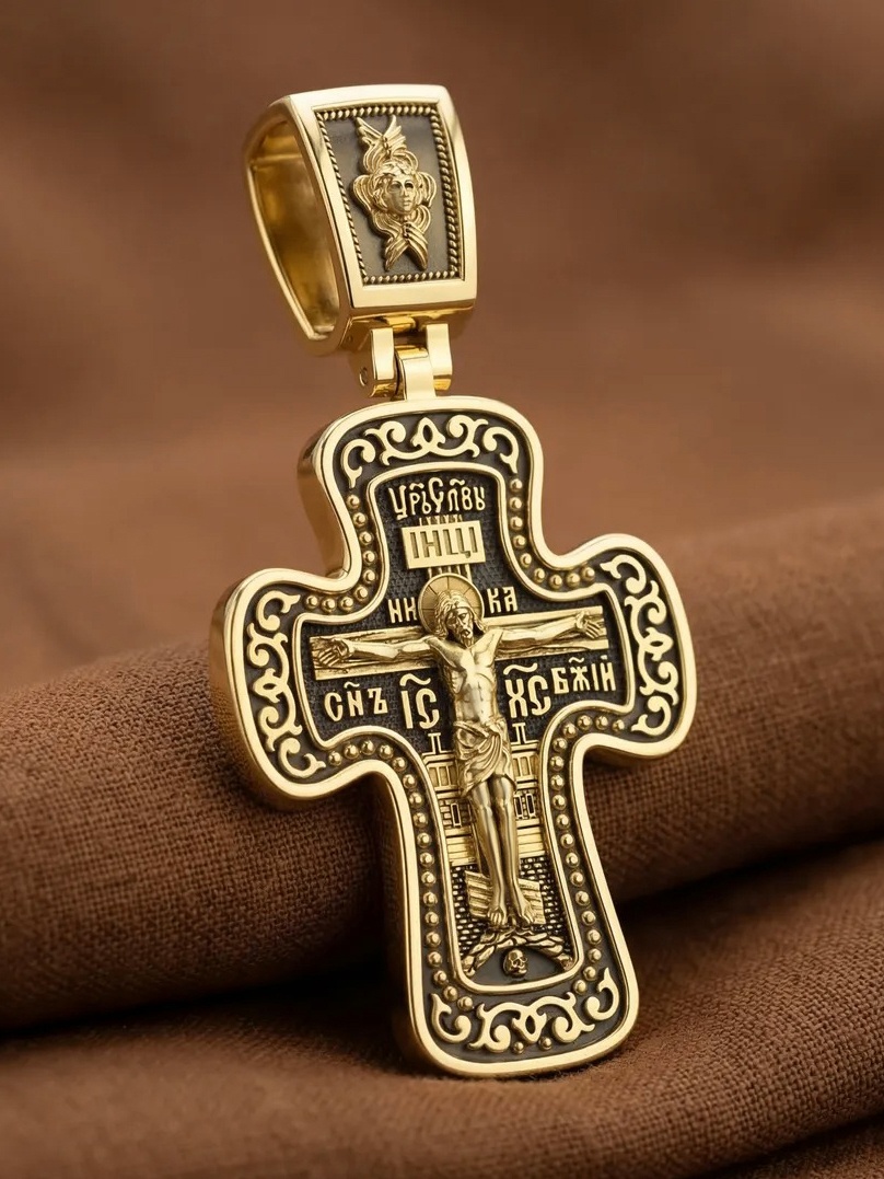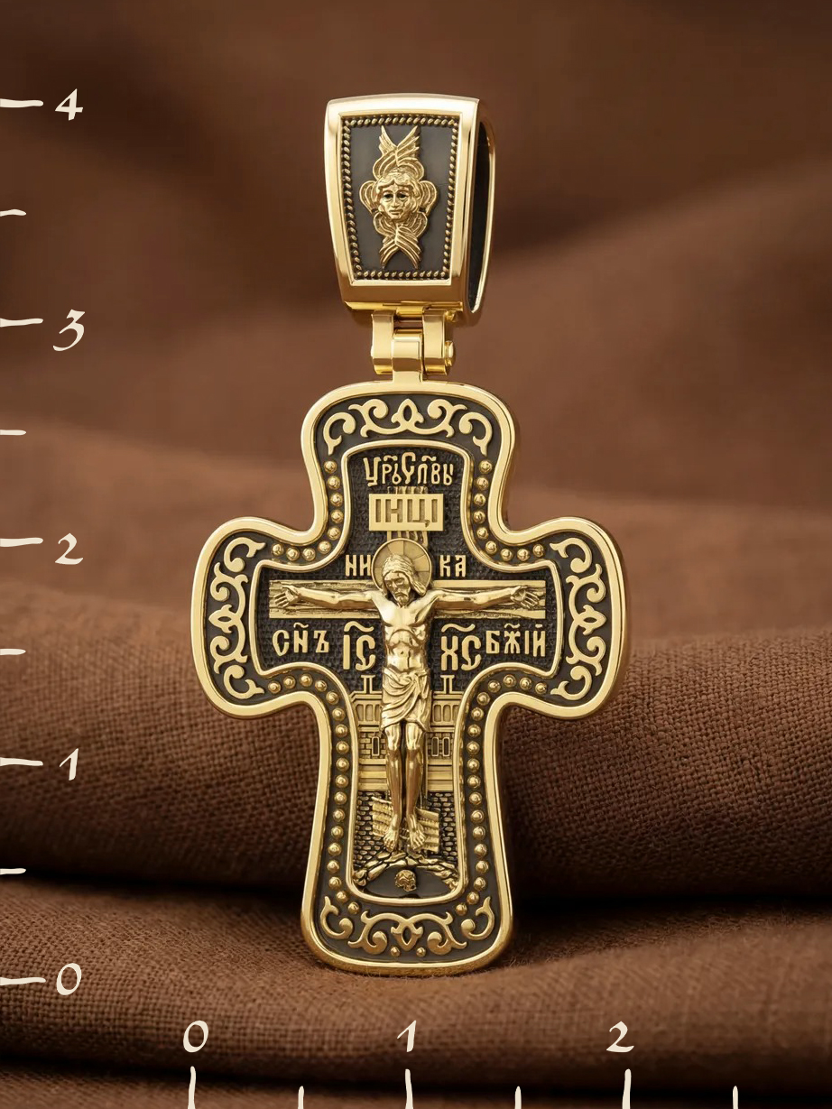 Распятие сопровождается каноническими надписями. Это святое имя Христа, которое принято писать на иконах сокращенно — «ИС ХС», словосочетание «СЫН БОЖИЙ», что означает божественную природу Иисуса Христа. Рядом с Его образом помещены слова «Царь Славы». Над головой Господа на поперечной перекладине аббревиатура «IНЦI», что символизирует табличку, которая была прибита к Кресту, с надписью «Иисус Назорей Царь Иудейский». На кулонном кольце помещено изображение серафима.