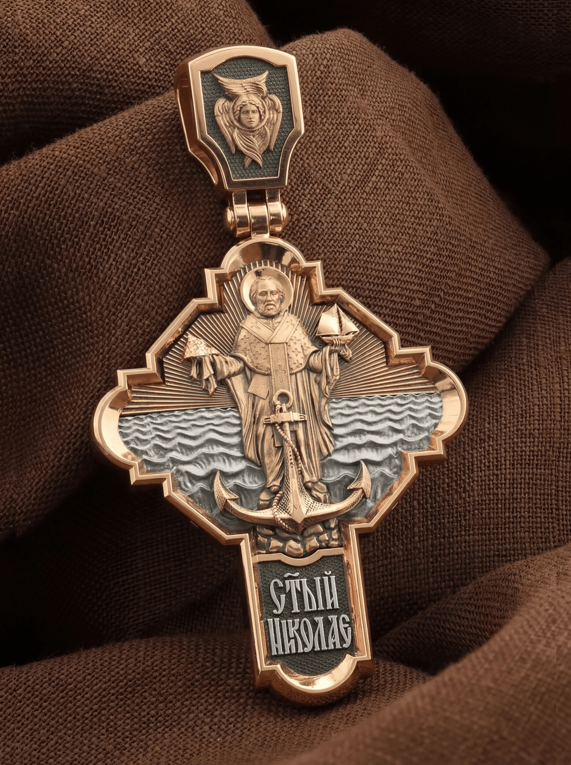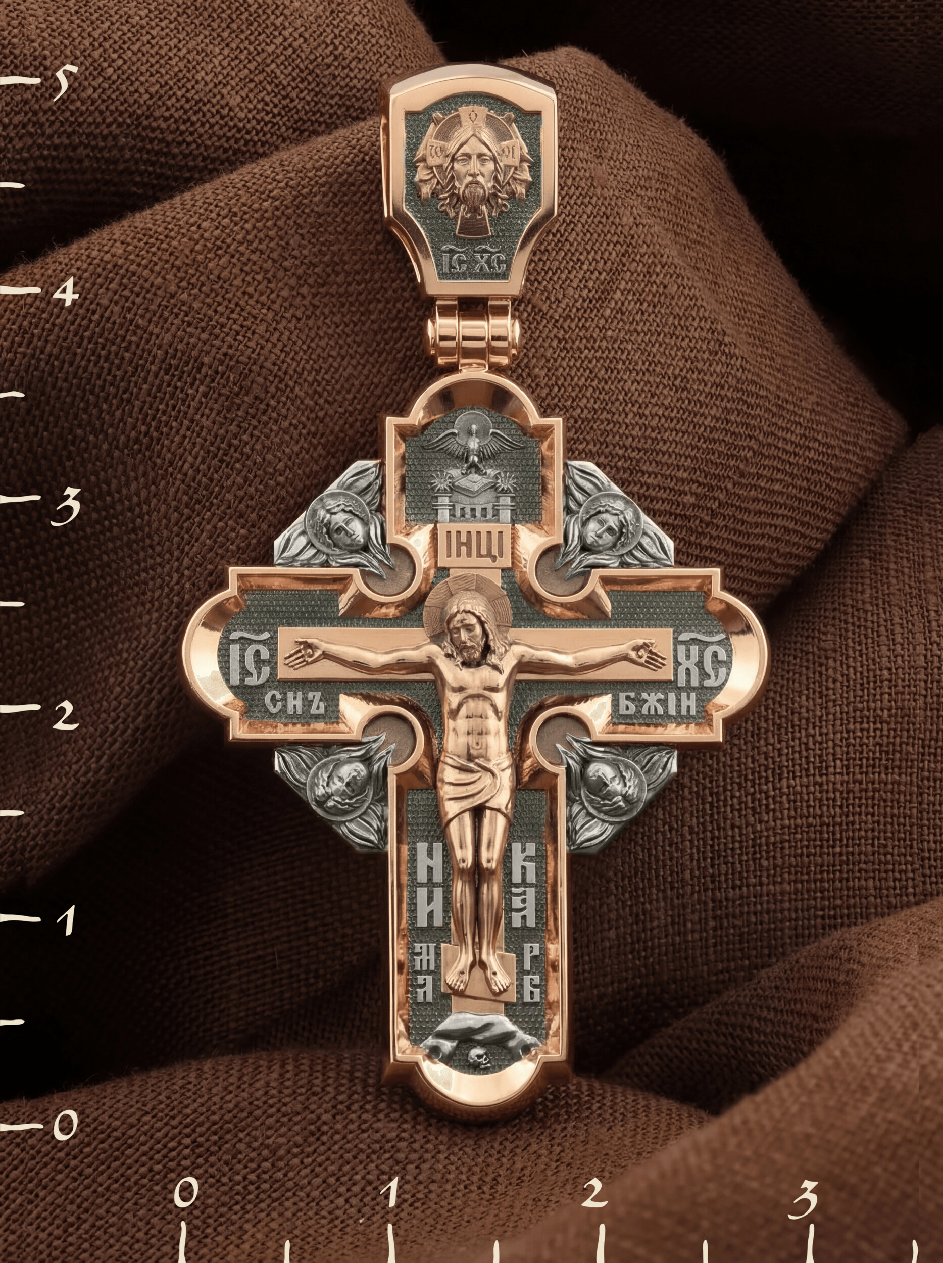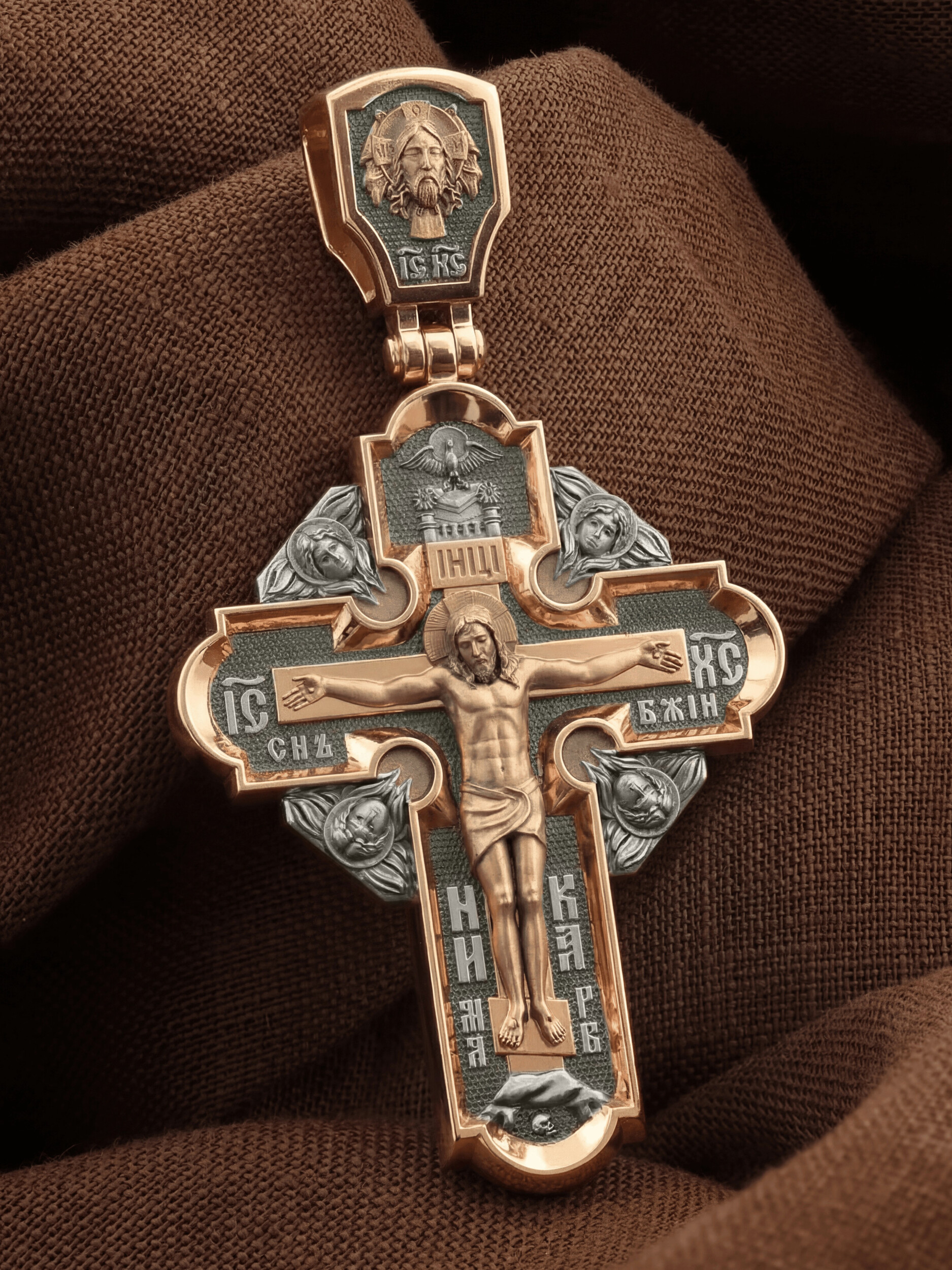 На лицевой стороне креста изображено Распятие Господа и Спасителя нашего Иисуса Христа, отдавшего Себя на смерть, чтобы другие могли жить — жить вечной жизнью, жить с Богом. Своею кровью Господь освятил крест и сделал его проводником Своей благодати, источником освящения верующих. На верхней табличке, выше головы Иисуса, расположена надпись, составленная Понтием Пилатом — «ИНЦИ». Она означает «Иисус Назорей, Царь Иудейский». Надпись «IС ХС» означает Иисус Христос помещается на разных сторонах поперечной (большой) перекладины креста. На кулонном кольце помещено изображение Духа Святого в виде голубя, сходящего с Небес
