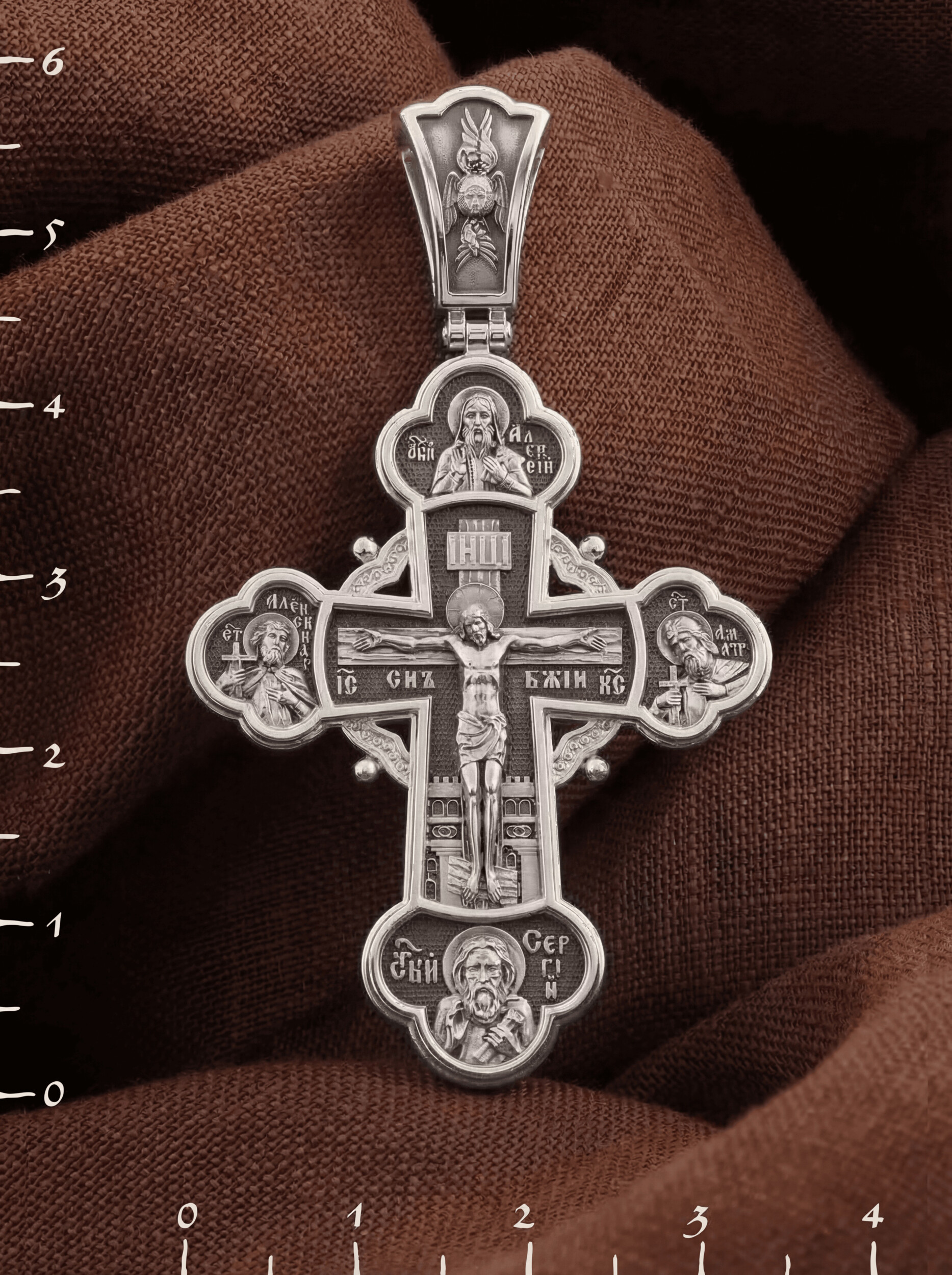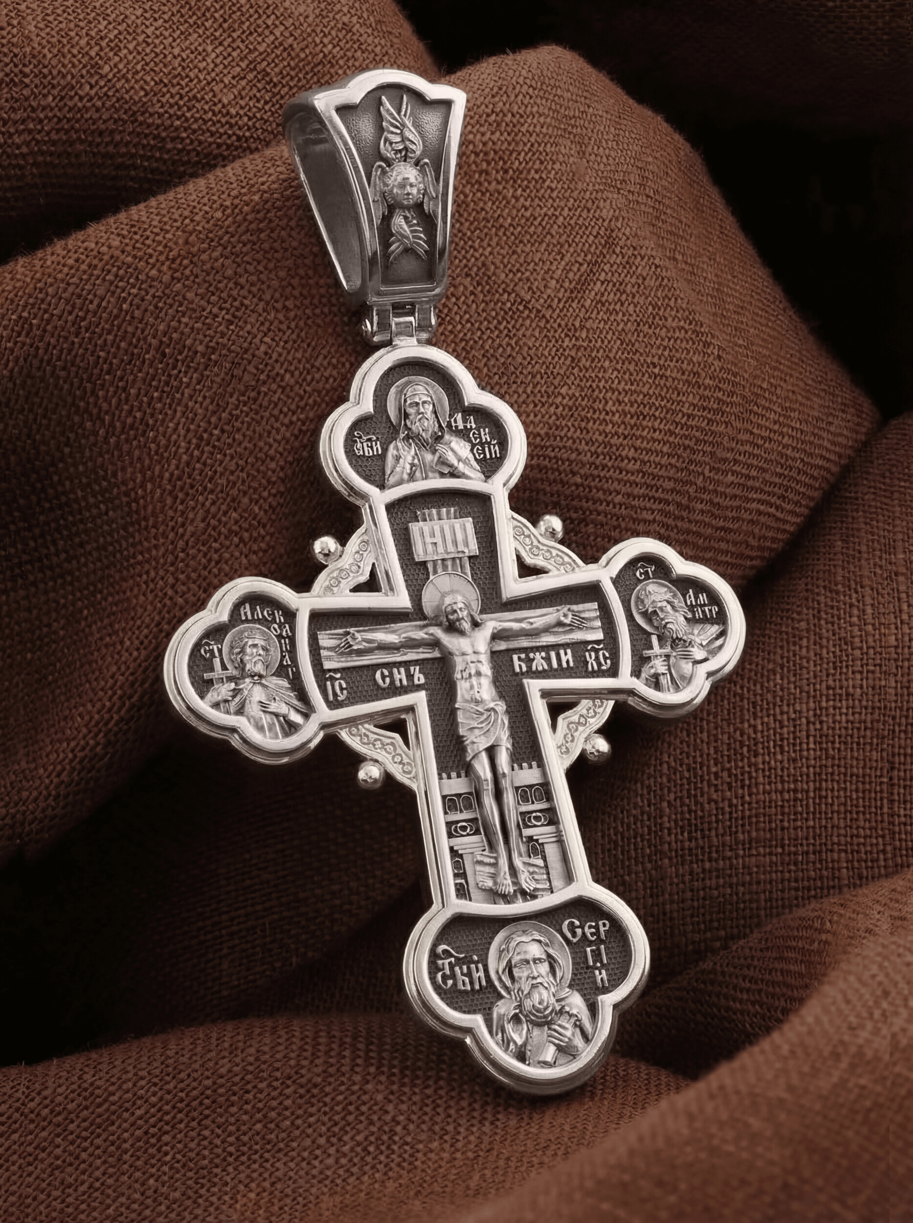 На лицевой стороне креста в центре изображено Распятие Господа Иисуса Христа. Слева от Господа находится святой благоверный князь Александр Невский, справа — святой благоверный князь Димитрий Донской. Святые князья почитаются как покровители воинов и защитники от врагов телесных и душевных. Вверху и над Распятием — образ митрополита московского святителя Алексия. Он почитается как помощник в воспитании детей и целитель, особенно при болезни глаз. Внизу — икона преподобного Сергия Радонежского, великого чудотворца и целителя. К нему обращаются в различных болезнях, тяжелых жизненных ситуациях, а также когда у детей возникают сложности в обучении.