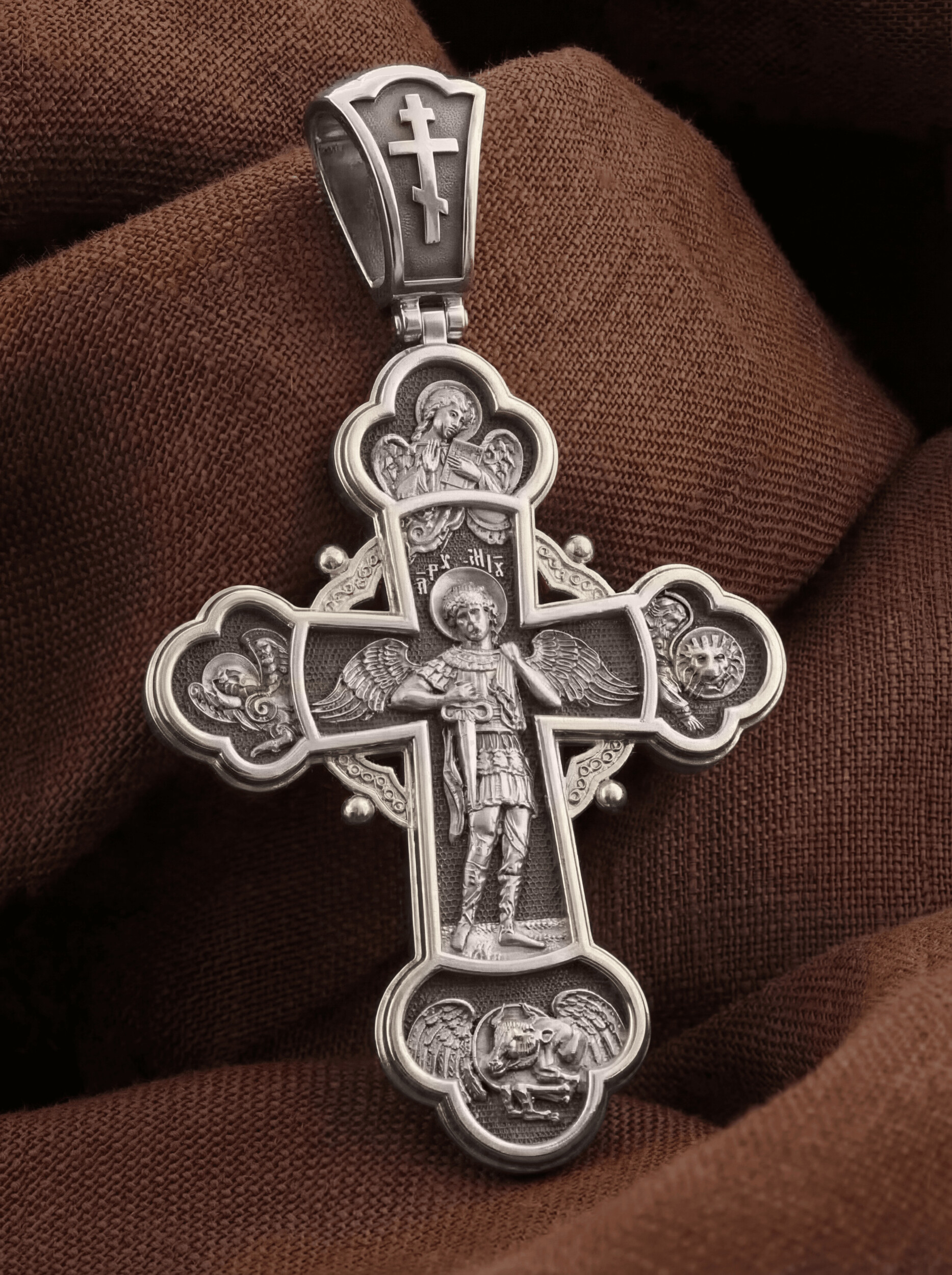 В центре оборота креста изображен Архистратиг Михаил. Могучий Архангел почитается как покровитель воинов и всех верных Богу и ведущих борьбу против сил зла, а также защитник душ умерших, страж райских врат. Над ним благословляющая десница — знак присутствия Бога. Архангел изображен в окружении символов четырех евангелистов: орел (Иоанн), лев (Марк), телец (Лука) и ангел (Матфей).