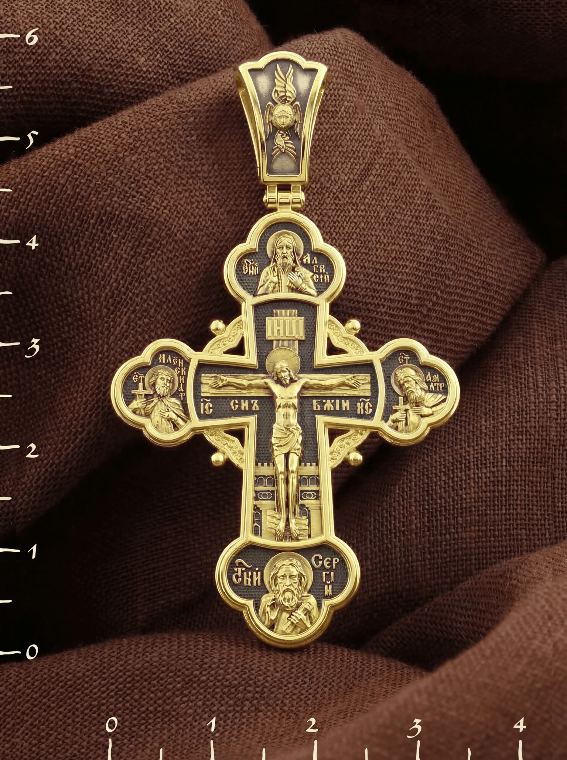 На лицевой стороне креста в центре изображено Распятие Господа Иисуса Христа. Слева от Господа находится святой благоверный князь Александр Невский, справа — святой благоверный князь Димитрий Донской. Святые князья почитаются как покровители воинов и защитники от врагов телесных и душевных. Вверху и над Распятием — образ митрополита московского святителя Алексия. Он почитается как помощник в воспитании детей и целитель, особенно при болезни глаз. Внизу — икона преподобного Сергия Радонежского, великого чудотворца и целителя. К нему обращаются в различных болезнях, тяжелых жизненных ситуациях, а также когда у детей возникают сложности в обучении.