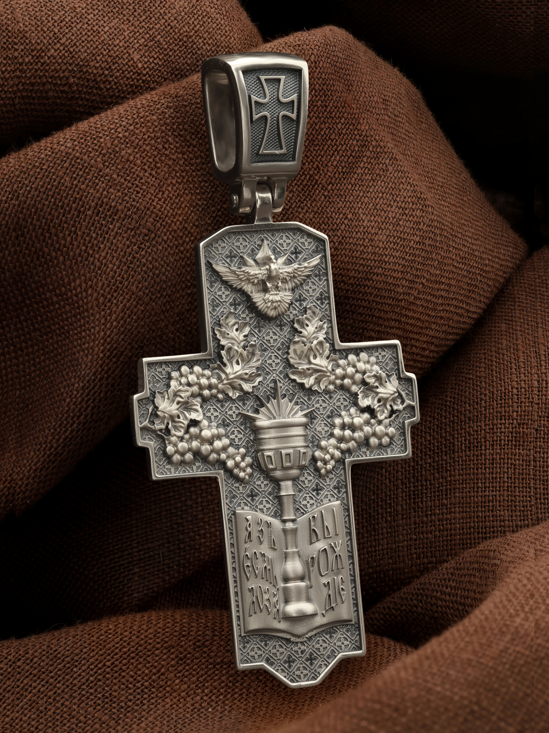 На обороте креста изображение голубя — символ Духа Святого, гроздья винограда — символы церкви и евхаристии, чаша и дискос — символ Таинства Причащения. «Я есмь лоза, — говорил Иисус Христос Своим ученикам, — а вы ветви; кто пребывает во Мне, и Я в нем, тот приносит много плода» (Ин. 15, 5), «Я есмь истинная виноградная лоза, а Отец Мой — виноградарь».
