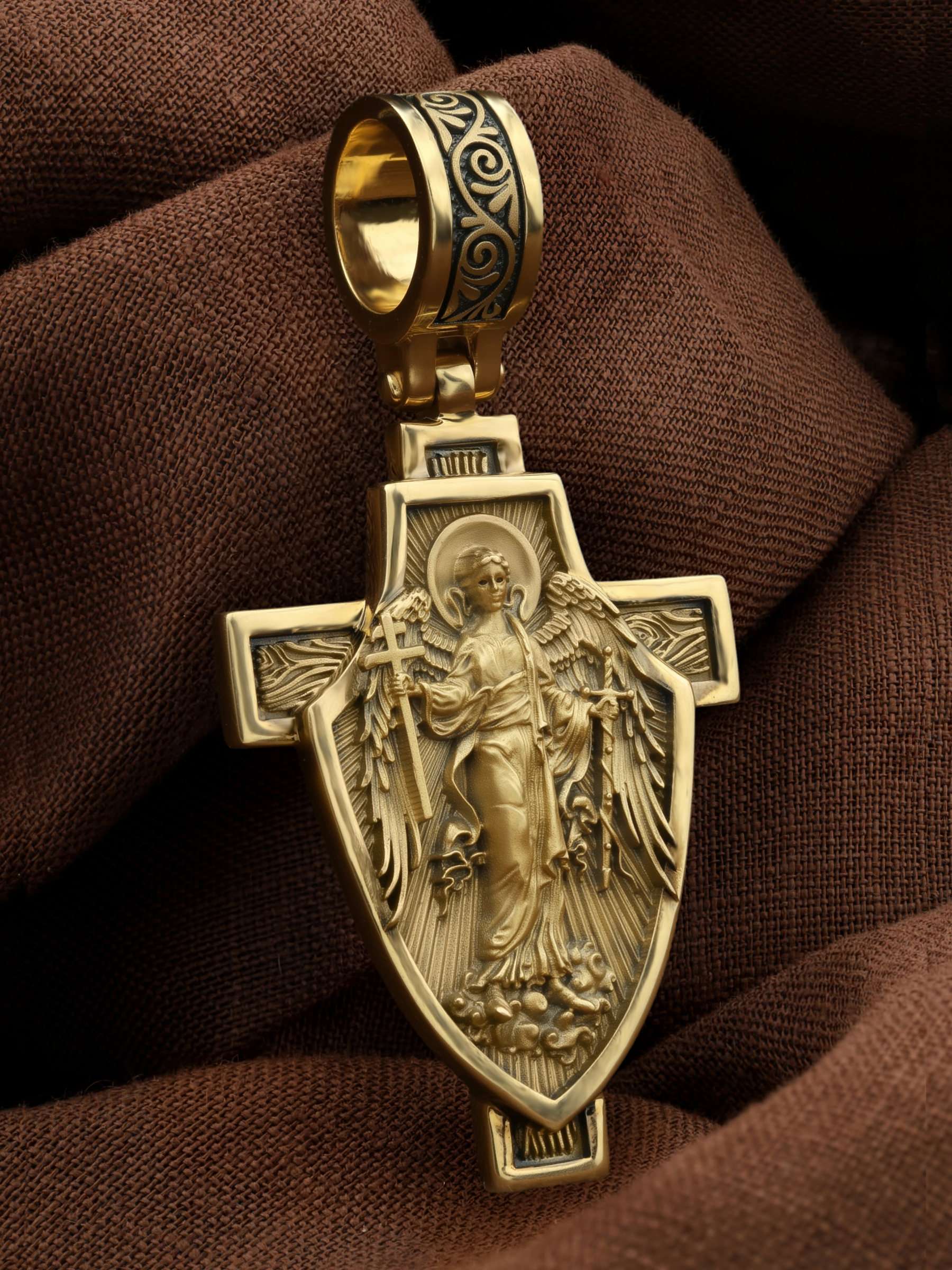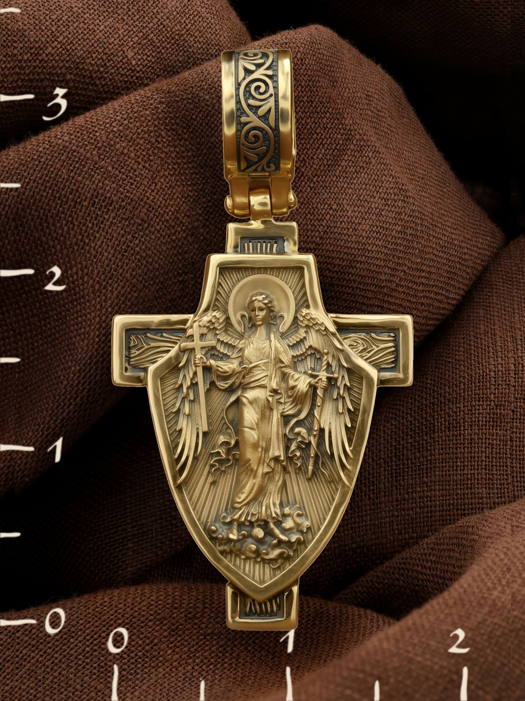 Основой композиции является изображение Святого Ангела-Хранителя держащего в правой руке крест, а в левой — мечь. Он изображен на фоне воинского щита. Крест является символом жертвенной любви всеблагого Бога к падшим людям, всепобеждающим духовным оружием христиан, основанием и средоточием церковной жизни. Господь сказал: «кто хочет идти за Мною, отвергнись себя, и возьми крест свой, и следуй за Мною». (Мк. 8: 34). Ангел-Хранитель — это Ангел приставляемый Богом к человеку при крещении для охраны и помощи в добрых делах. Он невидимо находится при человеке на протяжении всей его жизни, если человек сохраняет в себе любовь к Богу и истинную веру перед Ним. Ангел-Xранитель делают для нас все, что служит к истинному нашему благу и спасению. Невидимо пребывая при нас постоянно, он, руководствуя нас ко спасению, не только по нашему желанию таинственно наставляет нас на все доброе и полезное, не только возносит наши молитвы к Богу, но еще и сам от себя охраняют и защищают нас от врагов видимых и невидимых и ходатайствует за нас пред Богом. Ангел-Хранитель так любит нас, как никто на земле любить не может. Одного лишь каждому из нас он желает — спасения души; к этому он направляет все свои заботы. И если видит нас также заботящимися о спасении, радуется, если же видит нас пребывающими в нерадении о душе своей, скорбит. Но и самый великий грешник может примириться со своим Ангелом-Хранителем посредством искреннего раскаяния в грехах и оставления их навсегда. В таком случае, по слову Писания, великая радость бывает для всех ангелов на небесах (Лк. 15:10).