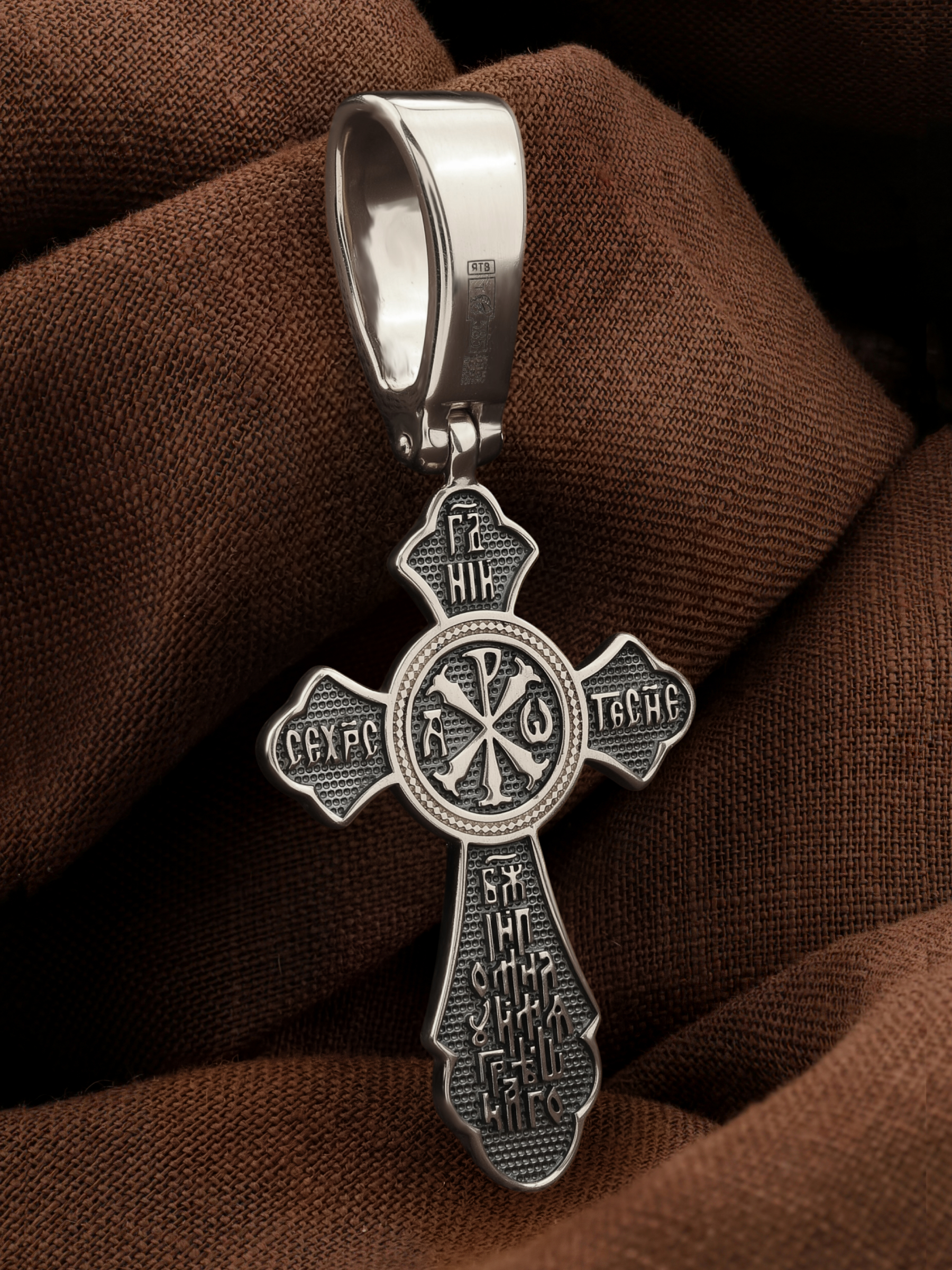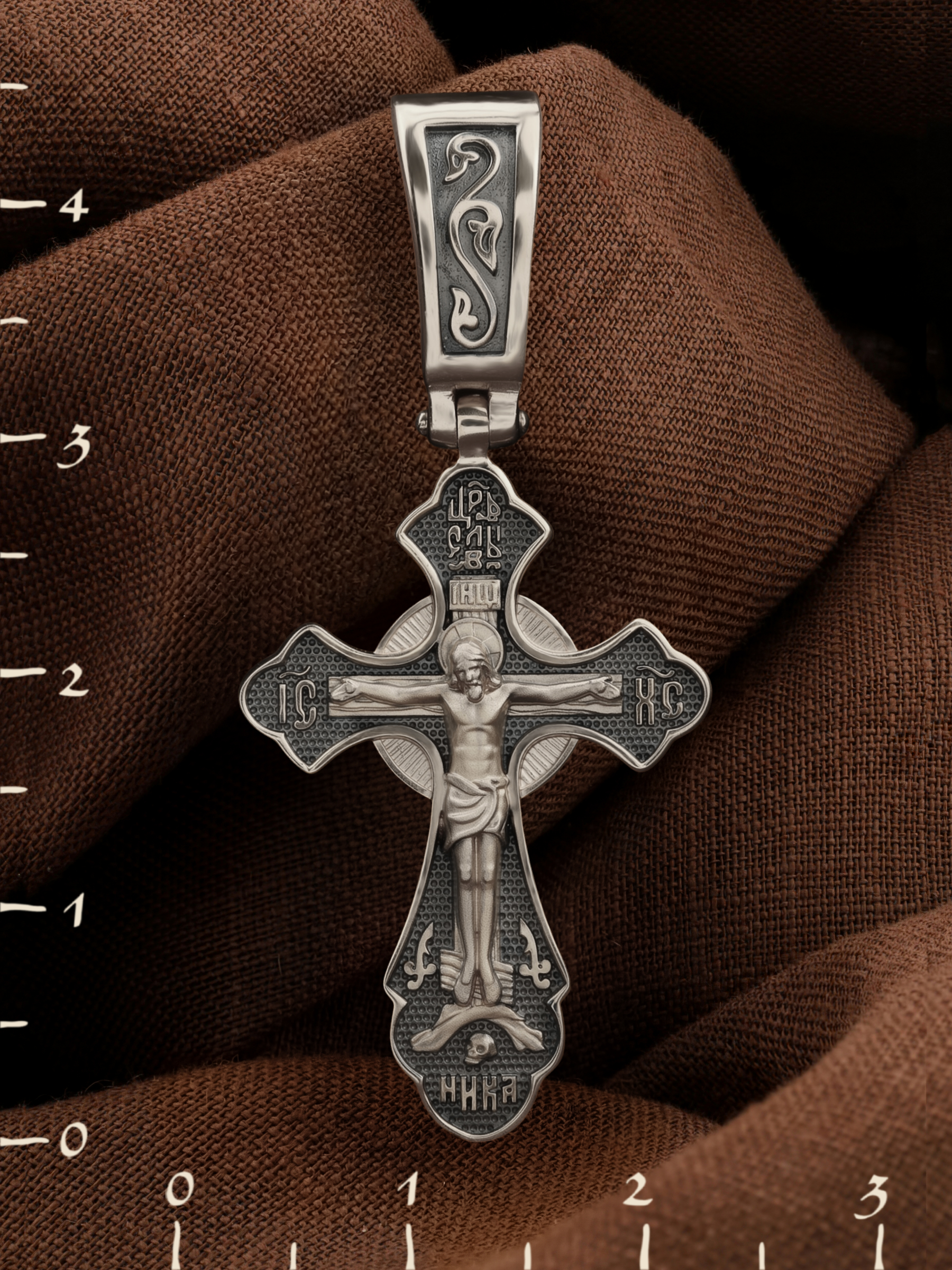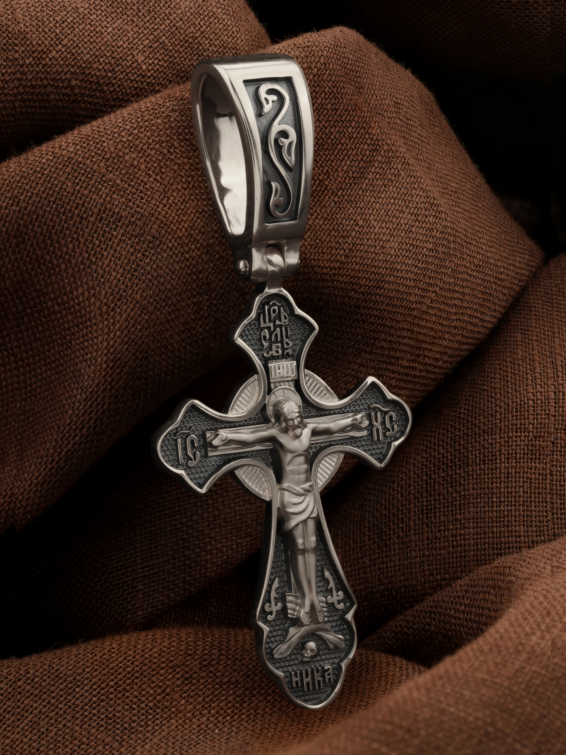 На лицевой стороне креста изображено Распятие, потому что это орудие казни Иисус Христос сделал орудием победы над грехом и смертью. Своими страданиями Он искупил грехи человечества, умерев и сошествовав во ад, победил сатану, освободил души праведников от вечной смерти и открыл им небесные врата рая. Жертва Христа сделала возможным спасение для каждого человека. На православном кресте Христос не умирает, а свободно простирает руки, ладони Иисуса открыты, будто он хочет обнять все человечество, даря им свою любовь и открывая путь к вечной жизни. Над титлом видим слова «ЦРЬ СЛВЫ» — Царь Славы. Верхняя перекладина символизирует собой табличку с надписью «IHЦI» — Иисус Назарянин Царь Иудейский. Над перекладиной пишется сокращенно имя Спасителя «IC XC» — Иисус Христос. В нижней части располагается надпись «НИКА» (греч. — Победитель). Возвышение, на котором стоит Крест, символизирует гору Голгофу, на которой произошло Распятие. У подножия Креста изображают прах Адама, обозначенный черепом.