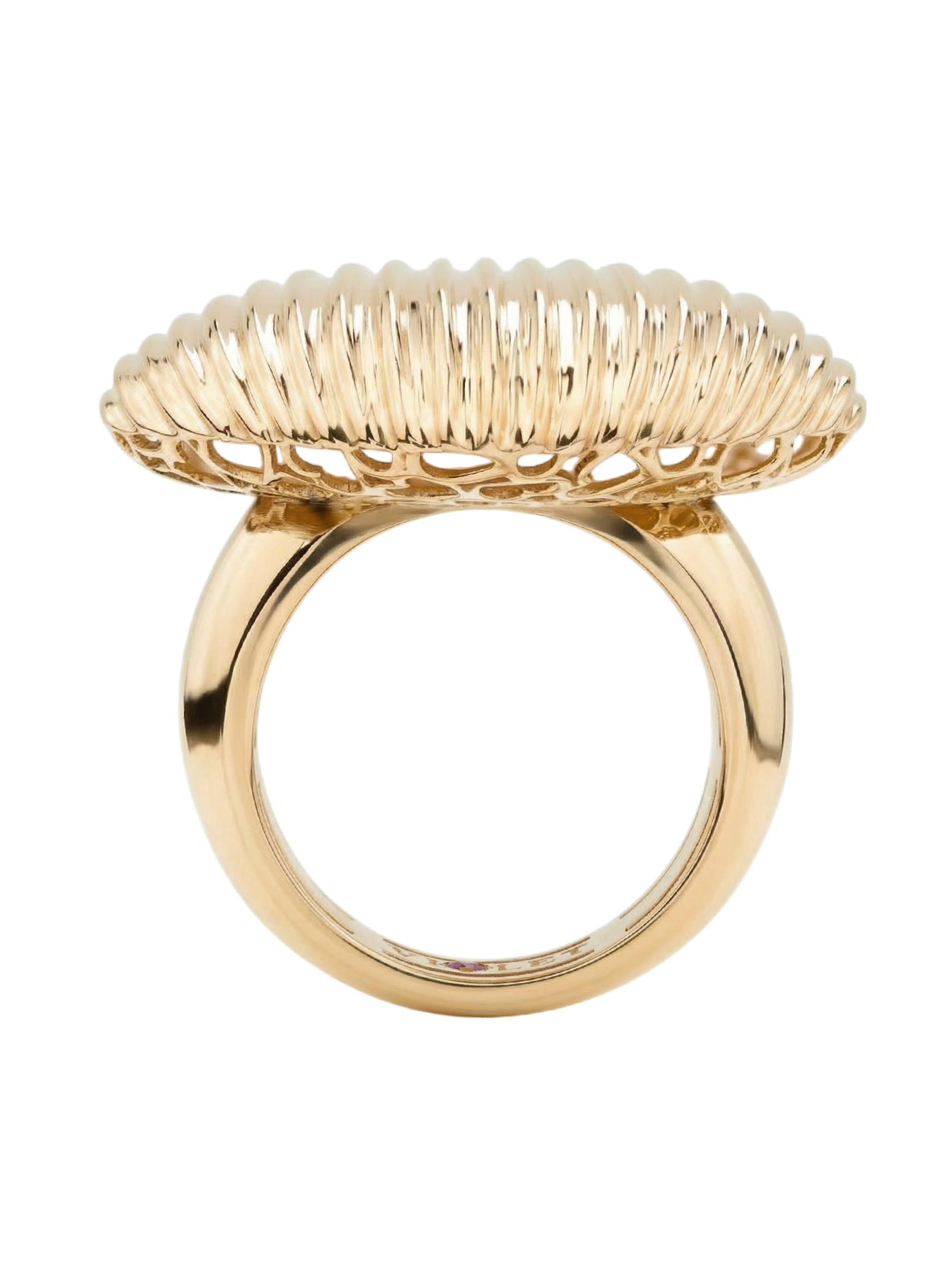 Главная особенность украшения — единственная вставка в виде рубина круглой формы насыщенного красного цвета. Этот яркий акцент добавляет кольцу глубины и интриги. Такое украшение универсально: оно подходит как для женщин, так и для мужчин, предпочитающих смелые и концептуальные ювелирные решения. Массивная, но элегантная форма позволяет носить кольцо как самостоятельный аксессуар или в сочетании с другими изделиями из этой серии, создавая стильные комплекты.