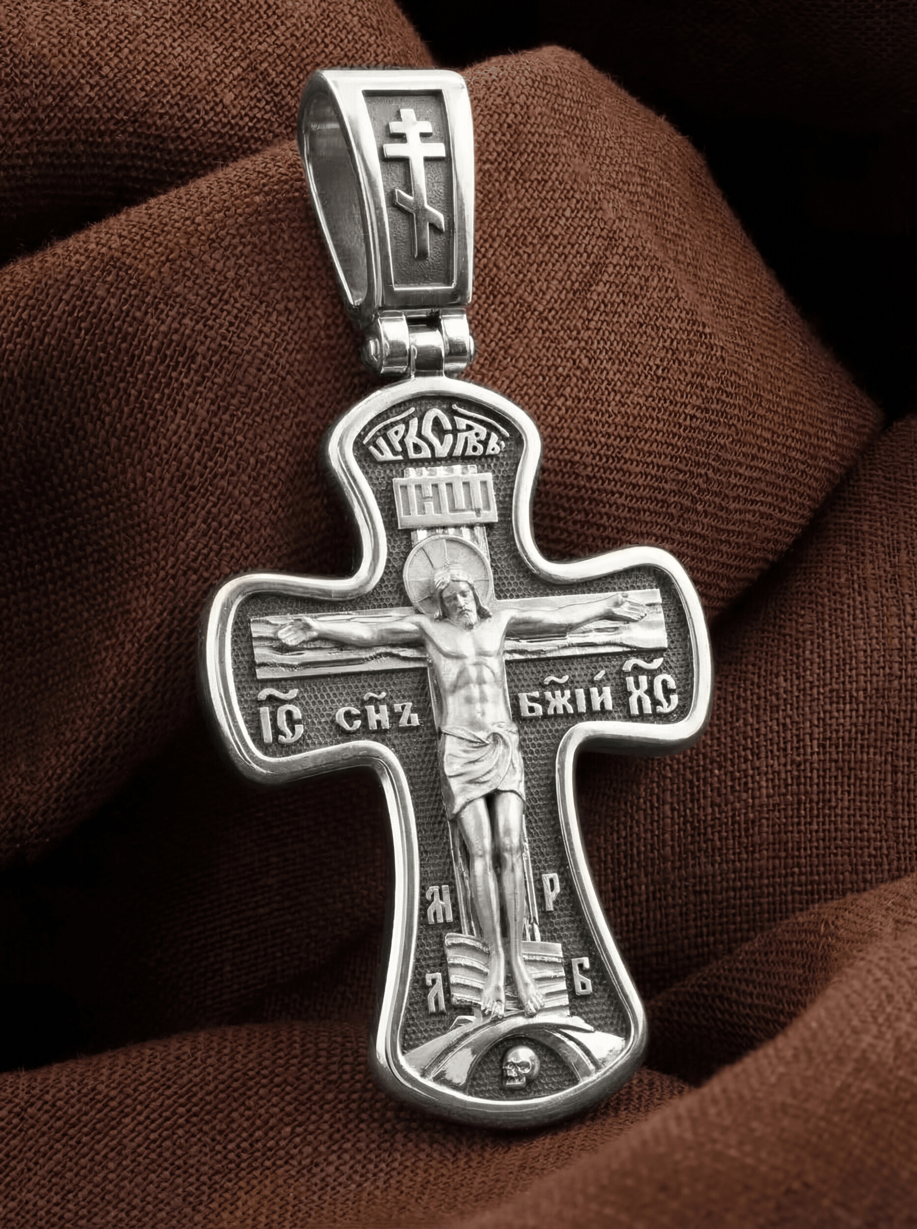 Основой композиции лицевой стороны креста является Распятие Иисуса Христа. С обеих сторон горизонтальной перекладины надписи: монограмма святого имени Христа — «ИС ХС», а под ней «Сын Божий». Над головой Господа на поперечной перекладине аббревиатура «IНЦI», что символизирует «Иисус Назорей Царь Иудейский». Венчает лицевую сторону креста надпись «Царь Славы». В подножии мы видим изображенную гору Голгофу в виде скалистой горки, а так же буквы «МЛ» «РБ», которые означают: «Место Лобное Рай Бысть». Крест стоит на горе камней, символизирующих Голгофу, в основании которой различается череп. Это голова Адама.