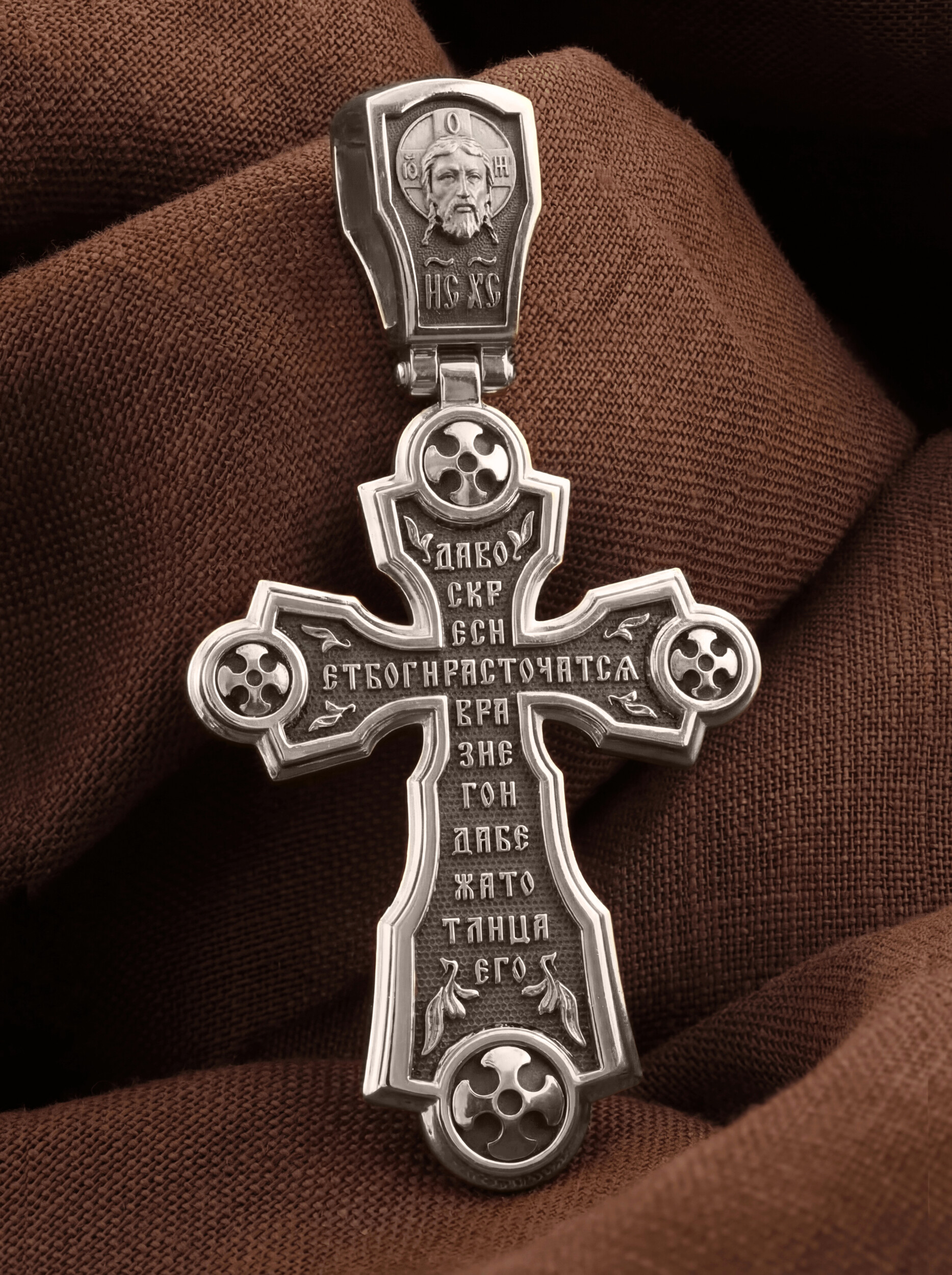 Всю оборотную часть креста занимает начальный стих оградительной молитвы Честному Кресту Господню: «Да воскреснет Бог, и расточатся врази Его, и да бежат от лица Его…».