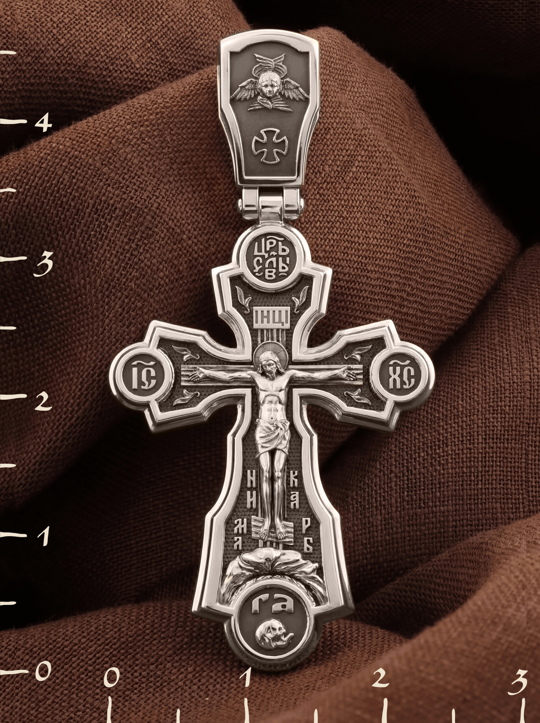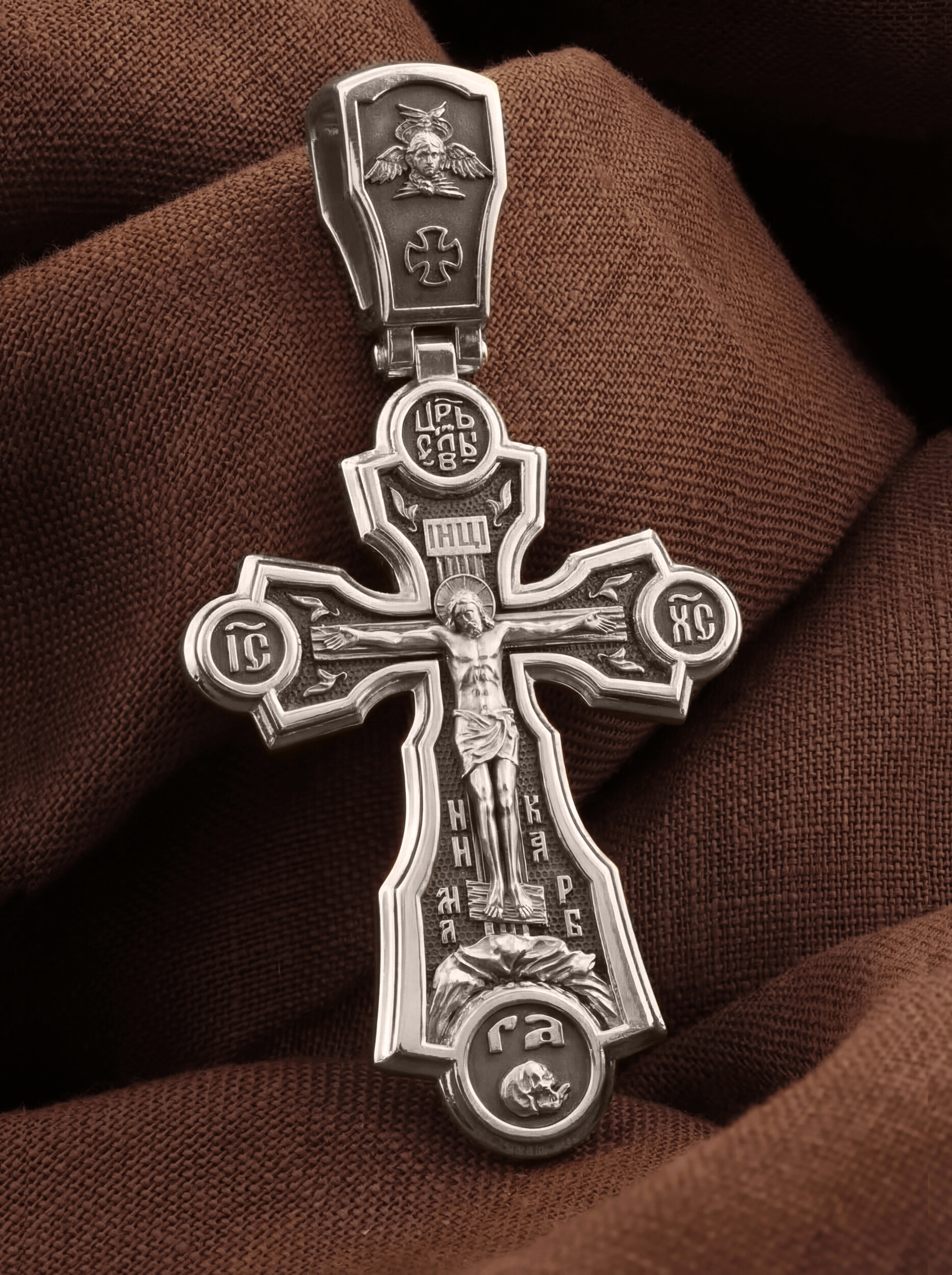 На лицевой стороне креста изображено Распятие Господа нашего Иисуса Христа. В традиции Православия принято изображать Спасителя как Воскресшего Крестоносителя, призывающего в Свои объятия все концы мира. Крест стоит на горе камней, символизирующих Голгофу, в основании которой различается череп. Это голова Адама. Он обозначен буквами «Г» и «А». Над головой Господа на поперечной перекладине аббревиатура «IНЦI», что символизирует табличку, которая была прибита к Кресту, с надписью «Иисус Назорей Царь Иудейский». Этим иудеи хотели посмеяться над Христом, не зная, что распинают истинного Царя всех царей. По бокам поперечной перекладины-титлы святого имени Христа «IC» (Иисус) «ХС» (Христос), и слово «НИКА», что в переводе с греческого означает «победитель». Венчает лицевую сторону креста надпись «ЦС» — «Царь Славы».