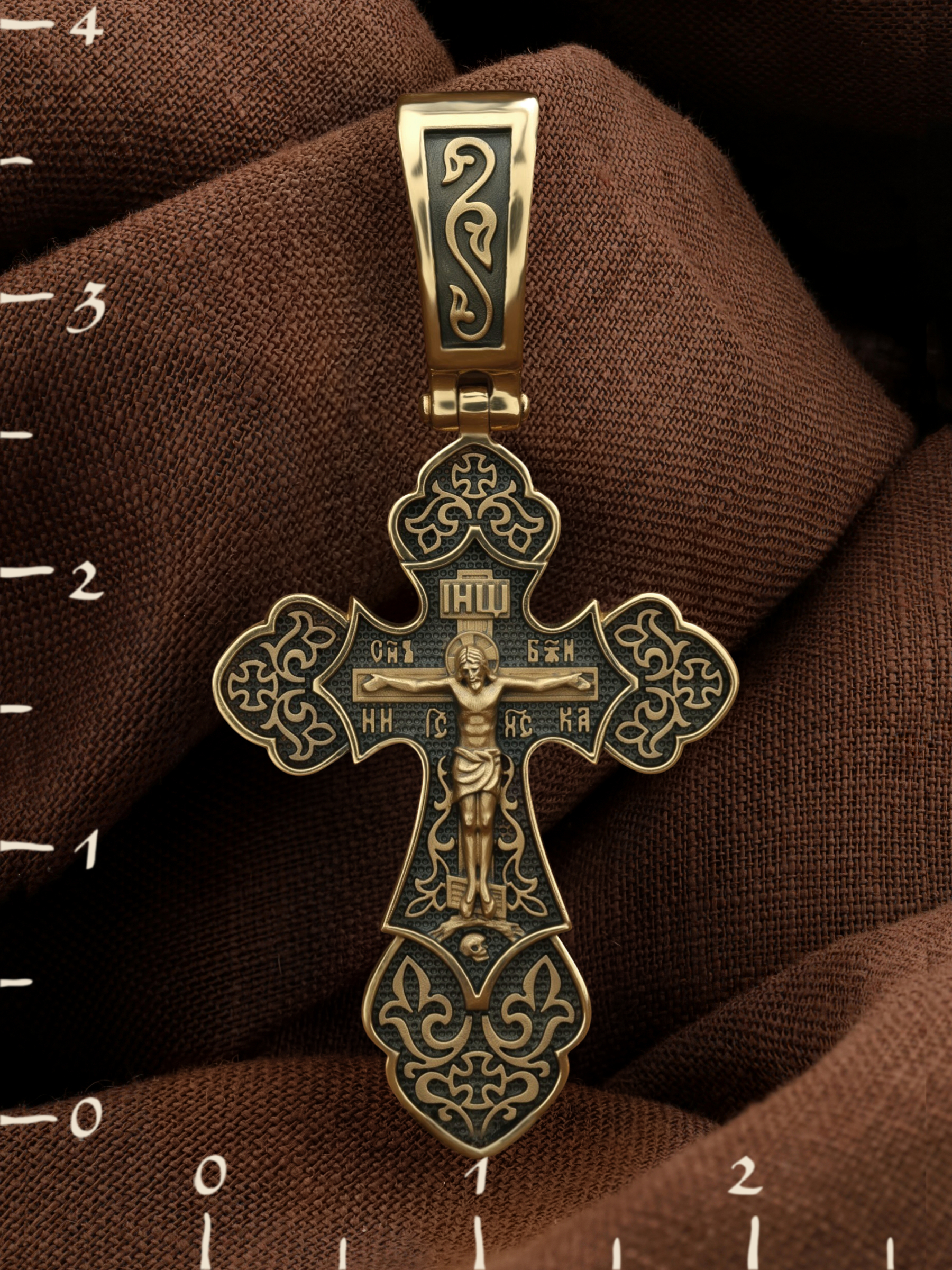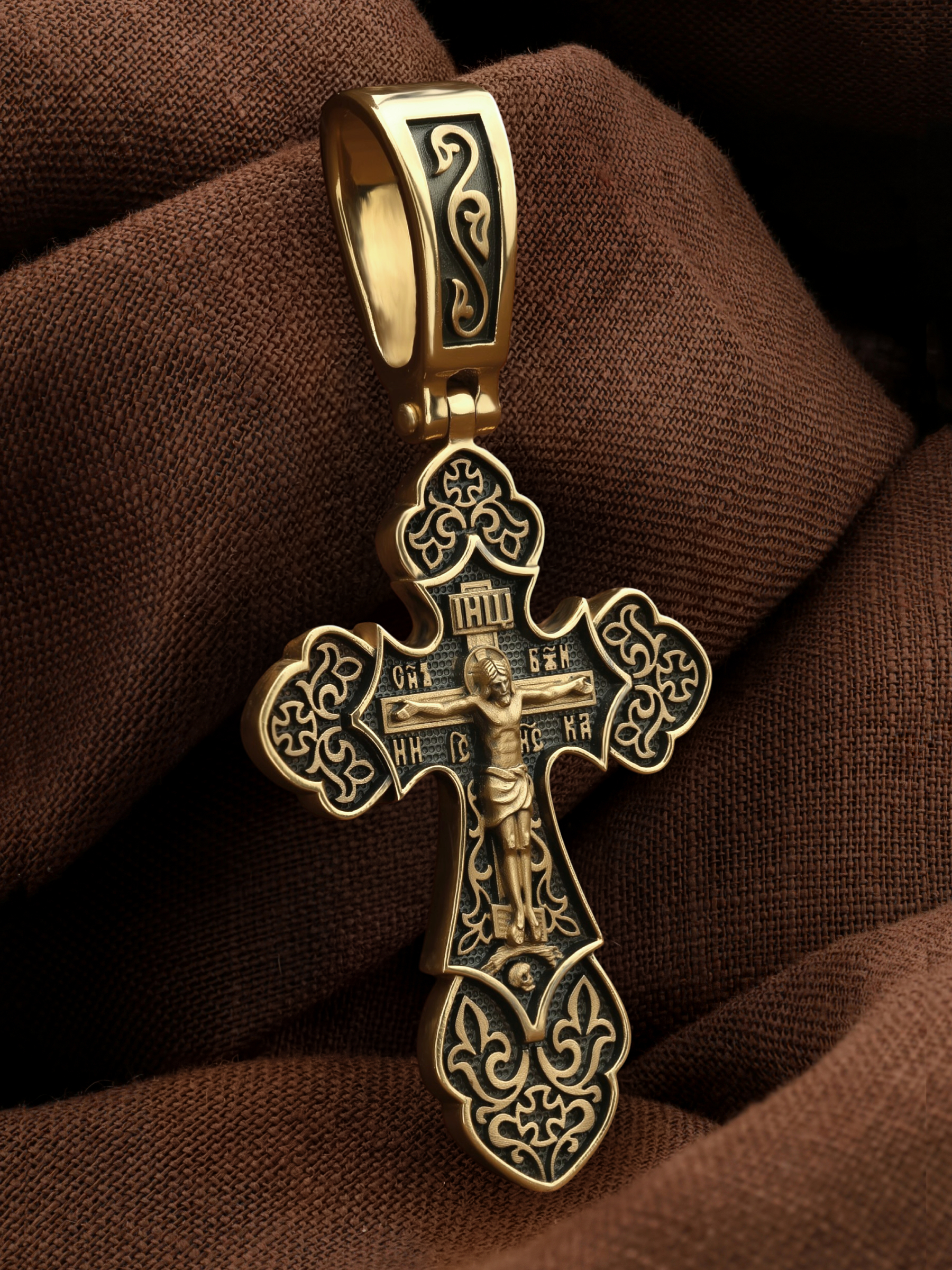 Крест с рельефным изображением Распятия в окружении пышных цветов и ажурного узора, напоминает нам о красоте Райского сада. На лицевой стороне креста изображено Распятие, потому что это орудие казни Иисус Христос сделал орудием победы над грехом и смертью. Своими страданиями Он искупил грехи человечества, умерев и сошествовав во ад, победил сатану, освободил души праведников от вечной смерти и открыл им небесные врата рая. Жертва Христа сделала возможным спасение для каждого человека. На православном кресте Христос не умирает, а свободно простирает руки, ладони Иисуса открыты, будто он хочет обнять все человечество, даря им свою любовь и открывая путь к вечной жизни. Верхняя перекладина символизирует собой табличку с надписью «IHЦI» — Иисус Назарянин Царь Иудейский. Над перекладиной пишется словосочетание «СЫН БОЖИЙ», ниже перекладины добавляется: «НИКА» (греч. — Победитель) и сокращенное имя Спасителя «IC XC» — Иисус Христос. Возвышение, на котором стоит Крест, символизирует гору Голгофу, на которой произошло Распятие. У подножия Креста изображают прах Адама, обозначенный черепом.