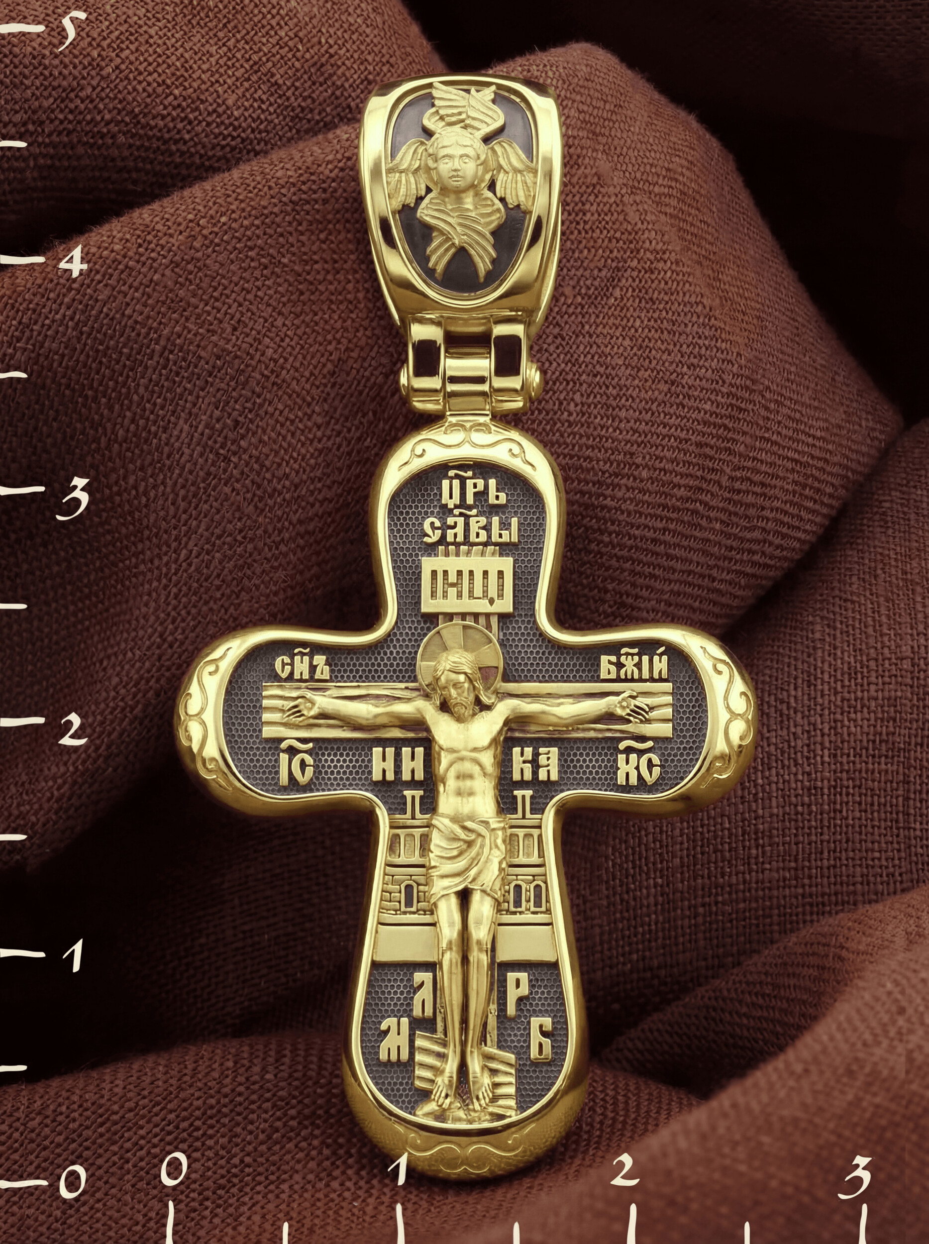 На лицевой стороне креста изображено Распятие Иисуса Христа. Рядом с Его образом помещены слова «Царь Славы». Они характеризуют Господа как Великого Архиерея, победителя смерти. Верхняя перекладина символизирует титло — табличку, на которой, согласно Евангелию, было начертано: Иисус Назорей Царь Иудейский (IНЦI). Также Распятие сопровождается надписями, олицетворяющими Христа. Это святое имя Христа «IC» (Иисус) «ХС» (Христос) и словосочетание «Сын Божий». Рядом с Его образом помещены слова — «НИКА» (греч. — Победитель).У подножия Креста изображают прах Адама, обозначенный черепом. Возвышение, на котором стоит Крест, символизирует гору Голгофу, на которой произошло Распятие. У подножия Креста изображают прах Адама, обозначенный черепом.