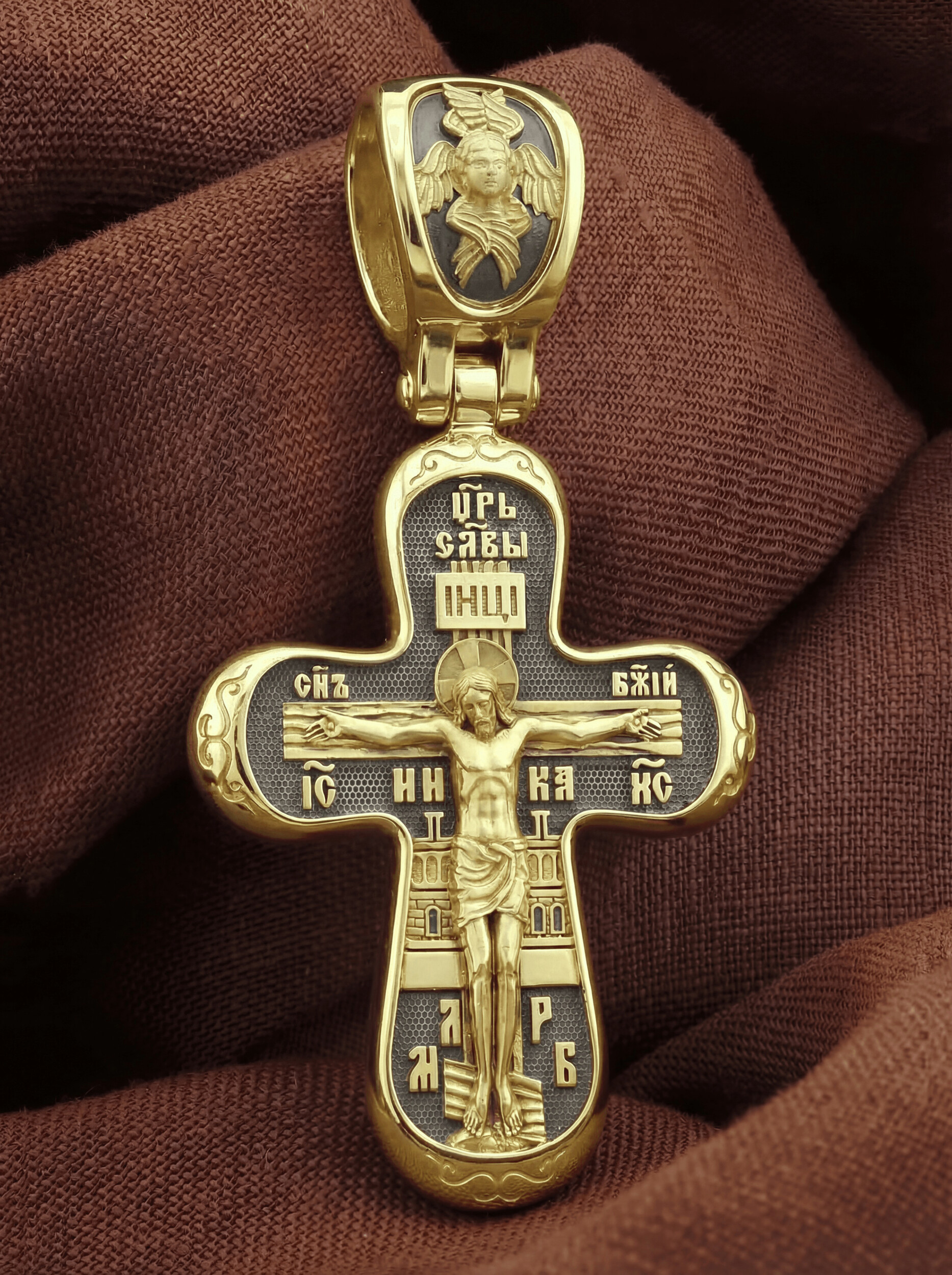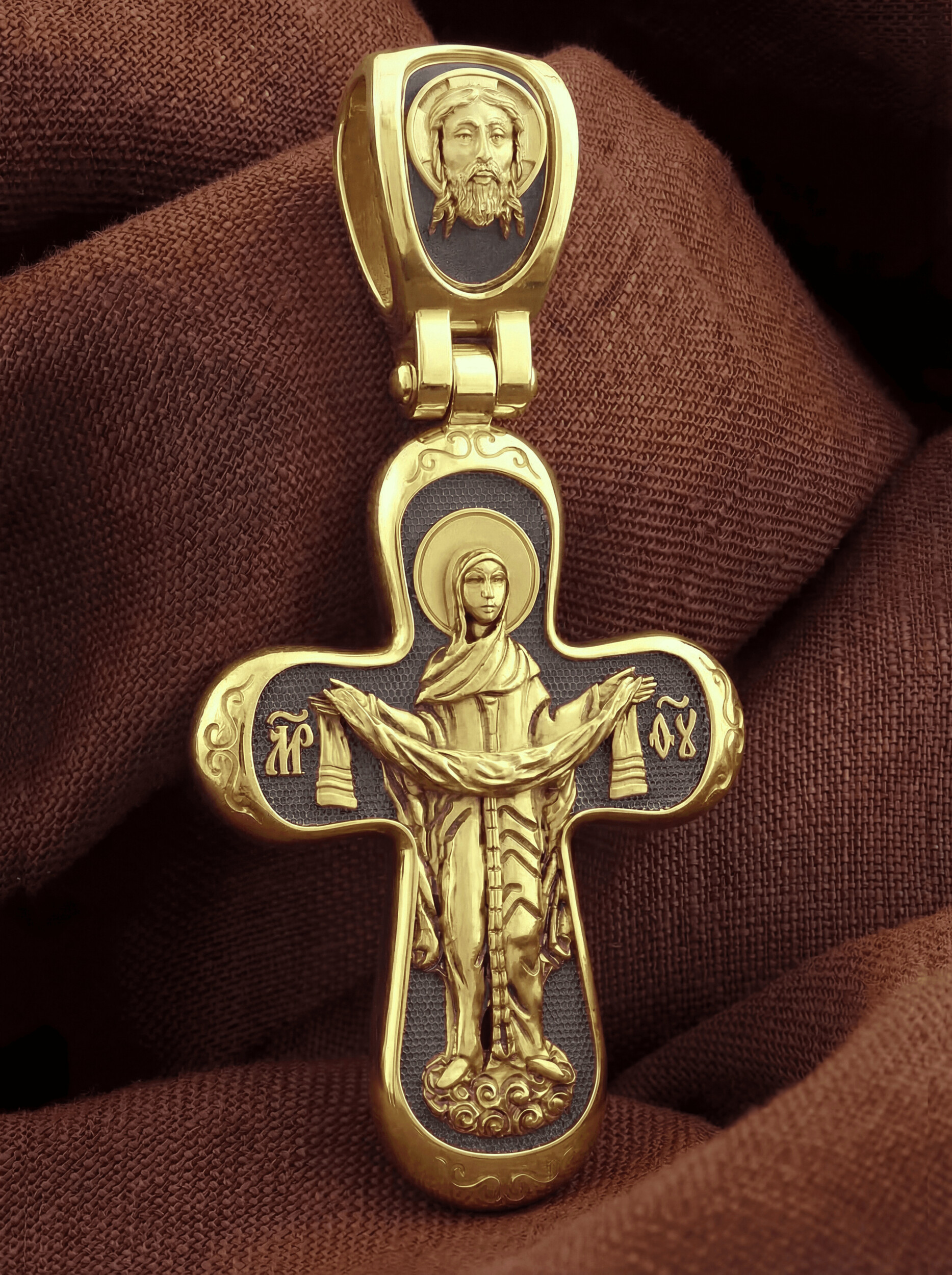 На обороте креста изображена икона Покрова Пресвятой Богородицы. Праздник Покрова Божией Матери является воспоминанием чуда, которое произошло во Влахнернской церкви 1 (14) октября 910 года: Пресвятая Богородица явилась верующим над алтарем храма и распростерла над ними Свое покрывало. В этот день Божья Матерь открыла людям, что Она является Ходатаицей за них перед Богом. Богородица простирает Свой молитвенный покров над всеми православными христианами и умоляет Сына Своего о даровании вечного спасения каждому человеку. На кулонном кольце изображен Спас Нерукотворный — Символ вочеловечившегося Божества и шестикрылый Серафим — самый приближенный к Господу Ангел.