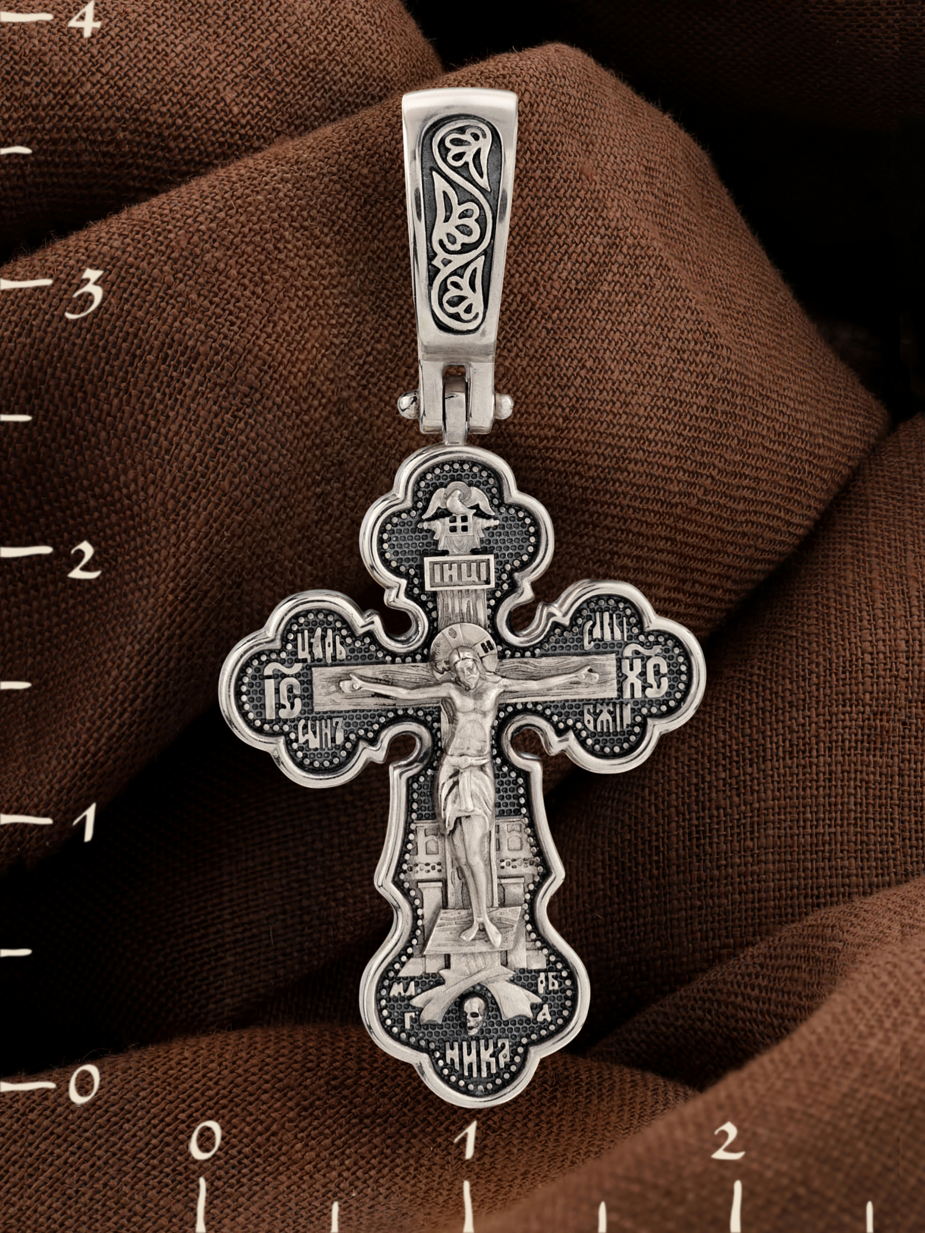 На лицевой стороне креста изображено Распятие Господа и Спасителя нашего Иисуса Христа. Христос, подвергнутый на кресте мучительной казни, своими страданиями искупил нас от древнего греха и даровал нам жизнь вечную. На верхней табличке, выше головы Иисуса, расположена надпись, составленная Понтием Пилатом — «IНЦI». Она означает «Иисус Назорей, Царь Иудейский». Распятие сопровождается каноническими надписями. Надпись «IС ХС» означает Иисус Христос, надпись «Царь Славы» и словосочетание «СЫН БОЖИЙ», что означает божественную природу Иисуса Христа, помещаются на разных сторонах поперечной перекладины креста. В нижней части креста находятся надписи –«НИКА» и «МЛРБ». В переводе с греческого, слово «НИКА» означает «победитель». Именно оно является символом победы Христа над смертью. Надпись «МЛРБ» — «место лобное рай бысть» означает, что место лобное стало раем. Крест стоит на горе камней, символизирующих Голгофу. Под подножием Креста изображена покоящаяся голова (череп) Адама и надпись «Г.А.». Христос в Своей Божественной любви, над которой смерть не властна и которая, страдая, и не страдает в обычном смысле, простирает к людям со Креста Свои объятия, в которые призывается и привлекается весь мир. Поэтому Тело Его не висит, а торжественно покоится на Кресте.