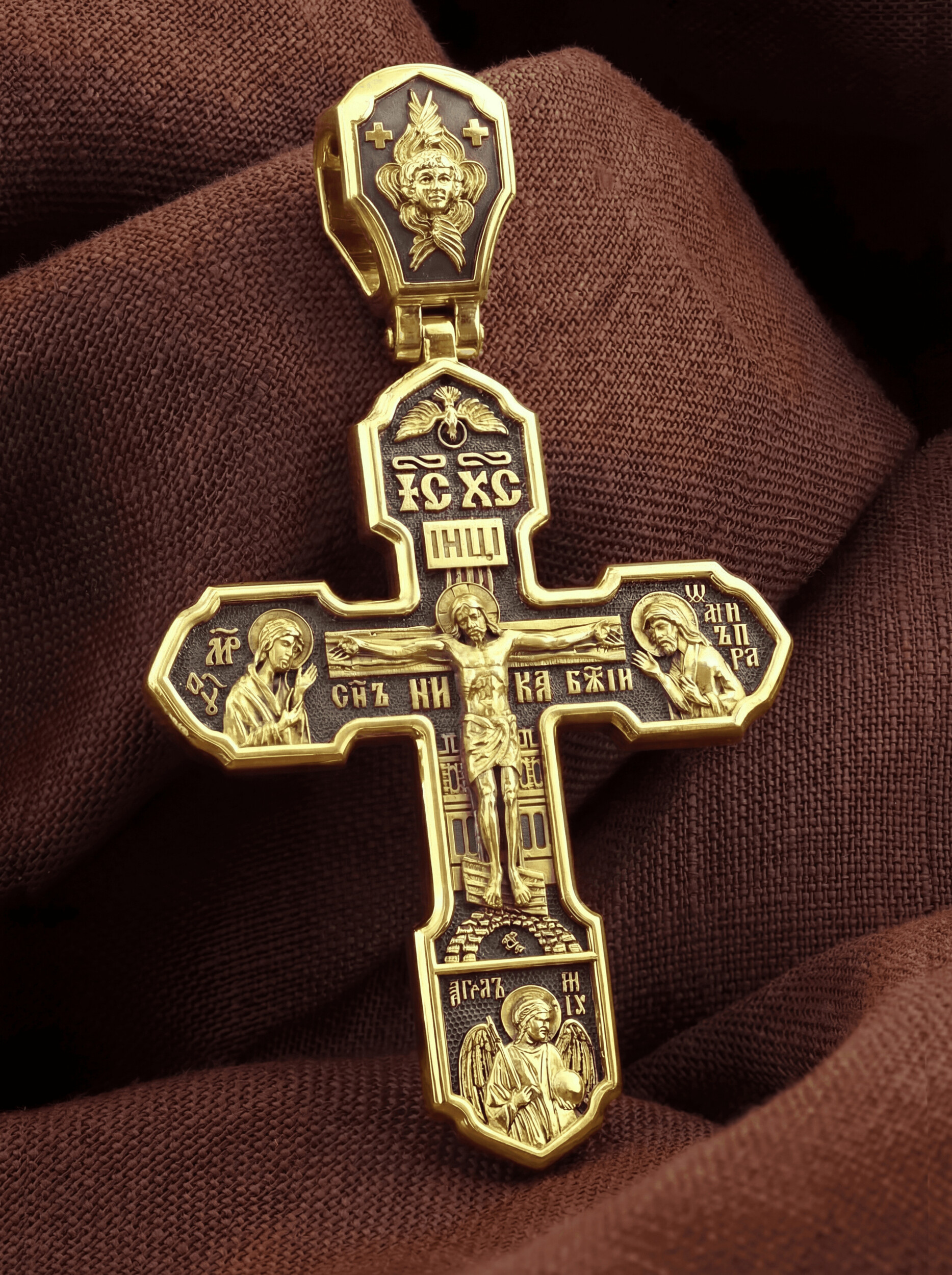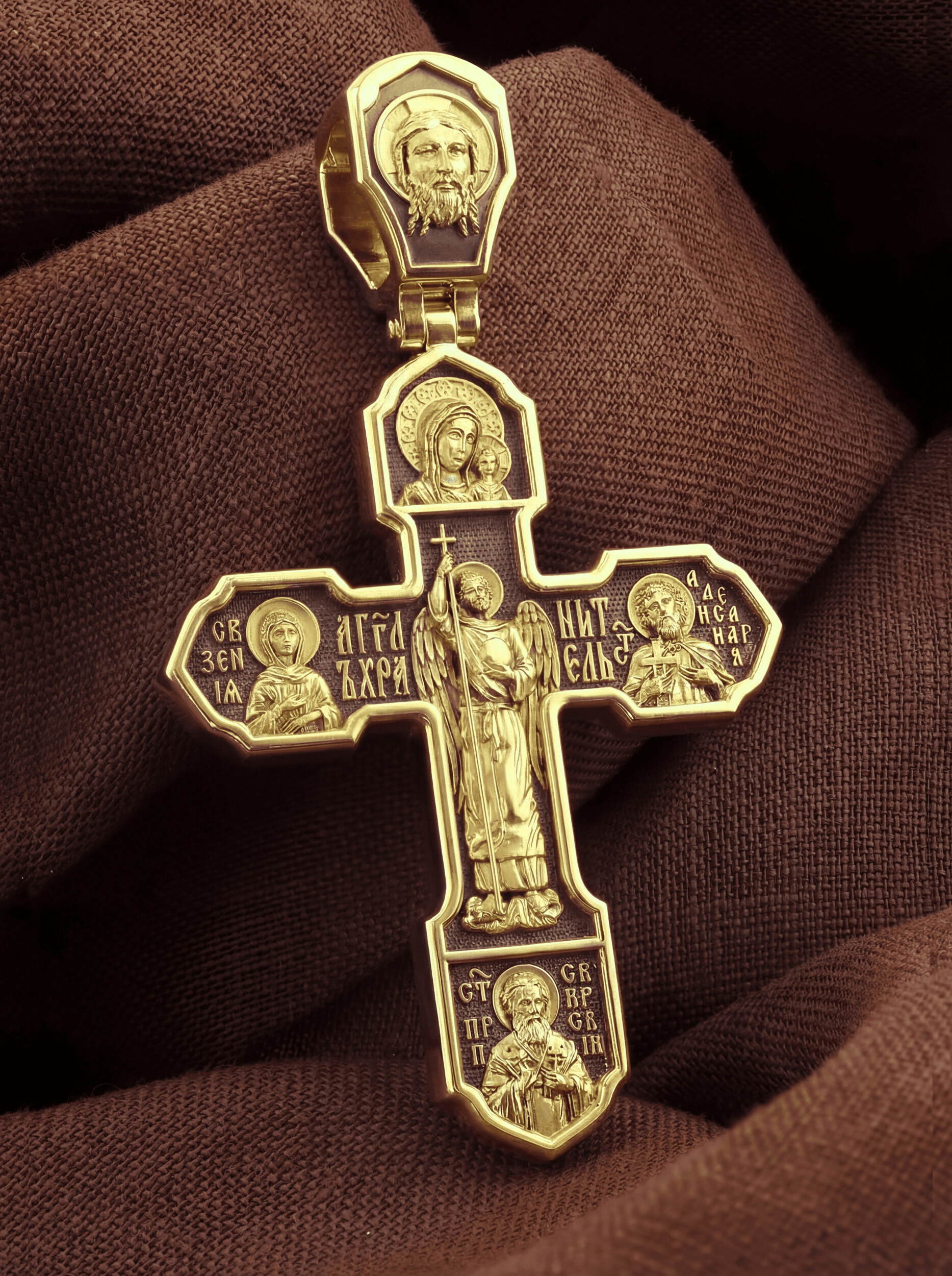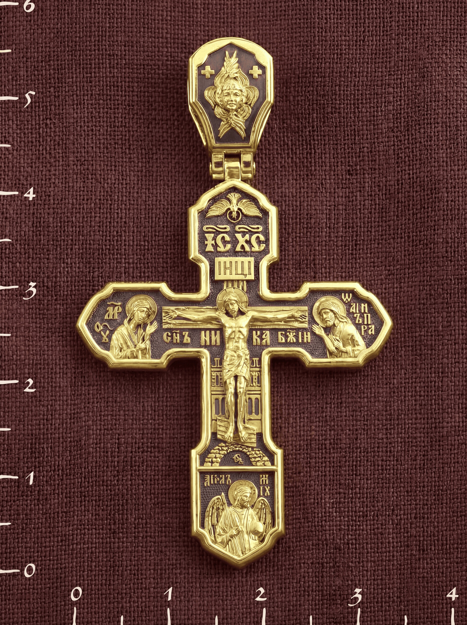 На лицевой стороне изображено Распятие Господа Иисуса Христа, над вершиной которого помещены титлы Его святого имени — «ИС ХС». Под основной перекладиной надписи — «НИКА», что в переводе с греческого означает «победитель», и словосочетание «СЫН БОЖИЙ», что означает божественную природу Иисуса Христа. С двух сторон Христу предстоят Пресвятая Богородица и св. Андрей Первозванный. Внизу — образ Архангела Михаила, могучего защитника от злых сил. Это он низверг дьявола и встал во главе ангелов для борьбы с бесовскими силами. Его имя означает «Кто яко Бог?».