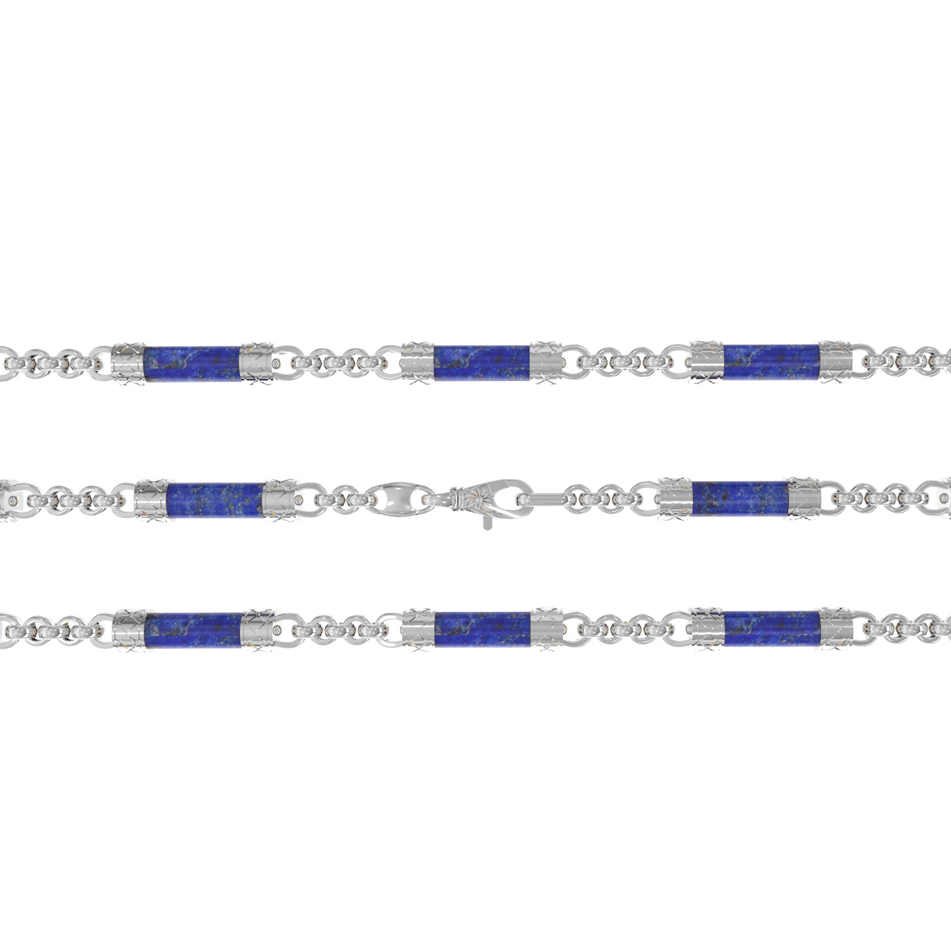 Особую художественную выразительность цепи придают 86 вставок из лазурита, выполненных в строгой форме цилиндра. Каждое звено проработано с вниманием к деталям, обеспечивая комфортное ношение и долговечность изделия. Такая цепь станет центральным элементом вашего образа, привлекая внимание своей лаконичной роскошью.