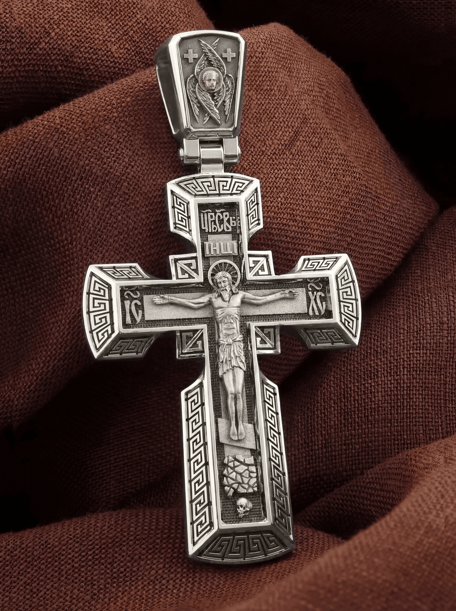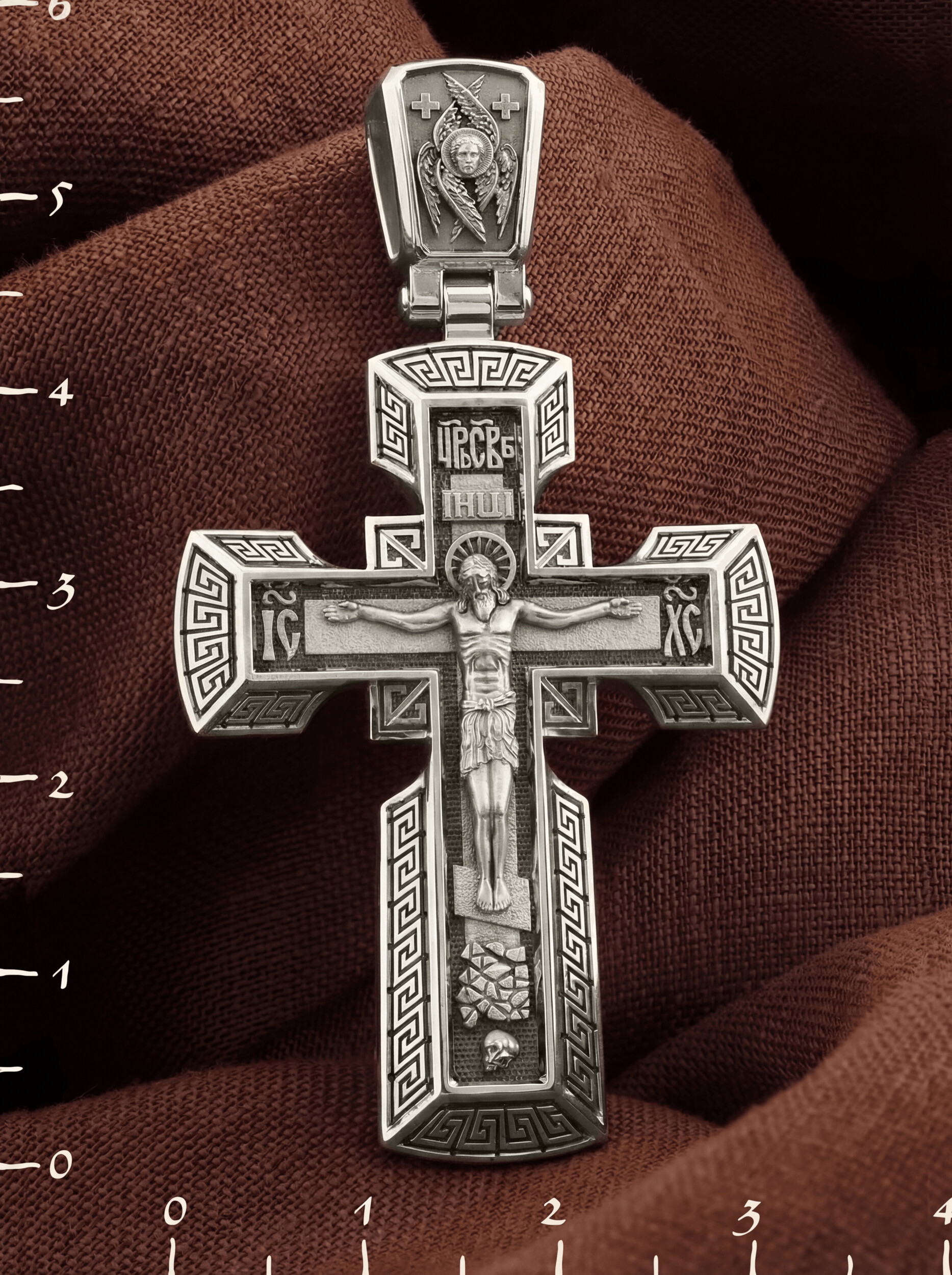 На его лицевой стороне изображено Распятие Господне на восьмиконечном Голгофском кресте. Над головой Спасителя на поперечной перекладине помещена надпись «IНЦI», которая является сокращенным выражением титла, установленного на Кресте Понтием Пилатом: «Иисус Назорей Царь Иудейский». На боковых оконечностях креста вписаны инициалы святого имени Христа «IС ХС». В верхней оконечности креста имеется монограмма «Царь Славы», которая гласит о том, что Христос — Великий Архиерей, Царь и Жертвенный Агнец, искупивший грехи мира. У подножия креста в виде каменистого пригорка изображена гора Голгофа с Главой Адамовой в пещере.