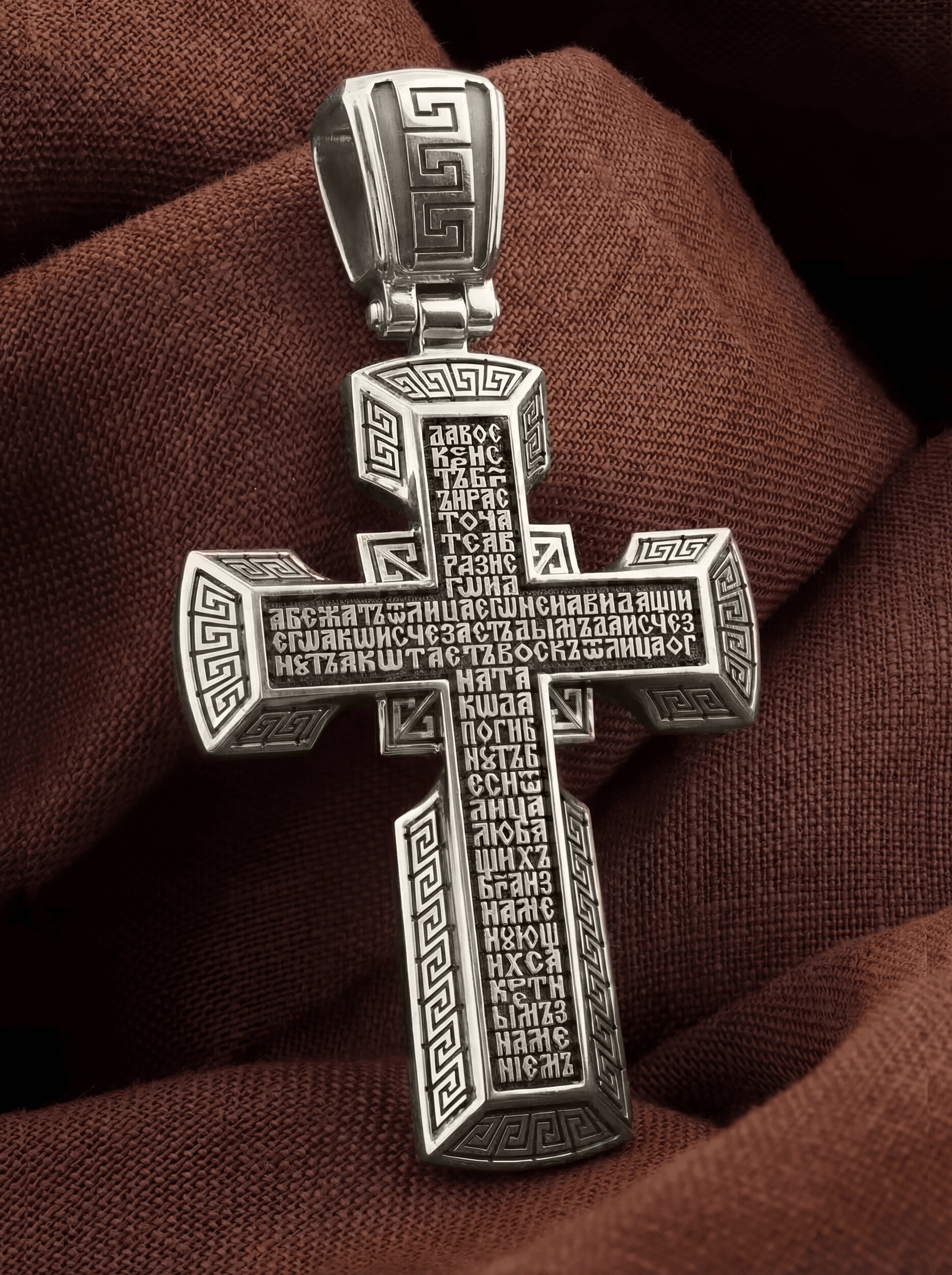 На обороте креста написан начальный стих оградительной молитвы Честному Кресту Господню. Эту молитву читают в опасности, а также носят при себе для защиты от злых сил: «Да воскреснет Бог, и расточатся врази Его, и да бежат от лица Его ненавидящии Его. Яко исчезает дым, да исчезнут; яко тает воск от лица огня, тако да погибнут беси от лица любящих Бога и знаменующихся крестным знамением, и в веселии глаголющих: радуйся, Пречестный и Животворящий Кресте Господень, прогоняй бесы силою на тебе пропятаго Господа нашего Иисуса Христа, во ад сшедшаго и поправшаго силу диаволю, и даровавшаго нам тебе Крест Свой Честный на прогнание всякаго супостата. О, Пречестный и Животворящий Кресте Господень! Помогай ми со Святою Госпожею Девою Богородицею и со всеми святыми во веки. Аминь».