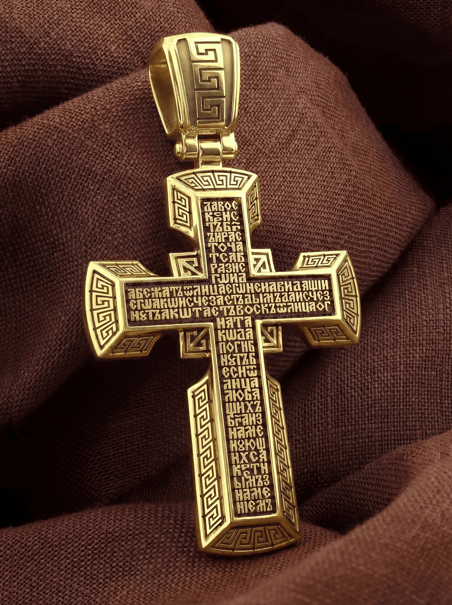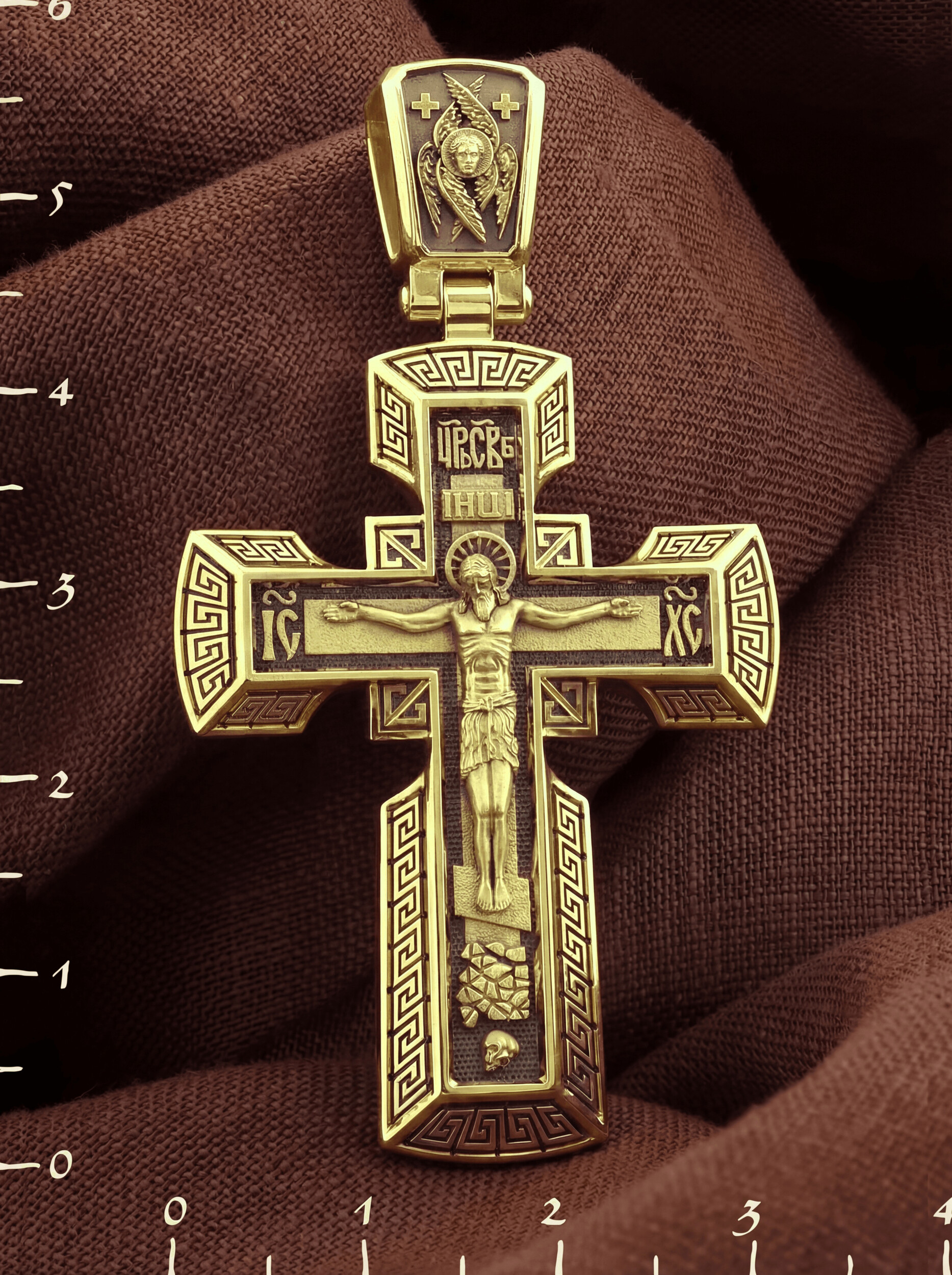 Рамка, украшенная византийским орнаментальным мотивом, обрамляет простой и очень традиционный нательный крест.