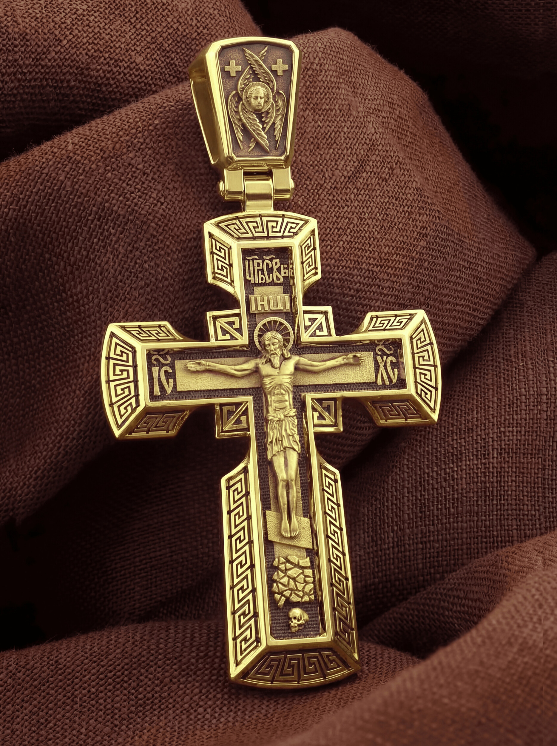 На его лицевой стороне изображено Распятие Господне на восьмиконечном Голгофском кресте. Над головой Спасителя на поперечной перекладине помещена надпись «IНЦI», которая является сокращенным выражением титла, установленного на Кресте Понтием Пилатом: «Иисус Назорей Царь Иудейский». На боковых оконечностях креста вписаны инициалы святого имени Христа «IС ХС». В верхней оконечности креста имеется монограмма «Царь Славы», которая гласит о том, что Христос — Великий Архиерей, Царь и Жертвенный Агнец, искупивший грехи мира. У подножия креста в виде каменистого пригорка изображена гора Голгофа с Главой Адамовой в пещере.