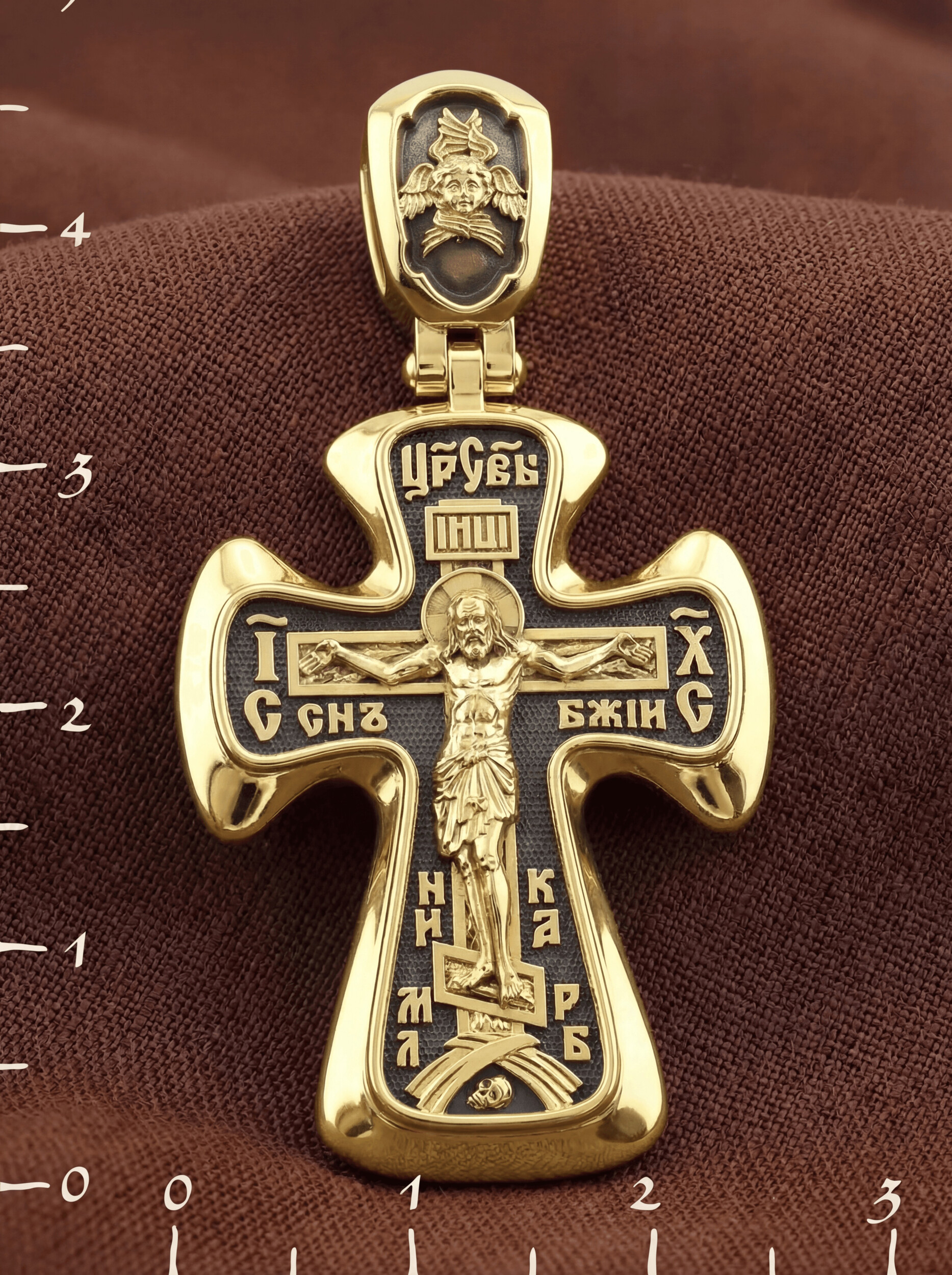На лицевой стороне креста изображено Распятие Иисуса Христа. Господь представлен свободно покоящимся на кресте с простертыми руками и как бы обнимающим всю Вселенную. Он — Спаситель, искупивший грехи мира, «поправший смертию смерть» и призывающий к Себе «все концы земли». Поэтому рядом с Его образом помещены слова — «НИКА» и «Царь Славы». Эти слова характеризуют Господа как Великого Архиерея, победителя смерти. Также Распятие сопровождается надписями, олицетворяющими Христа. Это святое имя Христа «IC» (Иисус) «ХС» (Христос), и словосочетание «СЫН БОЖИЙ».