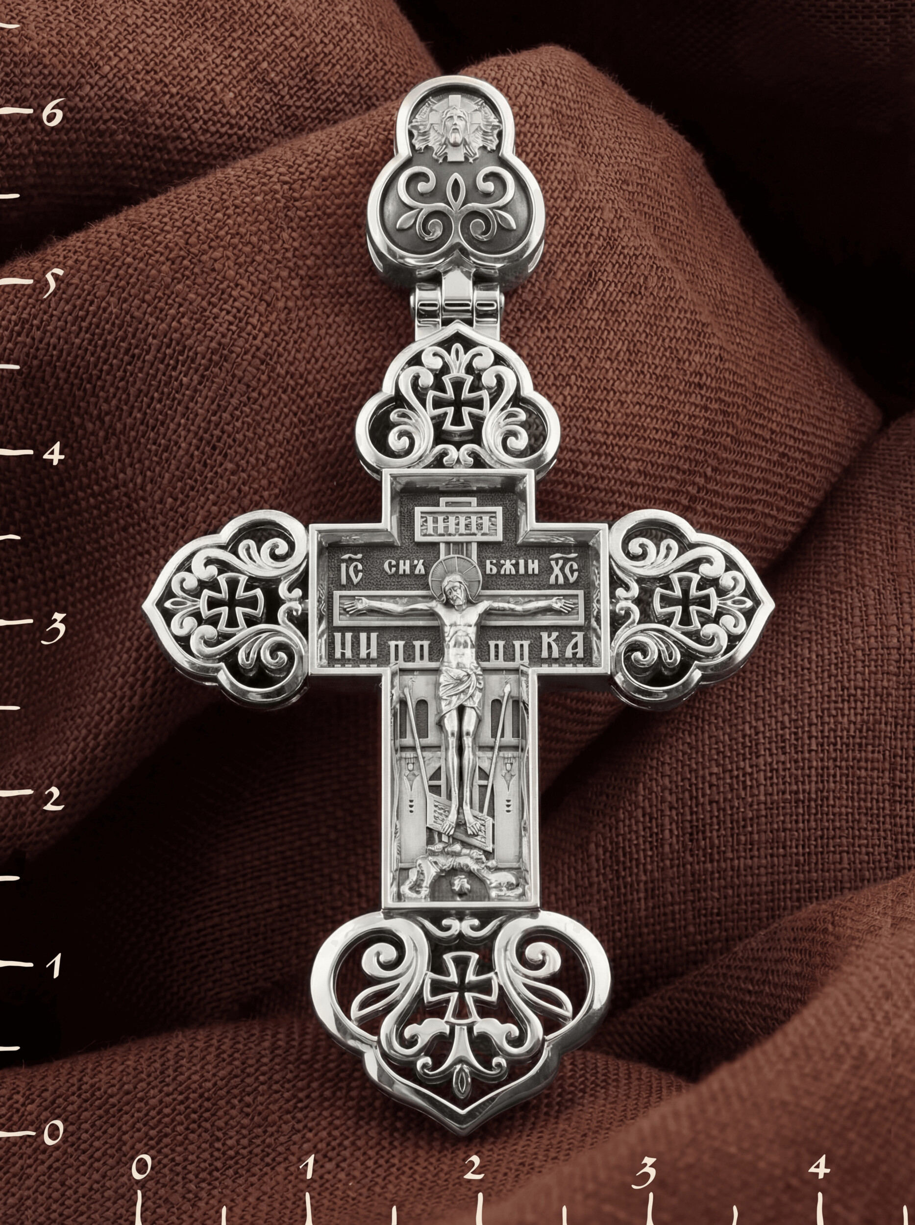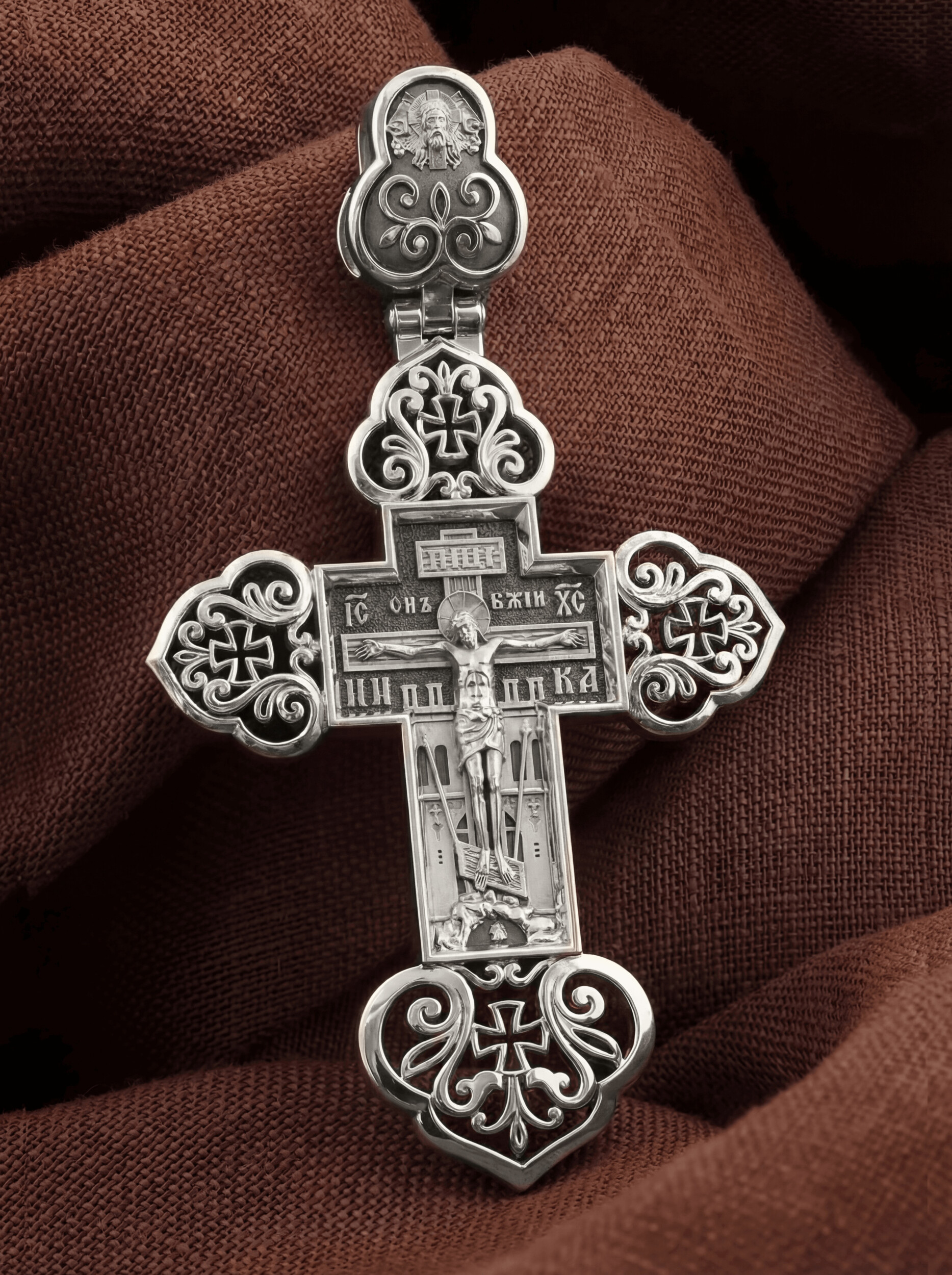 На лицевой стороне изображено Распятие. Позади Распятия видна иерусалимская стена, знак того, что Господь был распят вне стен города. Но вместе с тем стена символизирует и Небесный Иерусалим, путь который открылся для человека через Голгофу. У подножья Господа в виде скалистой горки видна сама Голгофа с Главой Адамовой в пещере. Рядом с Крестом из горы выступают орудия страданий Господа — трость и копие, обозначенные буквами Т и К. На трости стражники подали Христу пропитанную уксусом губку, когда Он жаждал воды, а копьем пронзили Ему ребра, чтобы проверить: умер ли Он?