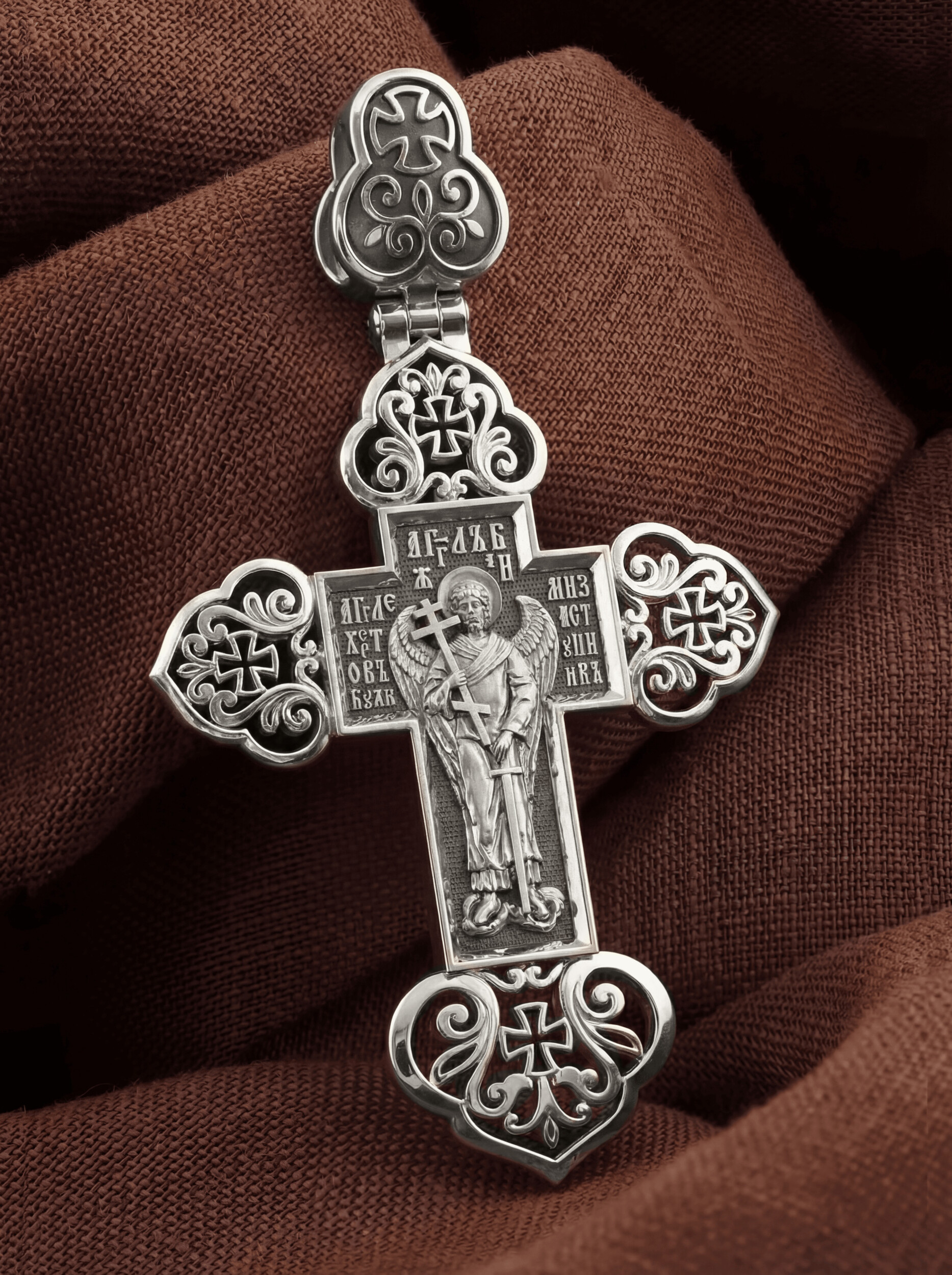 Оборотную сторону креста возглавляет Ангел Хранитель с крестом и мечом: ими он защищает человека от злых духовных и физических нападений. Ангел не может нарушить свободу воли человека, поэтому его надо молитвенно просить о помощи: «Ангеле Христов, буди ми заступник», — эта молитва написана вокруг его образа.