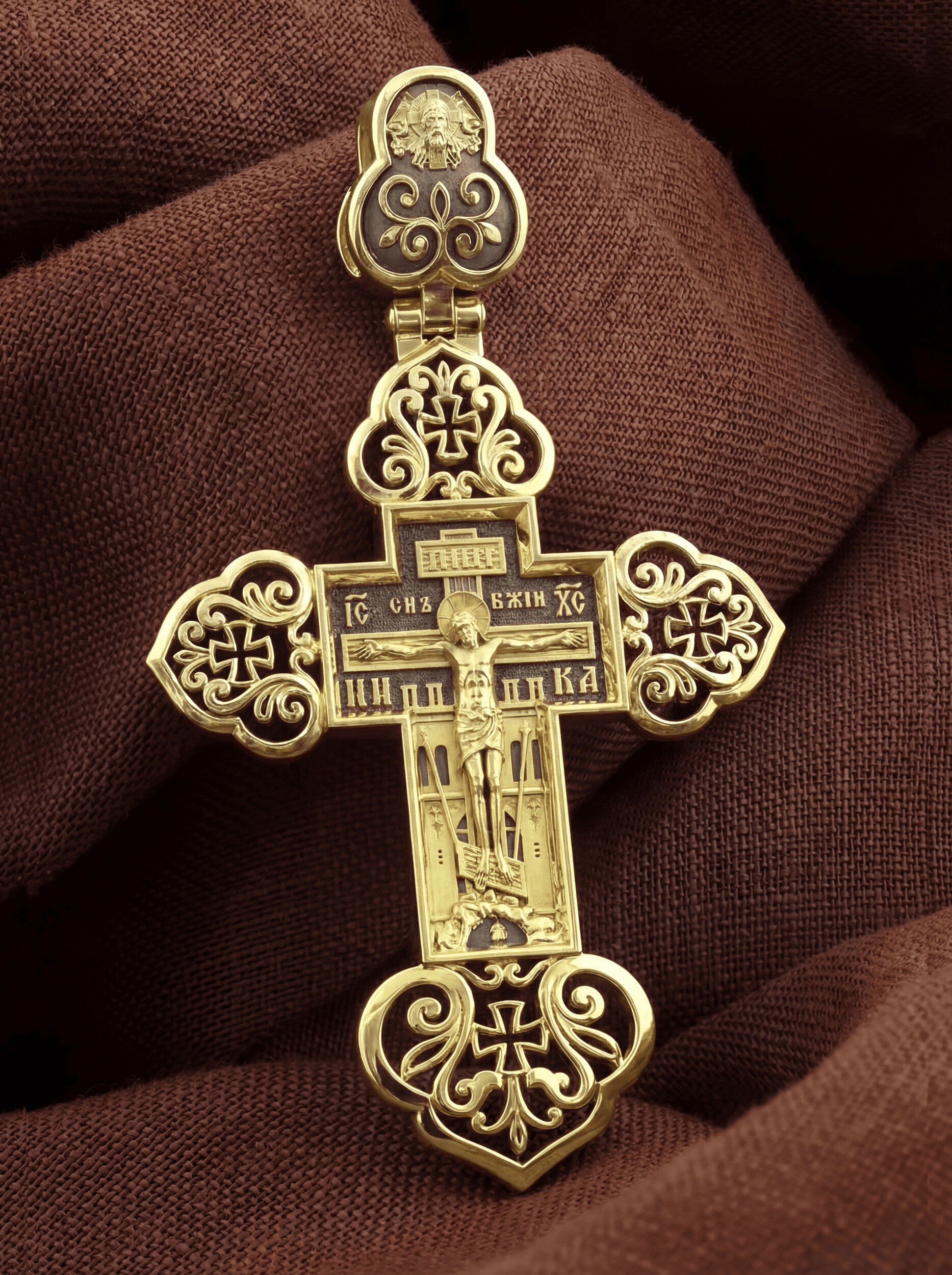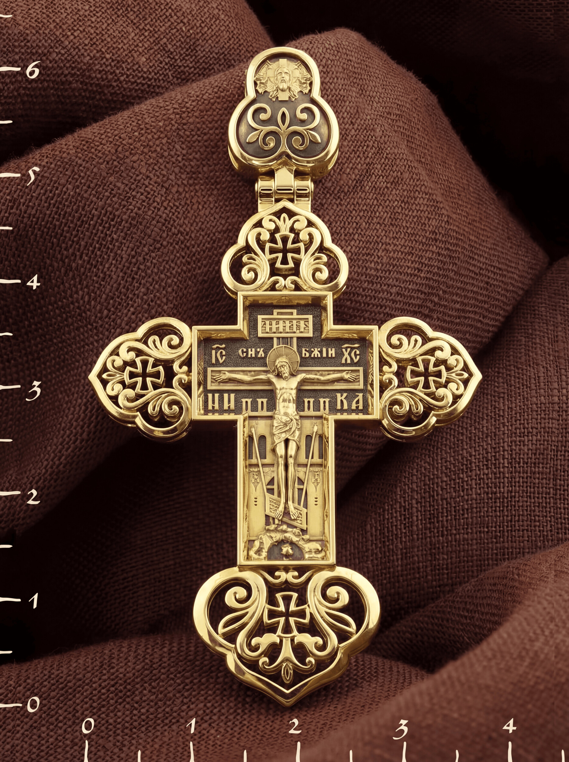 На лицевой стороне изображено Распятие. Позади Распятия видна иерусалимская стена, знак того, что Господь был распят вне стен города. Но вместе с тем стена символизирует и Небесный Иерусалим, путь который открылся для человека через Голгофу. У подножья Господа в виде скалистой горки видна сама Голгофа с Главой Адамовой в пещере. Рядом с Крестом из горы выступают орудия страданий Господа — трость и копие, обозначенные буквами Т и К. На трости стражники подали Христу пропитанную уксусом губку, когда Он жаждал воды, а копьем пронзили Ему ребра, чтобы проверить: умер ли Он?