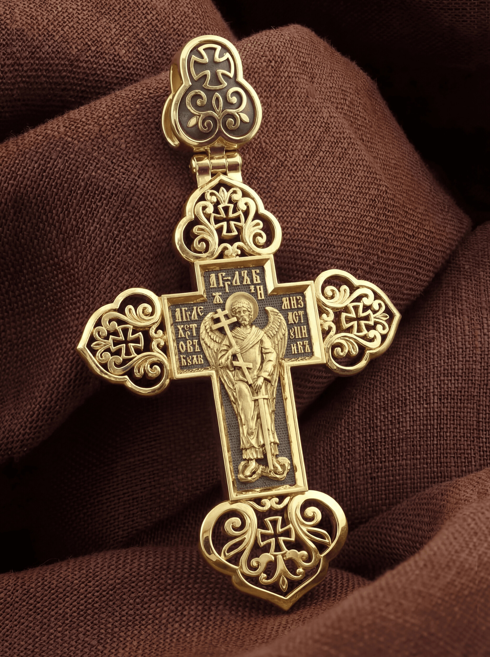 Оборотную сторону креста возглавляет Ангел Хранитель с крестом и мечом: ими он защищает человека от злых духовных и физических нападений. Ангел не может нарушить свободу воли человека, поэтому его надо молитвенно просить о помощи: «Ангеле Христов, буди ми заступник», — эта молитва написана вокруг его образа.