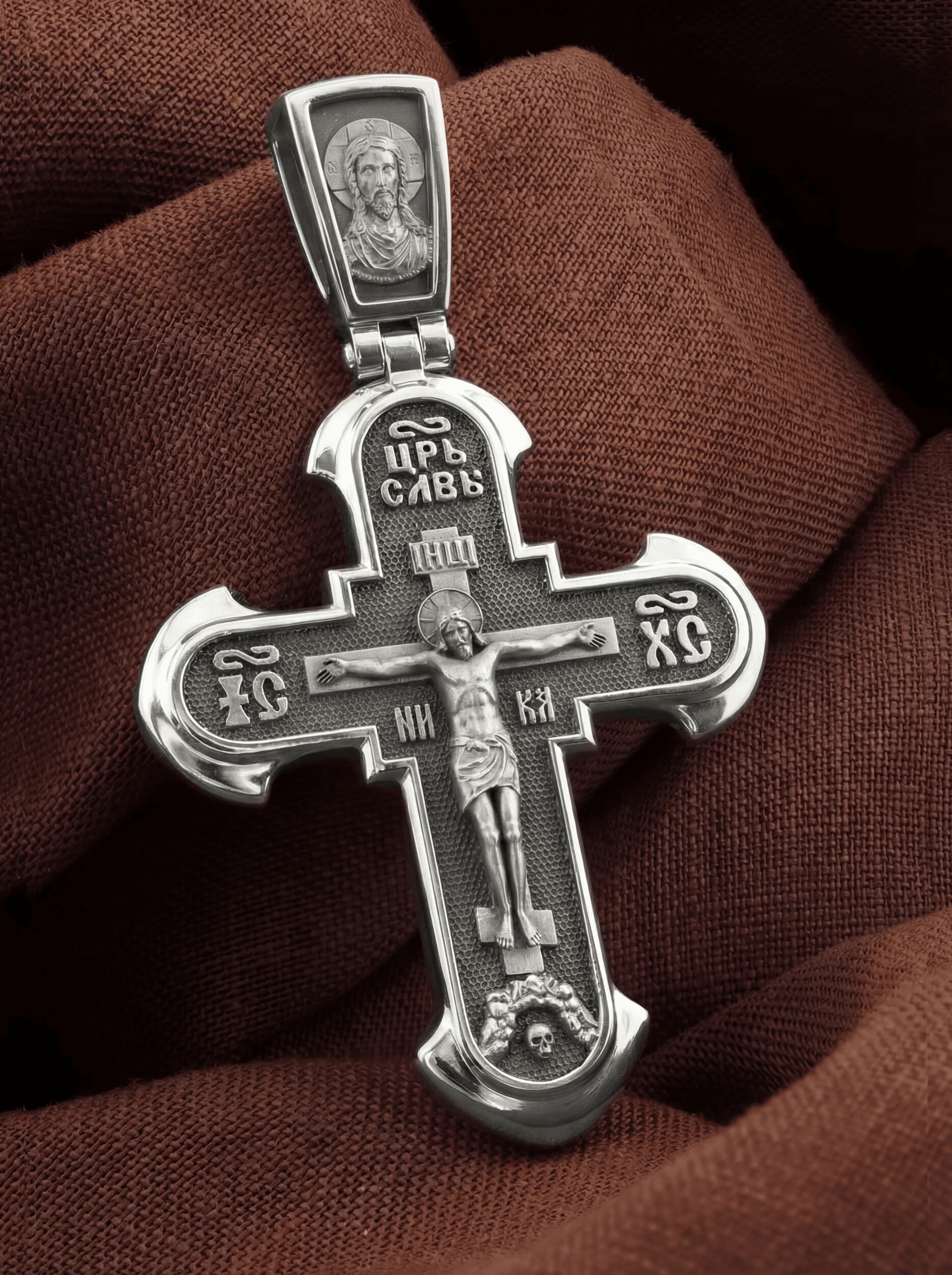 На лицевой стороне креста изображено Распятие Господа нашего Иисуса Христа. В традиции Православия — принято изображать Спасителя как Воскресшего Крестоносителя, призывающего в Свои объятия все концы мира. Его руки имеют горизонтальное положение, открытые ладони пробиты гвоздями, голова наклонена вправо, вокруг головы крестчатый нимб. Крест стоит на горе камней, символизирующих Голгофу, в основании которой различается череп. Это голова Адама. По преданию, тело Адама было погребено Симом, сыном Ноя, на месте, где впоследствии возникла гора Голгофа. Над головой Господа на поперечной перекладине аббревиатура «IНЦI», что символизирует табличку, которая была прибита к Кресту, с надписью «Иисус Назорей Царь Иудейский». Этим иудеи хотели посмеяться над Христом, не зная, что распинают истинного Царя всех царей. По бокам поперечной перекладины титлы святого имени Христа «IC» (Иисус) «ХС» (Христос), и слово «НИКА», что в переводе с греческого означает «победитель». Венчает лицевую сторону креста надпись «Царь Славы».