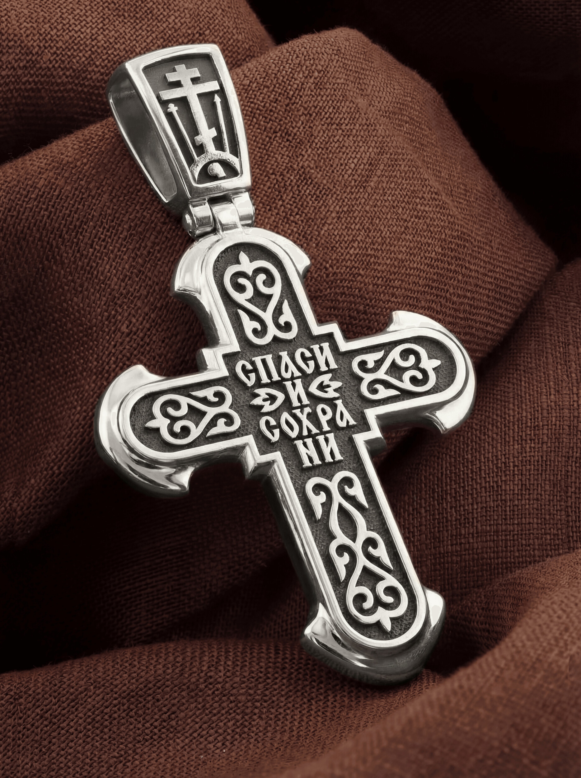Обратная сторона креста выполнена с использованием растительного орнамента. Такой крест с растительным узором вводит мотив процветшего креста и символизирует Древо Жизни. Умерев за наши грехи, Христос возродил всех для Жизни Вечной, «Смертию смерть поправ…». Своими страданиями Он искупил грехи человечества, умерев и сошествовав во ад, победил сатану, освободил души праведников от вечной смерти и открыл им небесные врата рая. Поэтому на обороте данного креста написано молитвенное славословие: «Спаси и сохрани».
