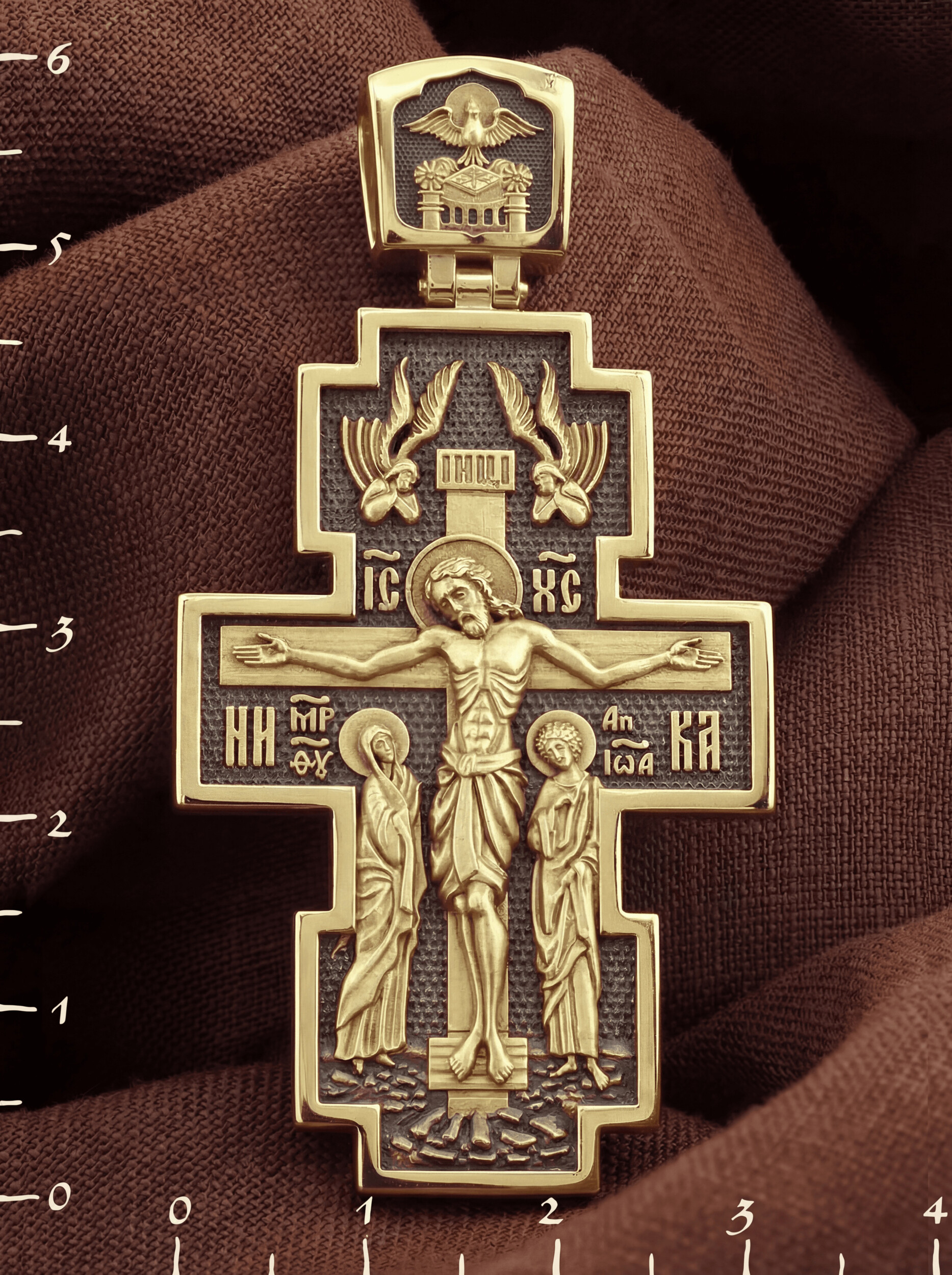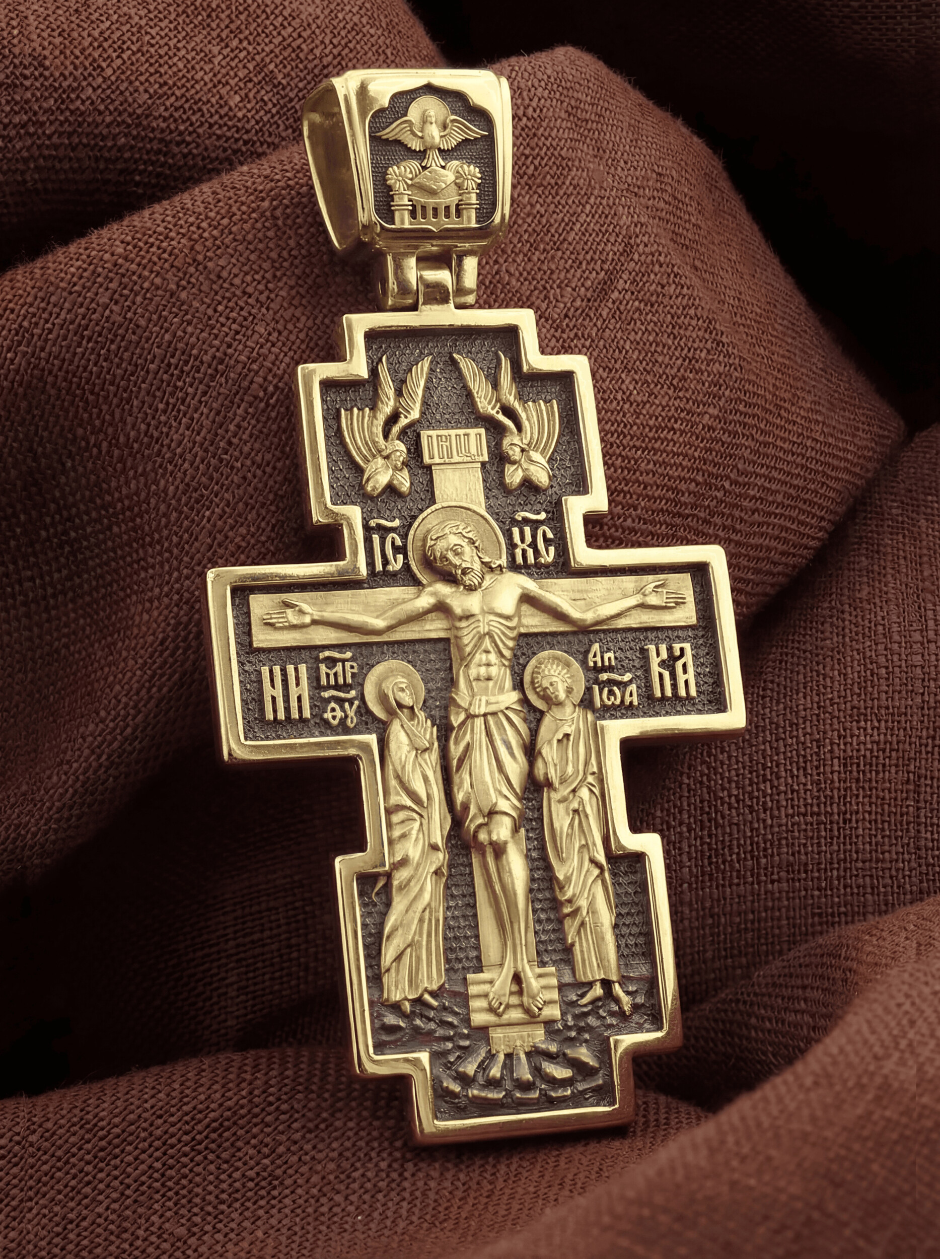 На лицевой стороне креста изображено Распятие Христово — величественный, торжественный образ христианства, знак победы над смертью. Христос, принеся Себя в Жертву на Кресте, искупил грехи всего мира и дал людям возможность обрести спасение. Слева и справа от Креста стоят Богоматерь и апостол Иоанн Богослов. По преданию, именно они до последнего не оставляли Спасителя в Его страданиях, были с Ним до самой смерти. Во главе образка изображен парящий голубь — символ Святого Духа и Его благодати. Сверху над Распятием парят Ангелы. Они изображены летящими с Небес вниз, к Кресту. Ангелы словно поддерживают табличку над головой Спасителя, на которой написано IНЦИ — «Иисус Назарянин Царь Иудейский». Эта табличка — титло — была приколочена римскими палачами как указание на «вину» Христа, то, за что Он был казнен.