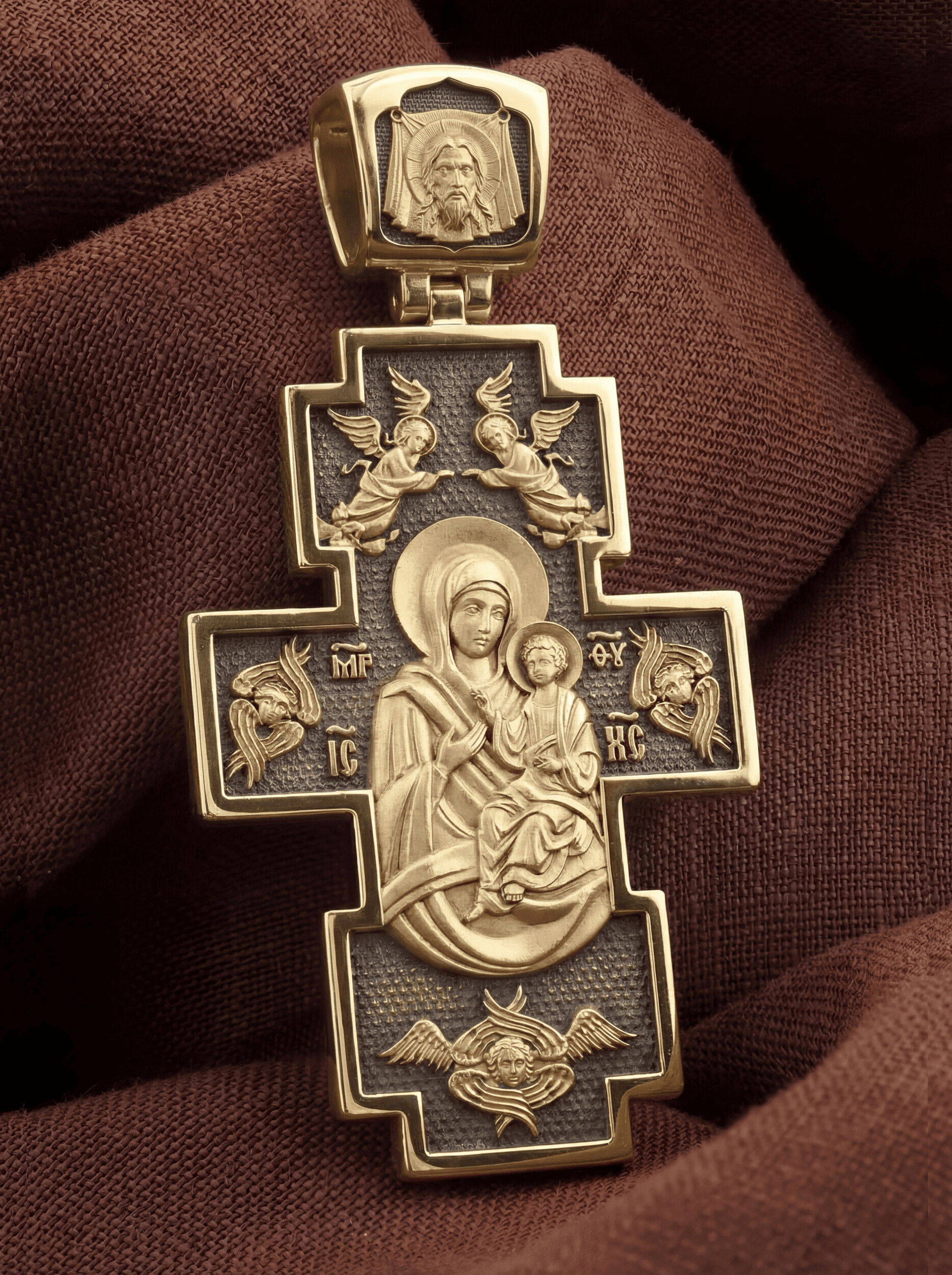 На обороте креста помещена величайшая святыня России, самая любимая и почитаемая верующими икона Пресвятой Богородицы — Казанская. С двух сторон от образа Казанской Божьей Матери расположены херувимы, под образом — серафим. Серафимы и херувимы — высшие ангелы, ближе всех Небесных Сил предстоящие Божественному Престолу.