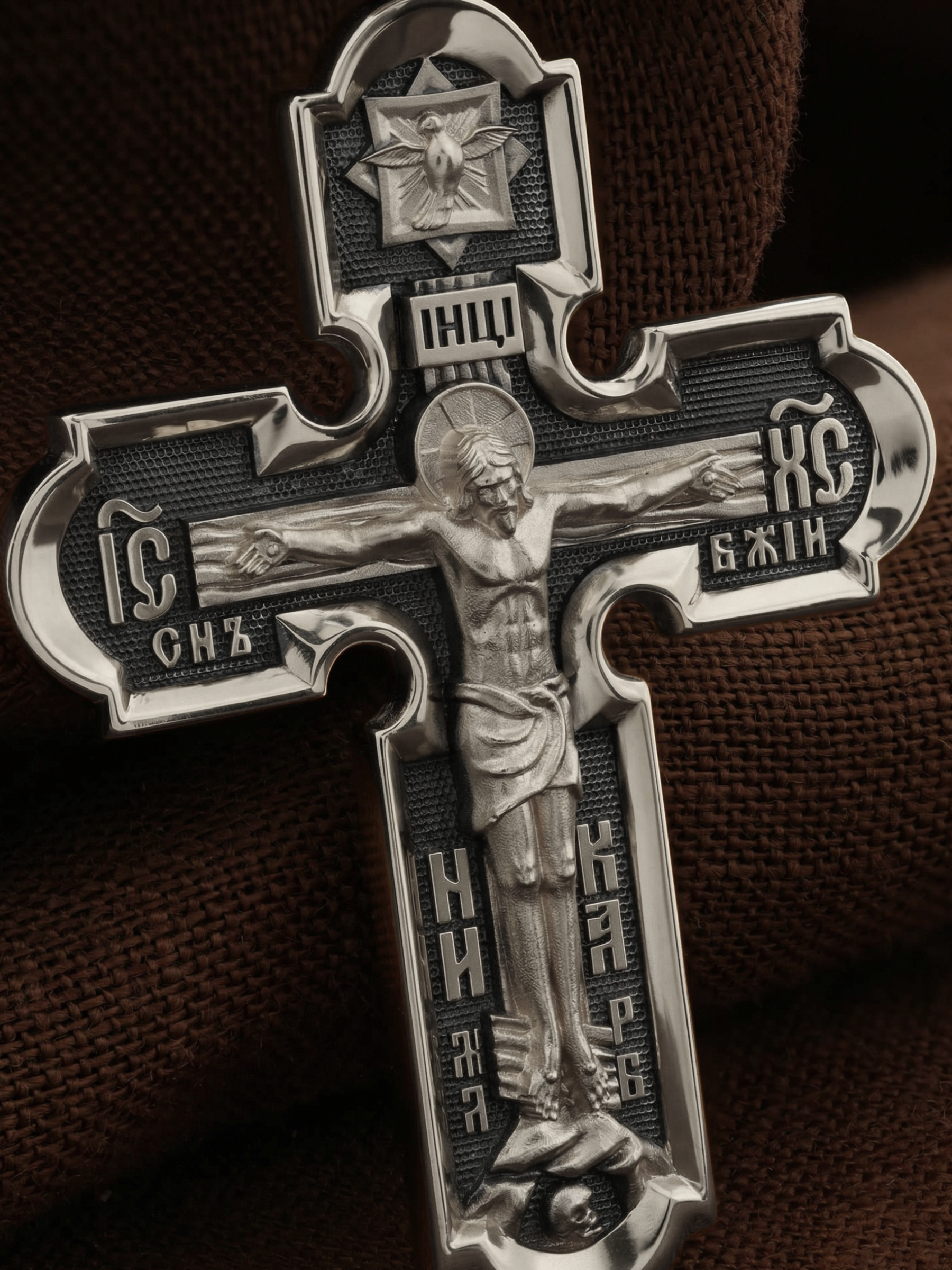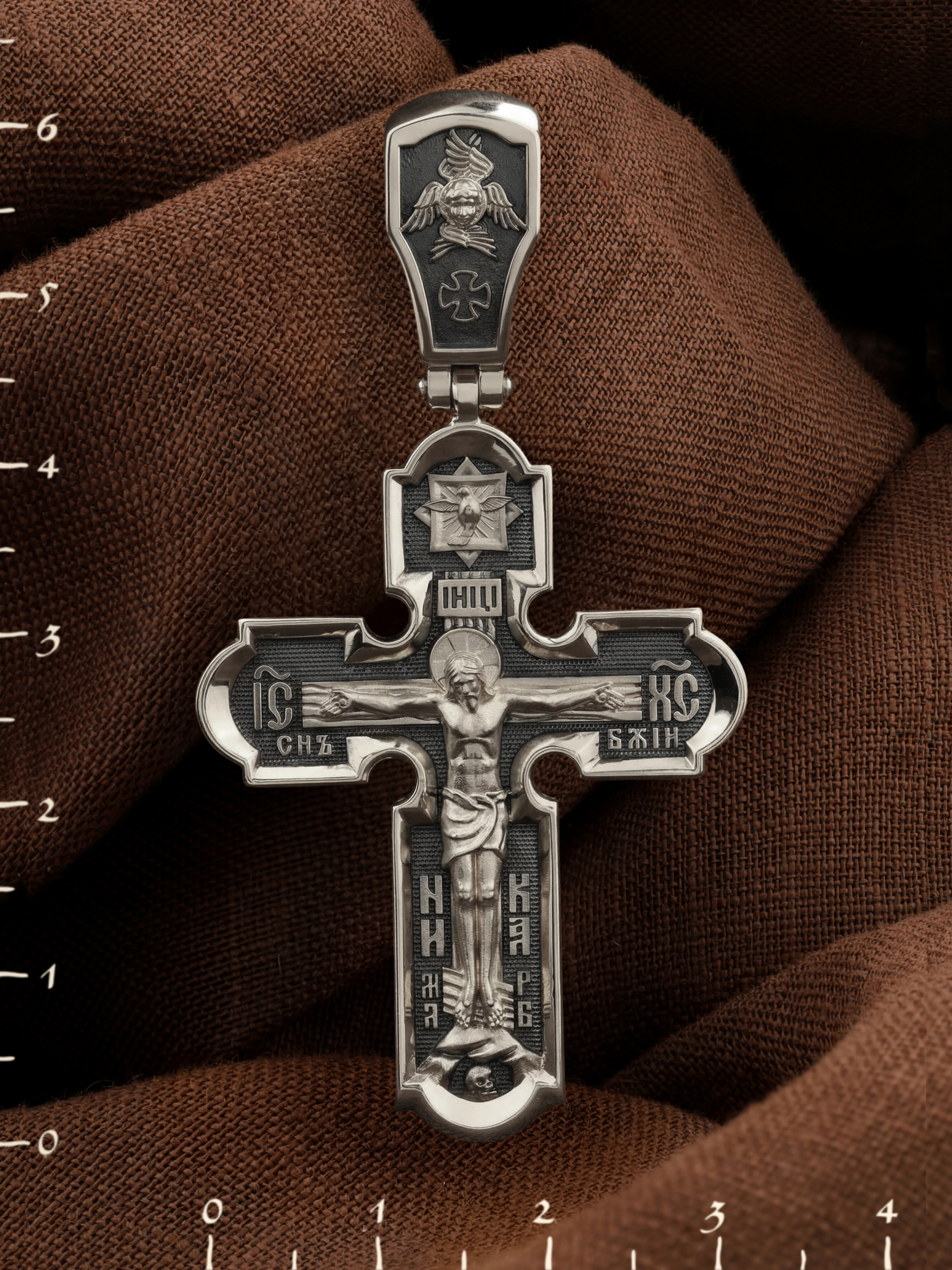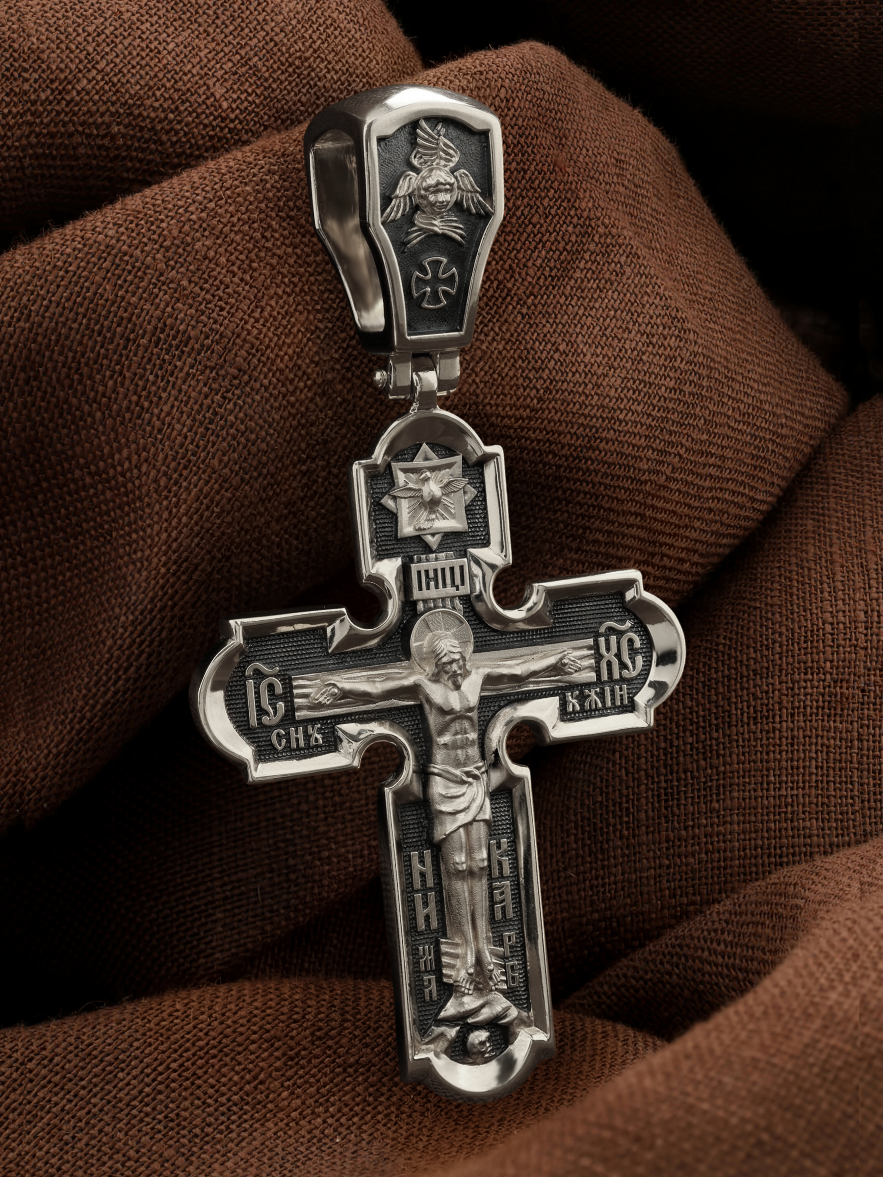 На лицевой стороне креста изображено Распятие Иисуса Христа. Господь представлен свободно покоящимся на кресте с простертыми руками и как бы обнимающим всю Вселенную. Он — Спаситель, искупивший грехи мира, «поправший смертию смерть» и призывающий к Себе «все концы земли». Поэтому рядом с Его образом помещены слова — «НИКА» и «Царь Славы». Эти слова характеризуют Господа как Великого Архиерея, победителя смерти. Верхняя перекладина символизирует титло — табличку, на которой, согласно Евангелию, было начертано: Иисус Назорей Царь Иудейский (IНЦI). Также Распятие сопровождается надписями, олицетворяющими Христа. Это святое имя Христа «IC» (Иисус) «ХС» (Христос), и словосочетание «СЫН БОЖИЙ». Крест стоит на горе камней, символизирующих Голгофу, в основании которой различается череп. Это голова Адама. На кулонном кольце помещено изображение серафима.