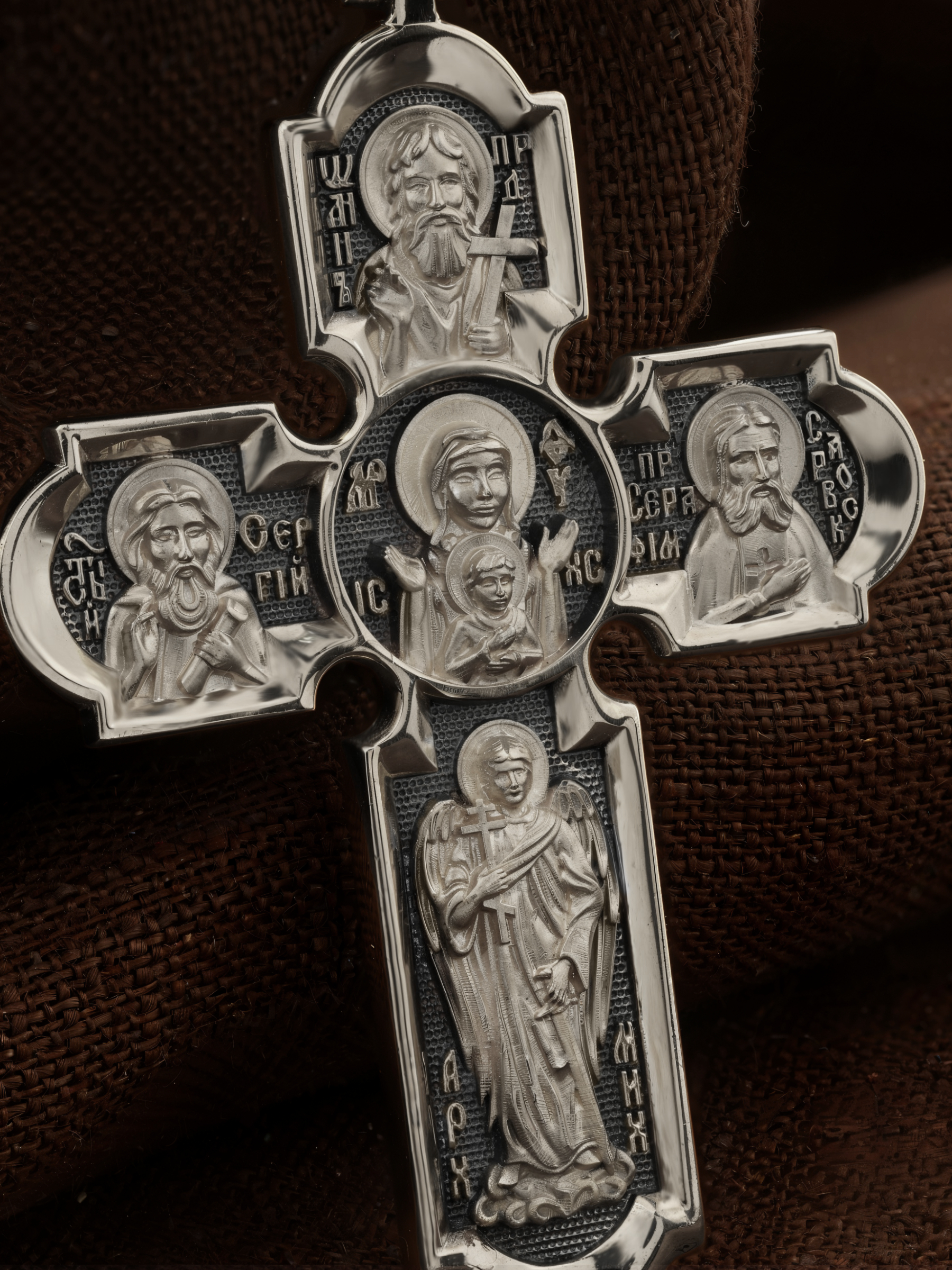 Центральную часть оборота креста украшает икона Божией Матери «Знамение». Икона «Знамение» написана по пророчеству пророка Исайи, предрекшего, что Господь Иисус Христос родится от Девы. На кресте внизу изображен Архангел Михаил, слева — прп. Сергий Радонежский, справа — образ Преподобного Серафима Саровского, вверху — последний пророк, почитающийся в христианстве, Предтеча Господень Иоанн Креститель. На кулонном кольце помещено изображение Спаса Нерукотворного — образ Спасителя, который Он запечатлел на плате и передал для исцеления больному проказой царю Эдессы. Ему придается победное и защитное значение.